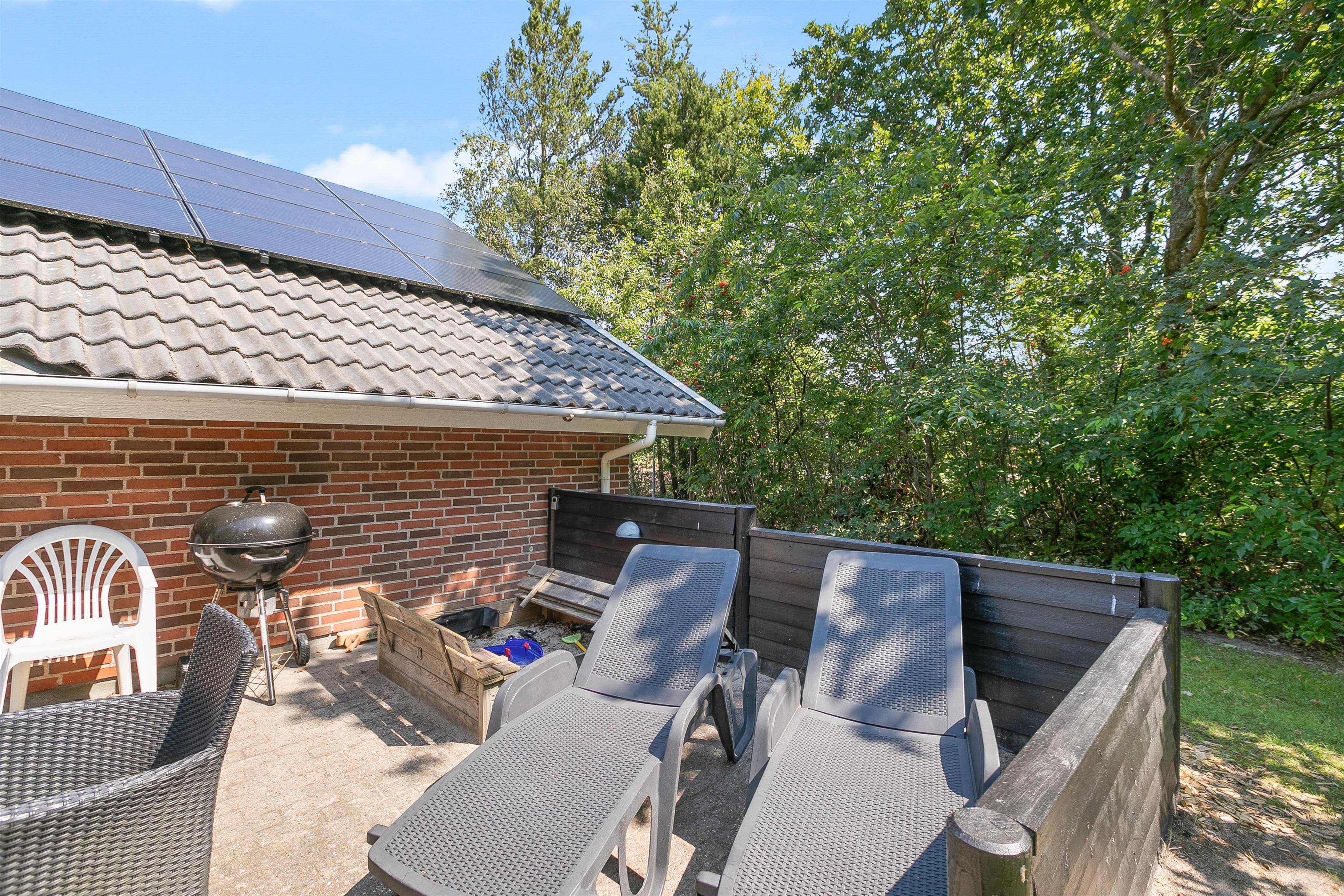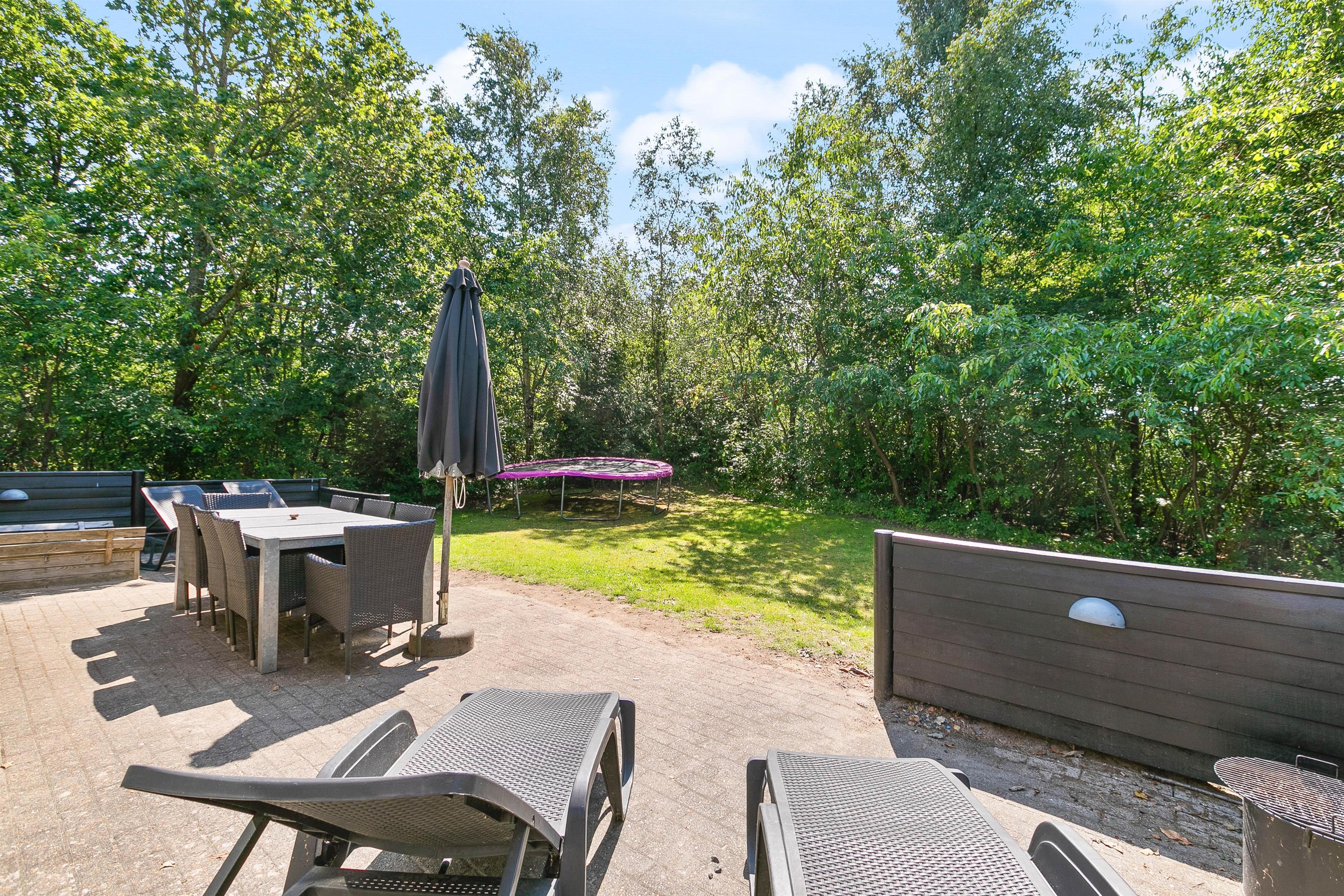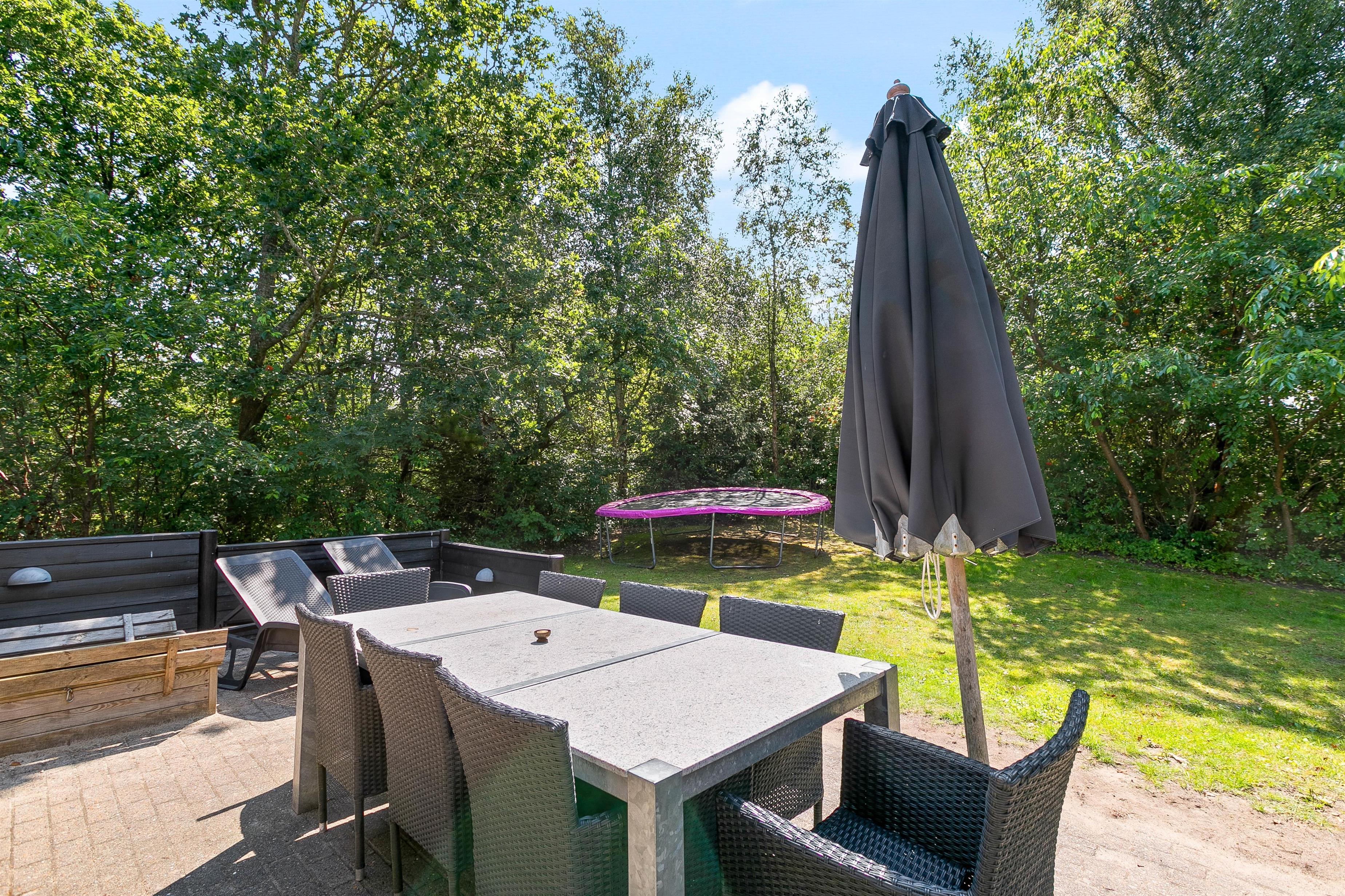 Udendørsfaciliteterne er også perfekte til børnene. Der er både gynge, sandkasse og trampolin på den store plænegrund, så de små aldrig keder sig. På terrassen rundt om sommerhuset står komfortable havemøbler og grill klar, ideelle til hyggelige grillaftener.