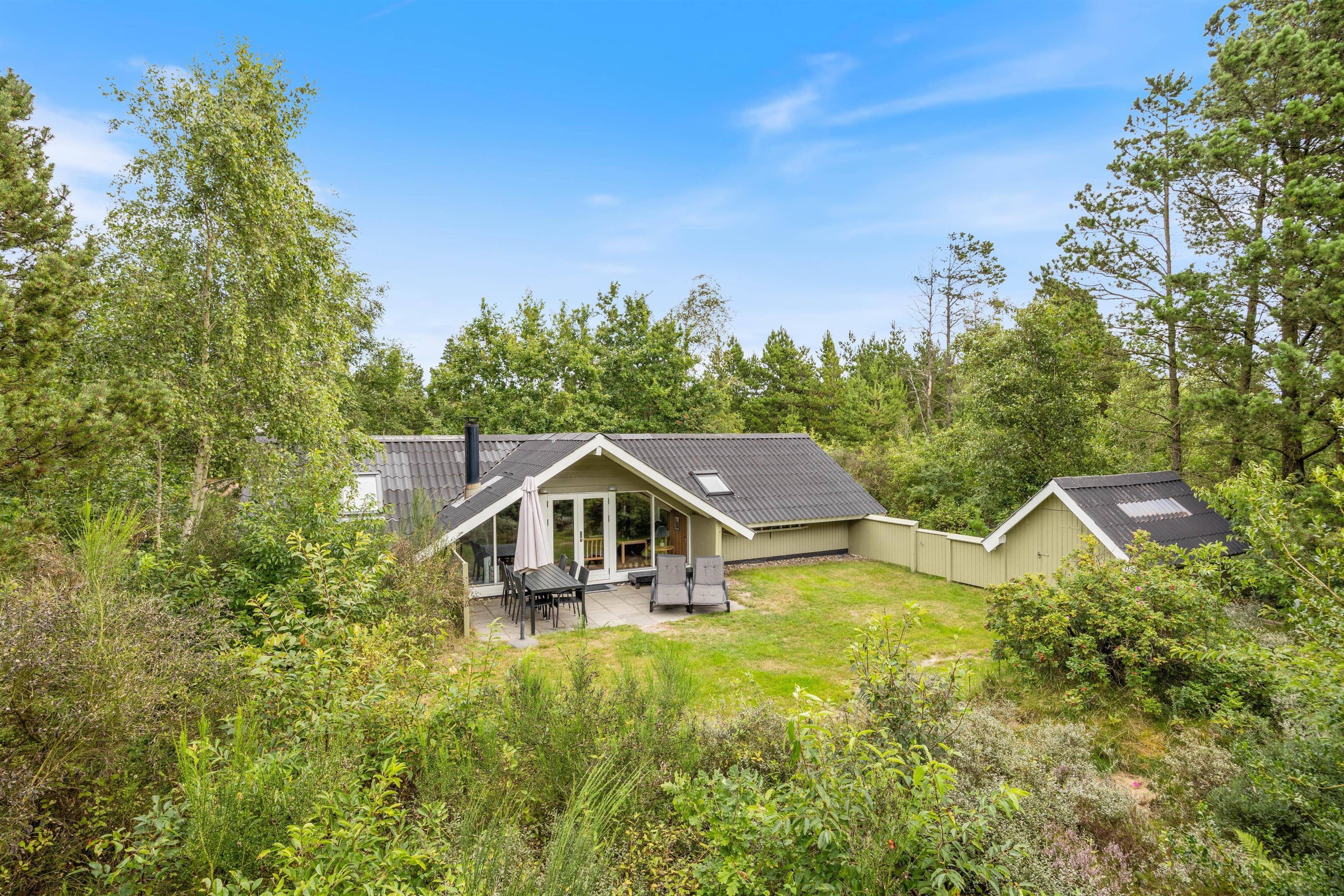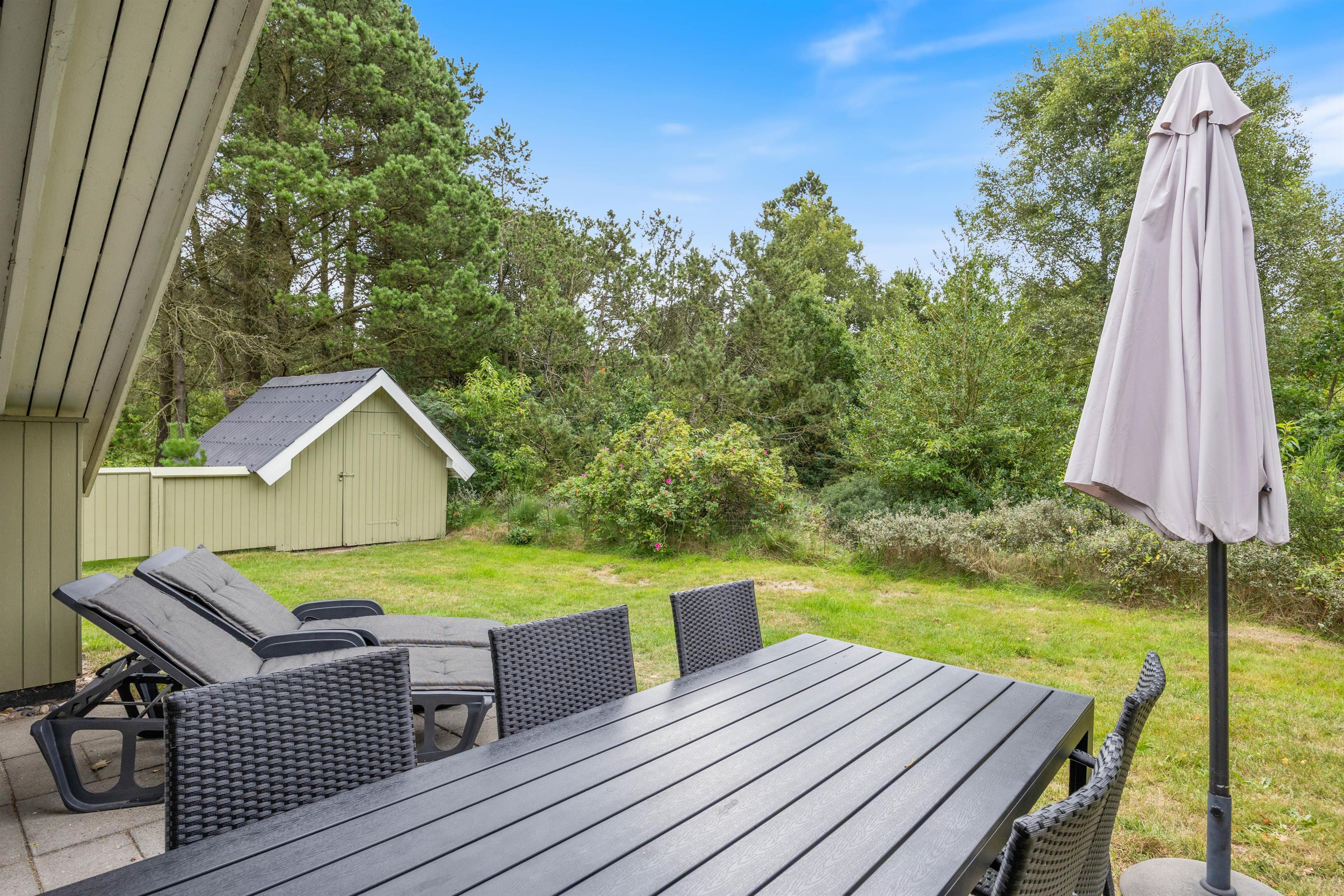 Vestkystens friske luft kan nydes på den store åbne terrasse, komplet med komfortable havemøbler og grill til skønne udendørs måltider. Sommerhusets overdækkede terrasse kan give skygge på solrige dage eller ly mod let regn. Sommerhuset ligger på en skøn naturgrund, hvor jeres firbenede venners selskab er velkomment, dog maksimalt to husdyr.