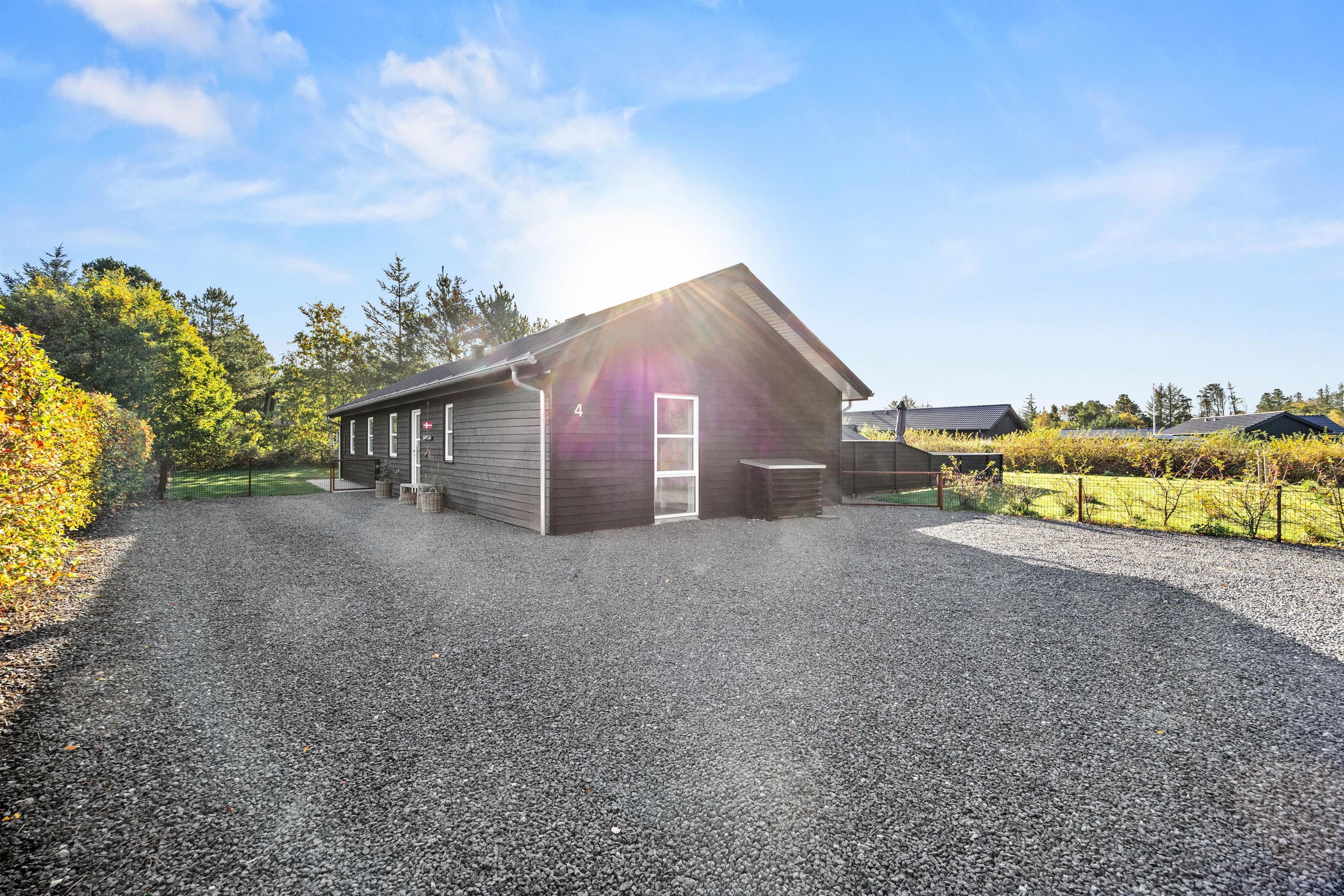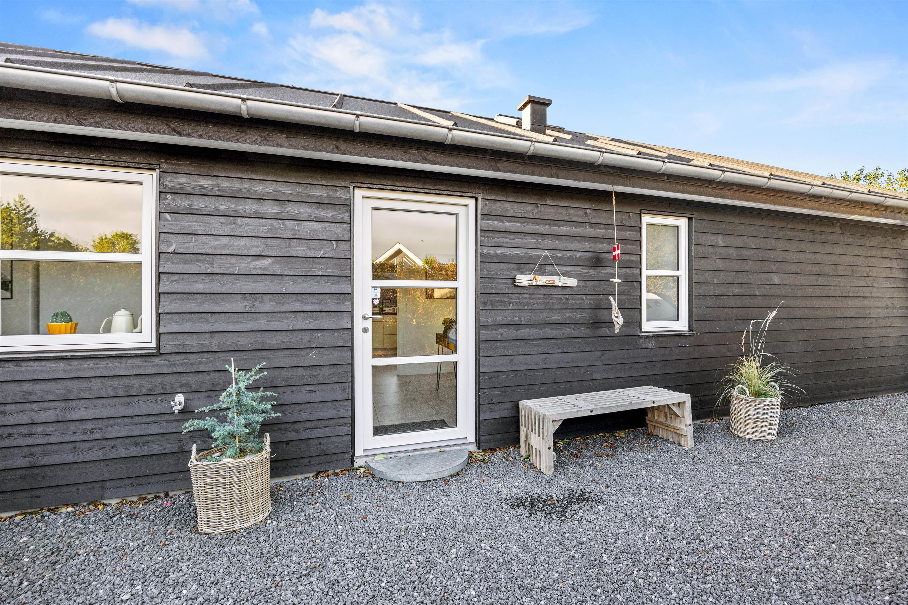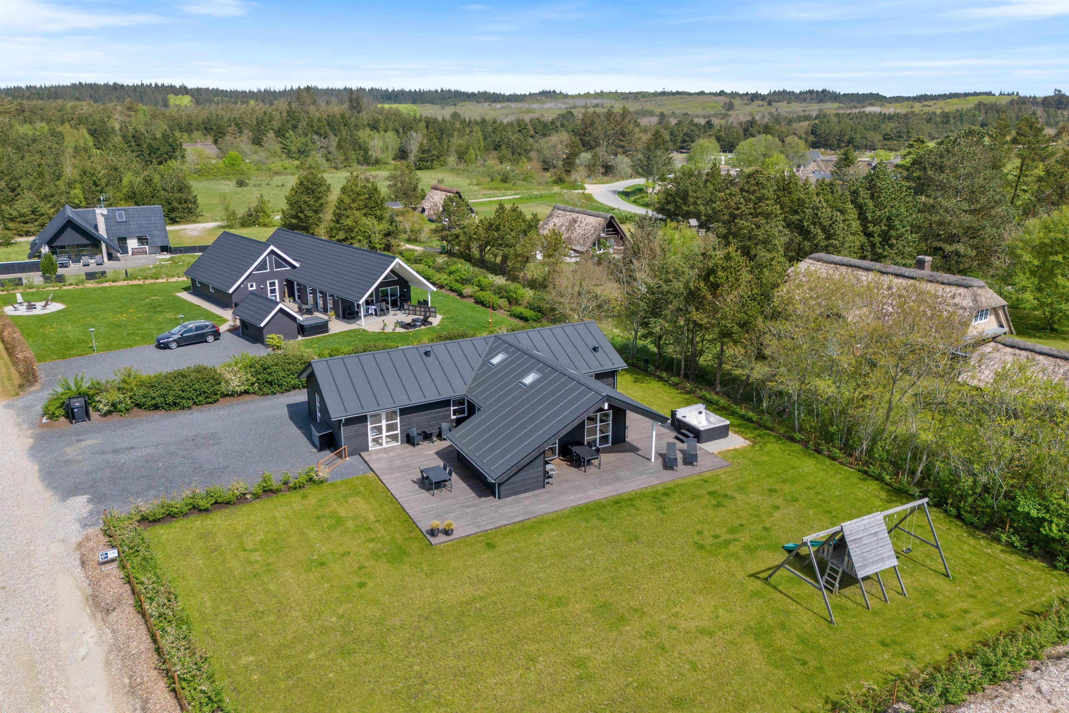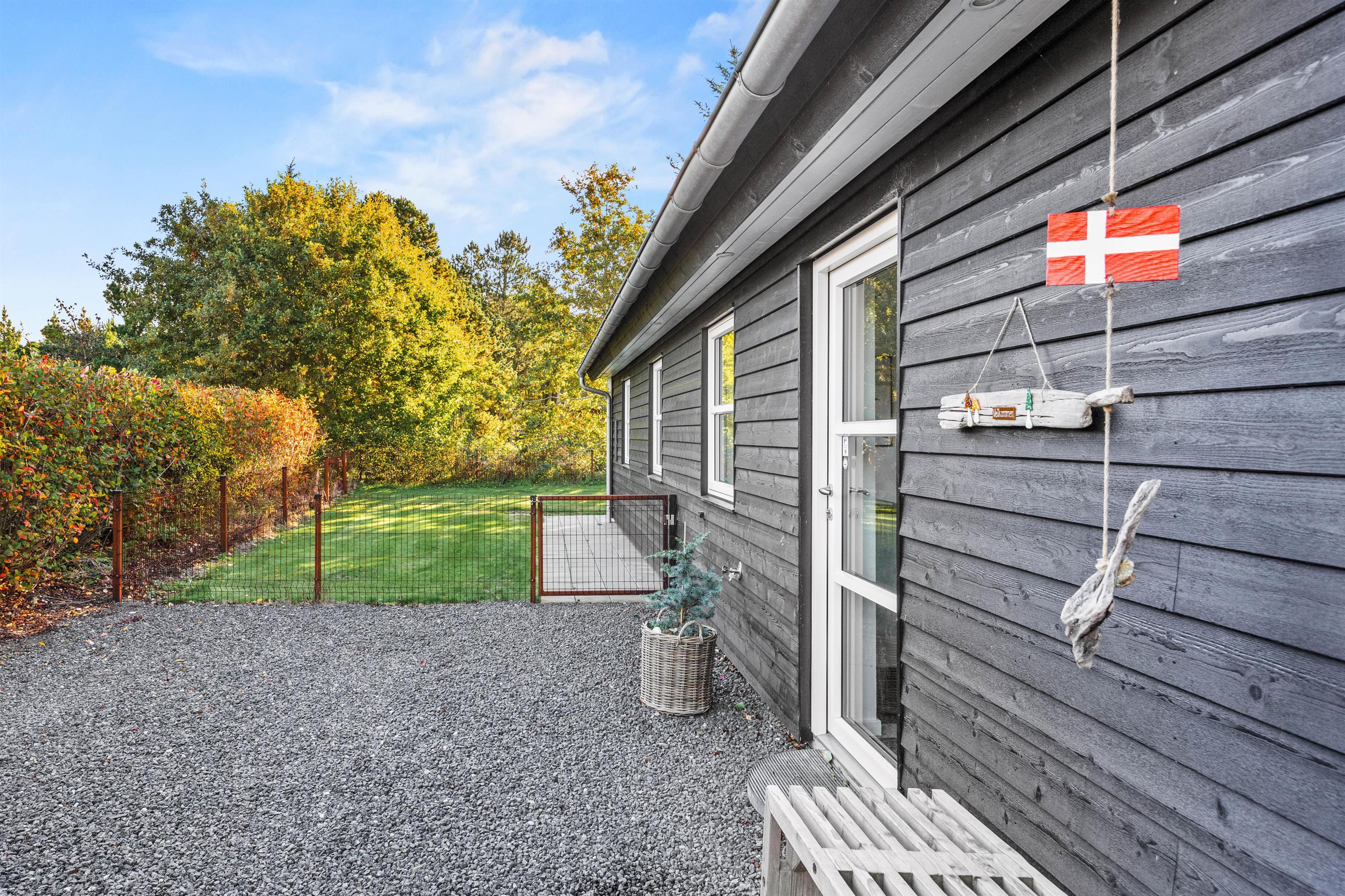 Det sorte træsommerhus ligger på en knap 1600 m2 indhegnet grund, hvoraf en stor del er dækket af græsplæne. Her er plads til fodboldspil, kongespil, picnic og hvad I ellers kan finde på af sjove ideer. På gyngestativet med rutsjebane kan børnene lege. Her i haven kan hunden også boltre sig og løbe frit rundt, samtidig med I sagtens kan lave noget andet.