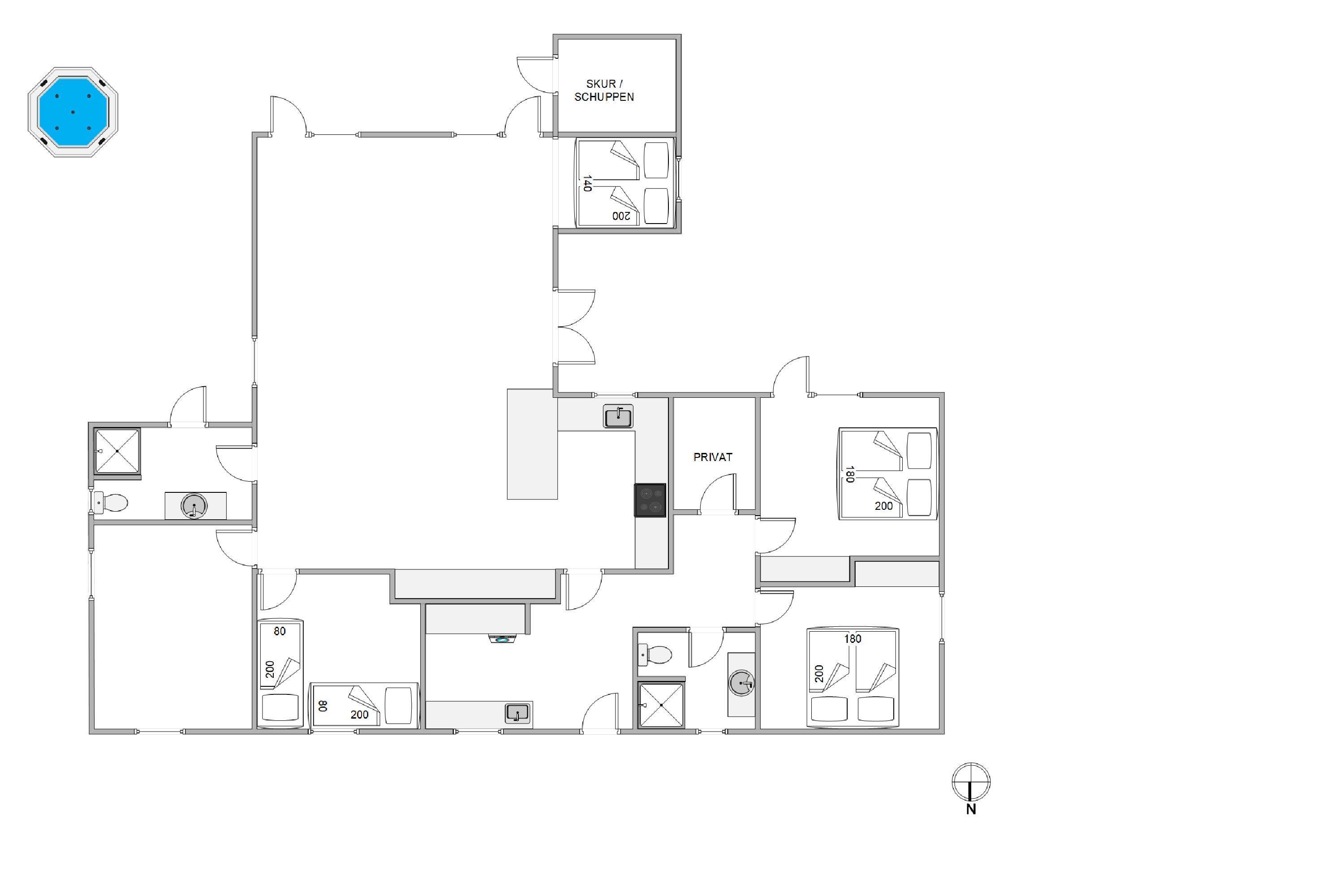 I resten af sommerhuset finder I 4 værelser med sovepladser. På 2 af værelserne finder I en dobbeltseng, på det tredje værelse 2 enkeltmandssenge og på det sidste værelse en sovesofa samt en skøn hems. Planløsningen byder derover på 2 badeværelser og en stor entré med vaskemaskine og tørretumbler. Hele feriehuset har klinkegulve og gulvvarme samt en varmepumpe, der sørger for en behagelig temperatur.