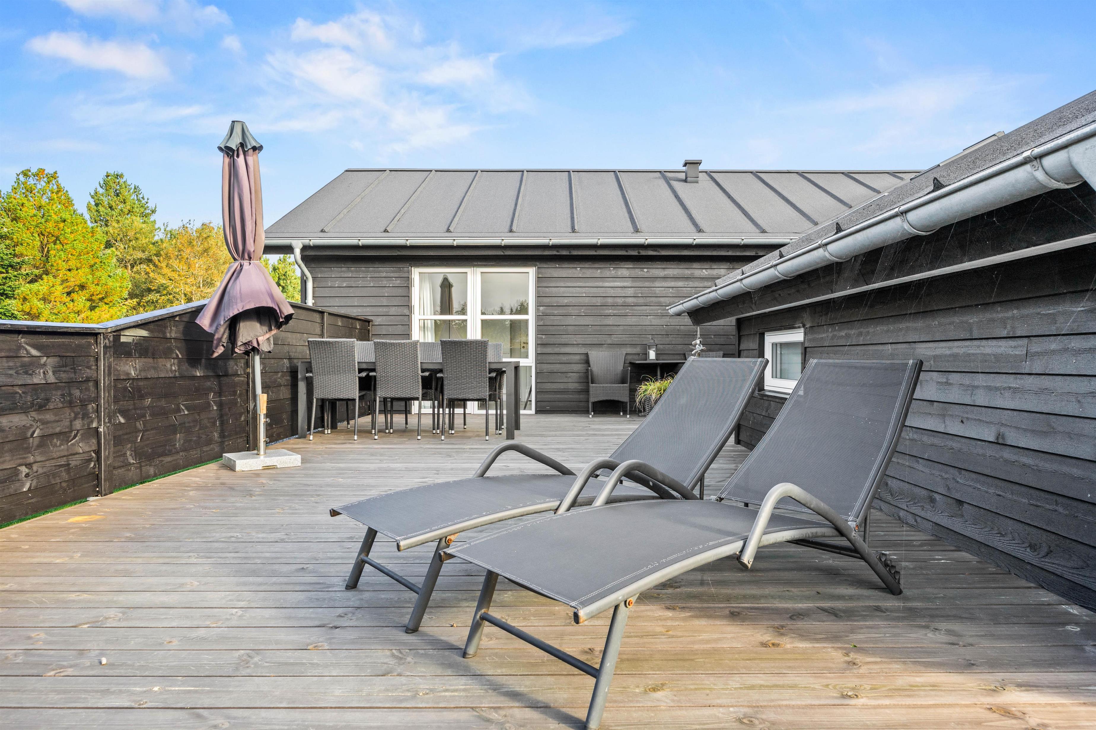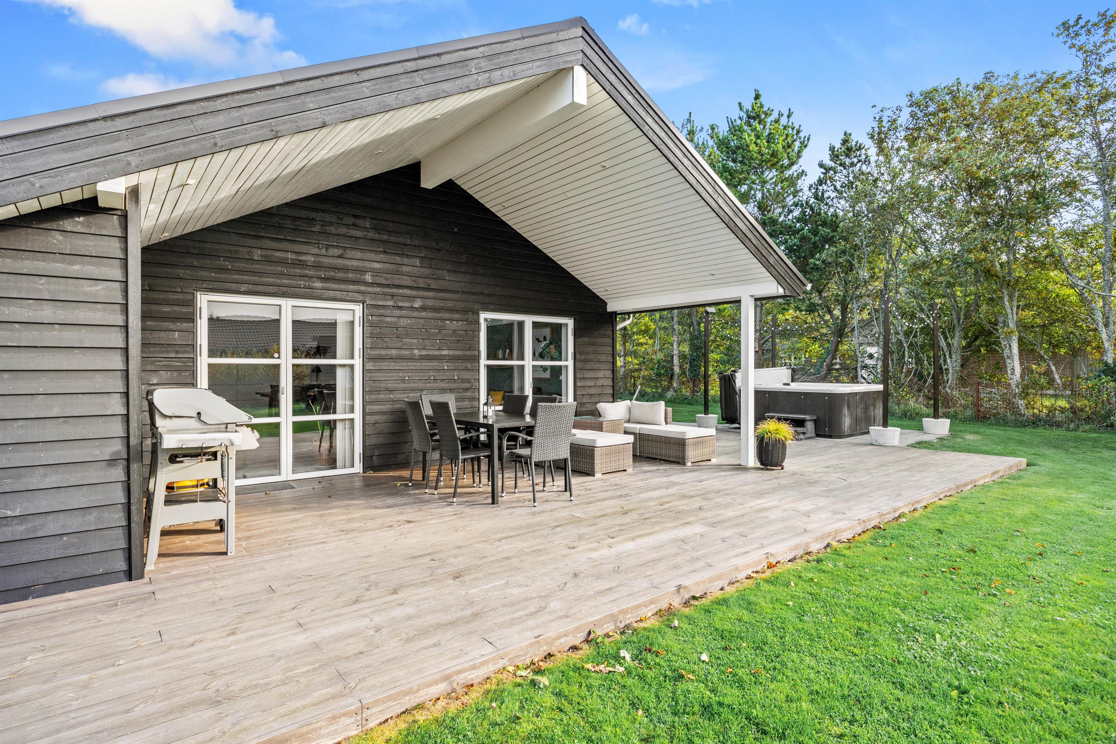 Rundt om sommerhusets sydlige ende har ferieboligen en dejlig stor træterrasse, hvor I kan sidde og nyde skyggen under halvtaget eller aftensmaden, som måske er blevet tilberedt på gasgrillen.