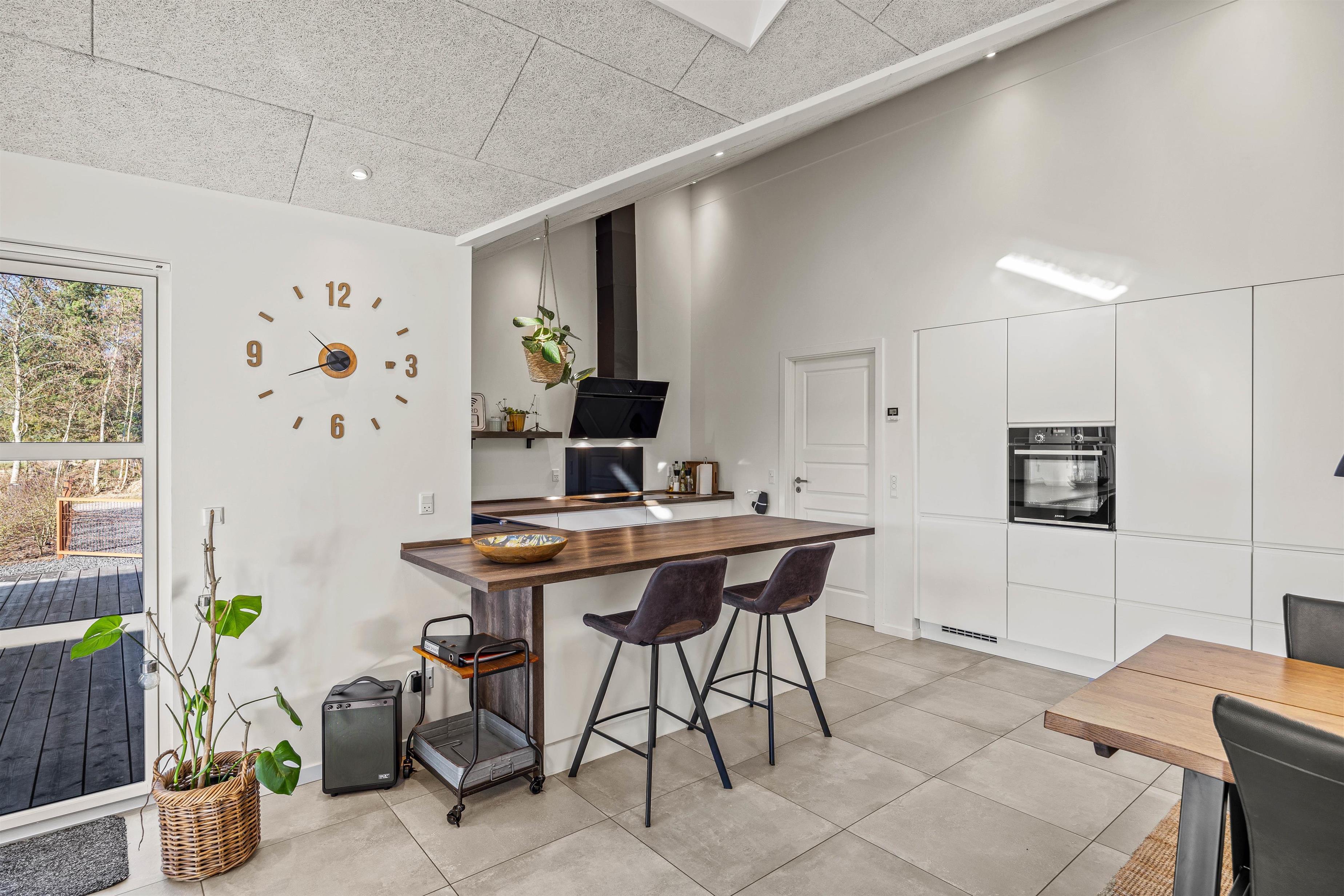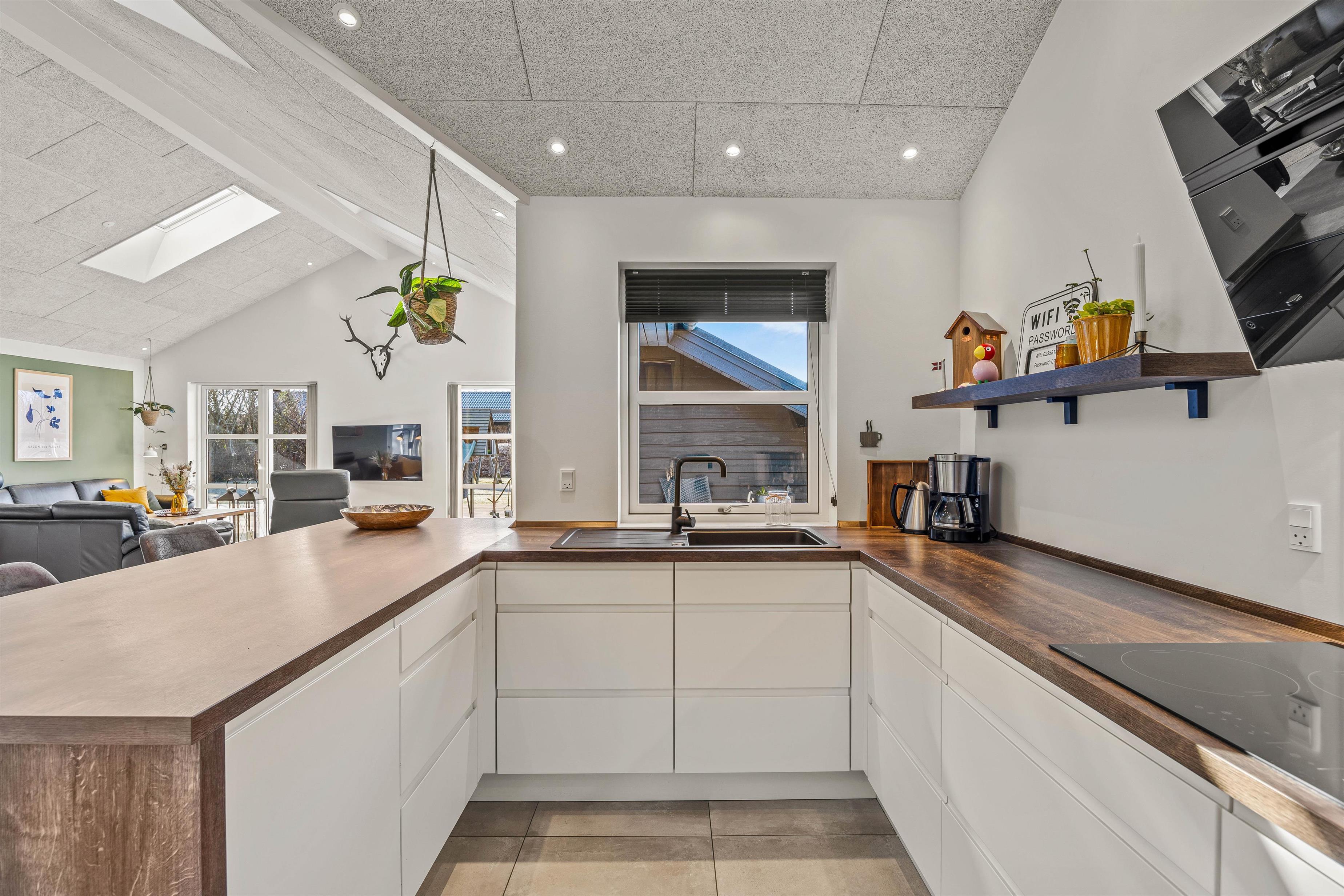 Duevej 4 har plads til 8 feriegæster samt 2 kæledyr, og her vil I helt sikkert finde jer godt til rette. Sommerhuset er dejlig lyst og hjemligt med rolige, neutrale farver og trænuancer. Her er højt til loftet og loft i kip, hvormed sommerhuset føles luftigt og stort. Hjerterummet er det store køkkenalrum, hvor I kan være sammen om at lave mad, se jeres yndlingsprogram i fjernsynet eller spille brætspil. Udover den dejlige sofa, hvor I har lyst til at slå benene op, finder I også en alkove med to sovepladser – dette vil helt sikkert være et hit hos børnene, der nærmest kan få lov til at bo i deres egen lille hule.
