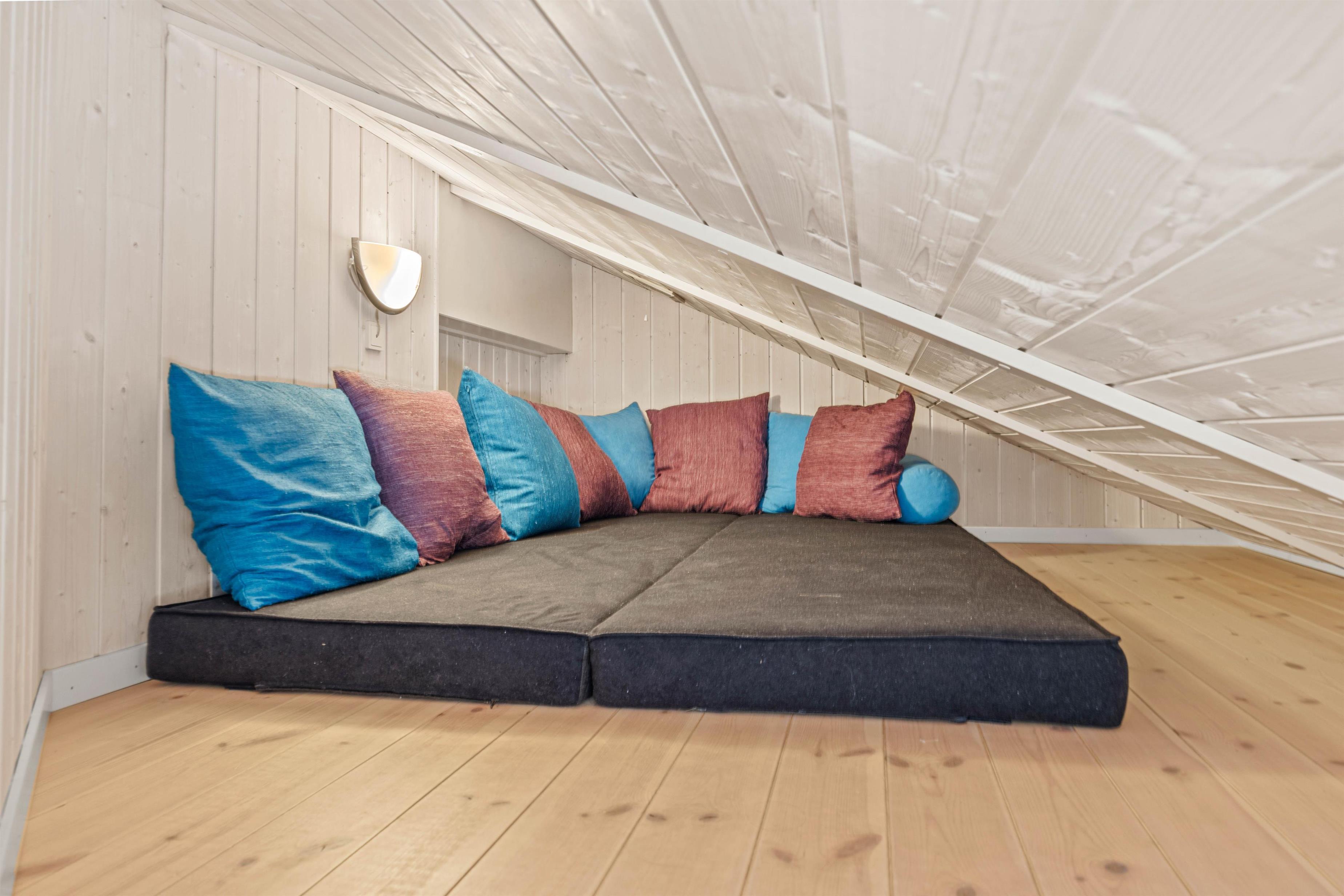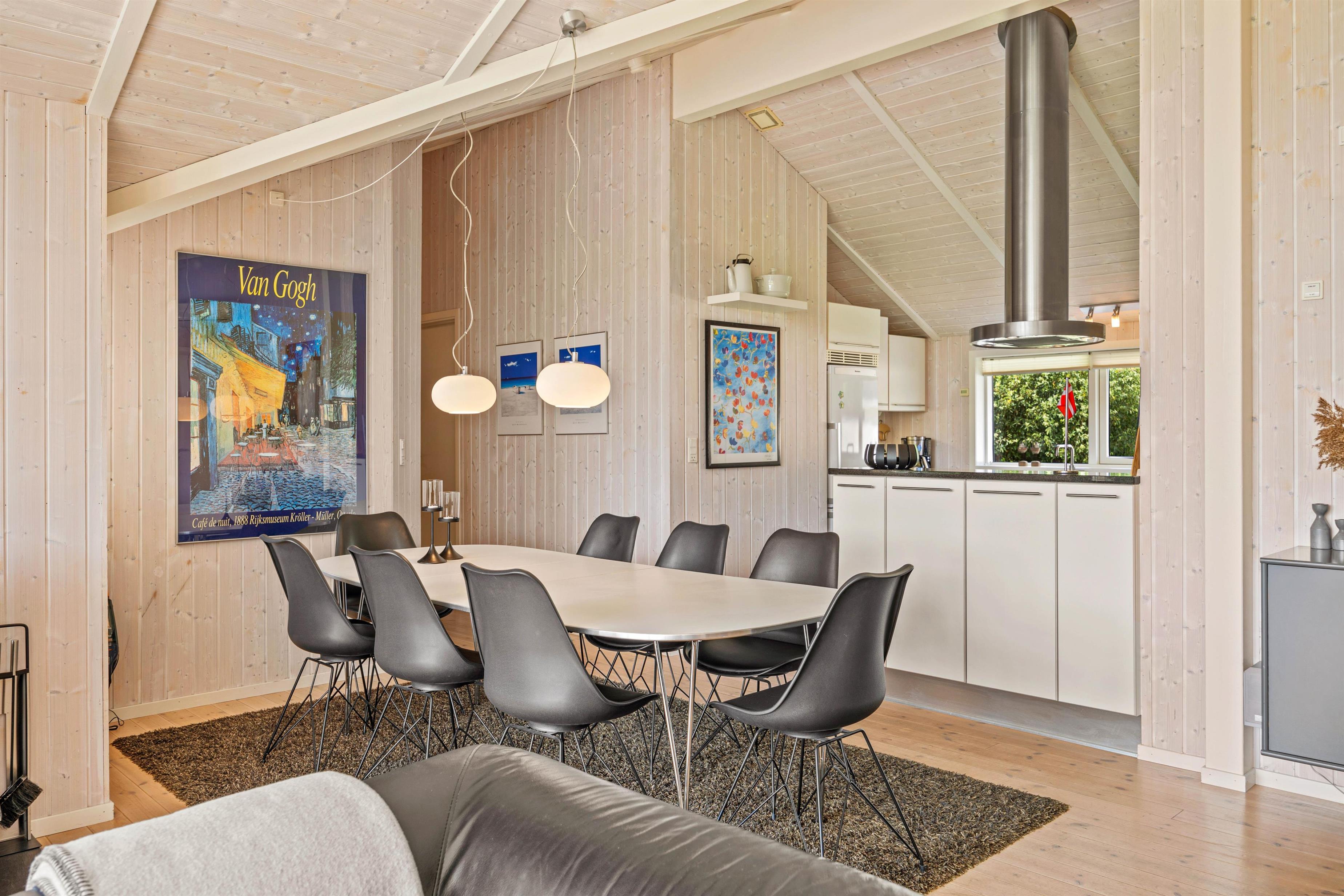 Sommerhusets smagsfulde og hjemlige indretning, de lyse farver på vægge og højt til loftet gør at sommerhuset føles ekstra rummeligt. Opholdsrummet er sommerhusets hjerte og danner rammen for hygge og samvær. Brændeovnen skaber en hyggelig atmosfære på kølige aftener, mens den energibesparende varmepumpe sikrer, at indeklimaet er behageligt året rundt. De store vinduespartie giver et skønt lysindfald til rummet.