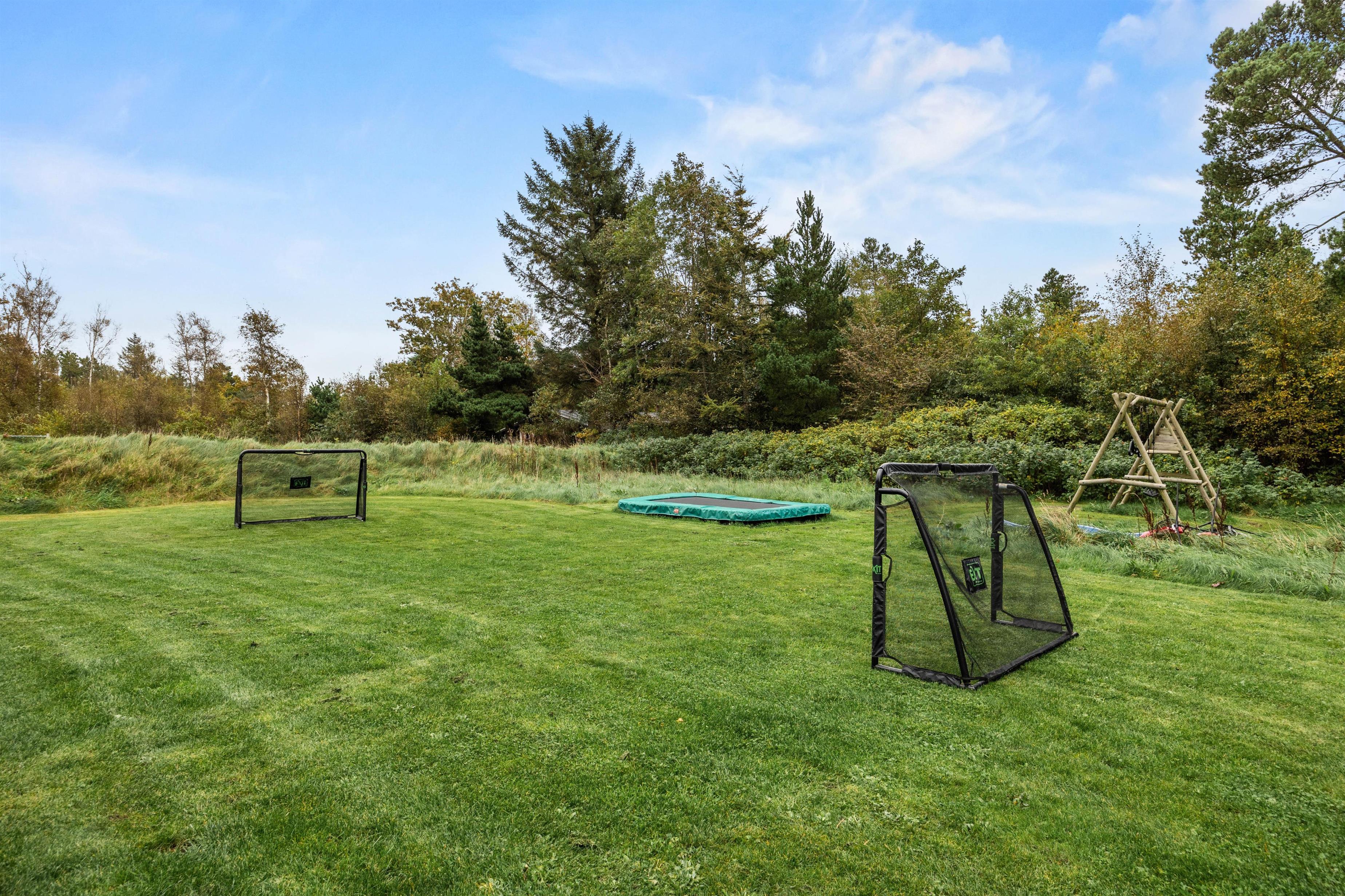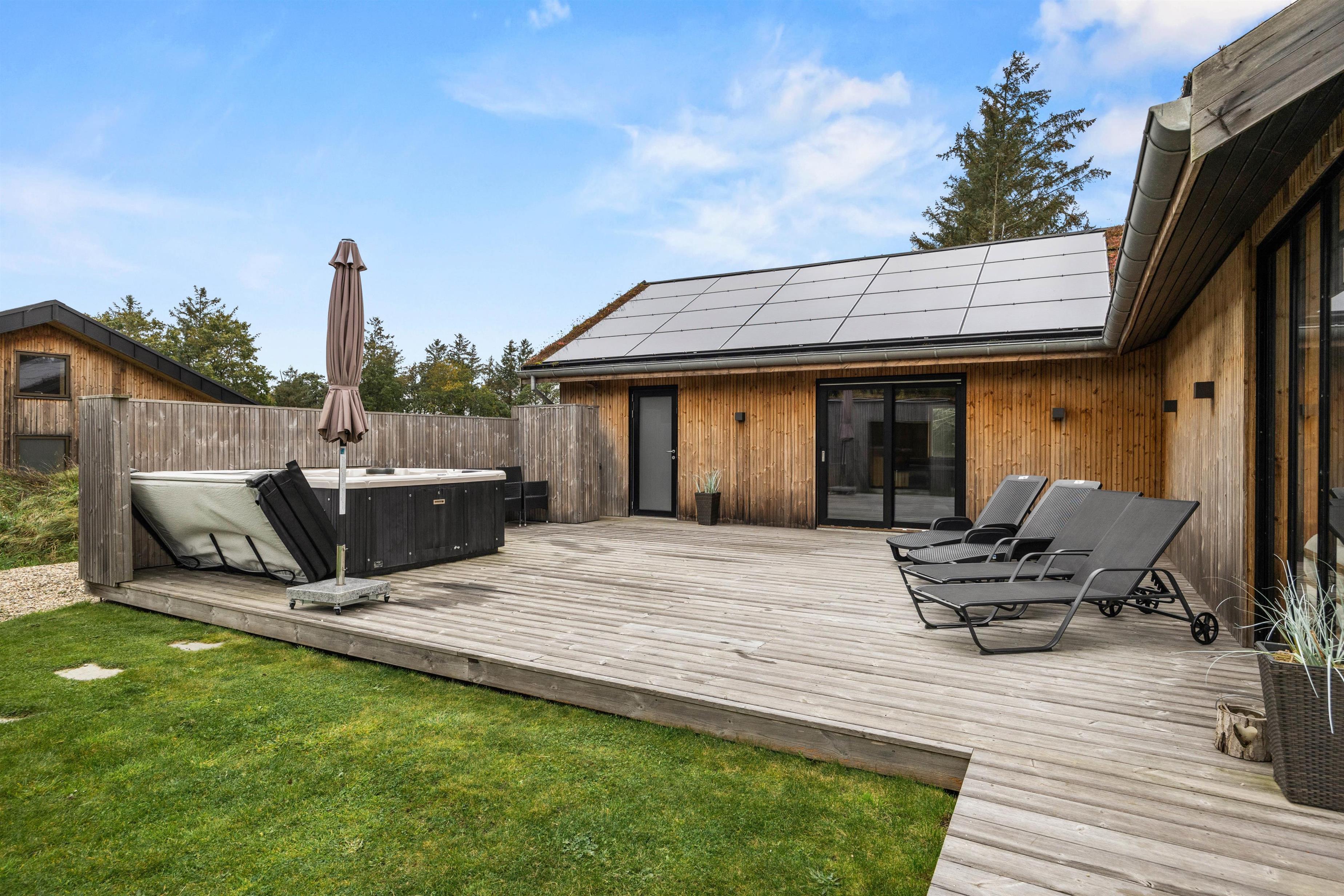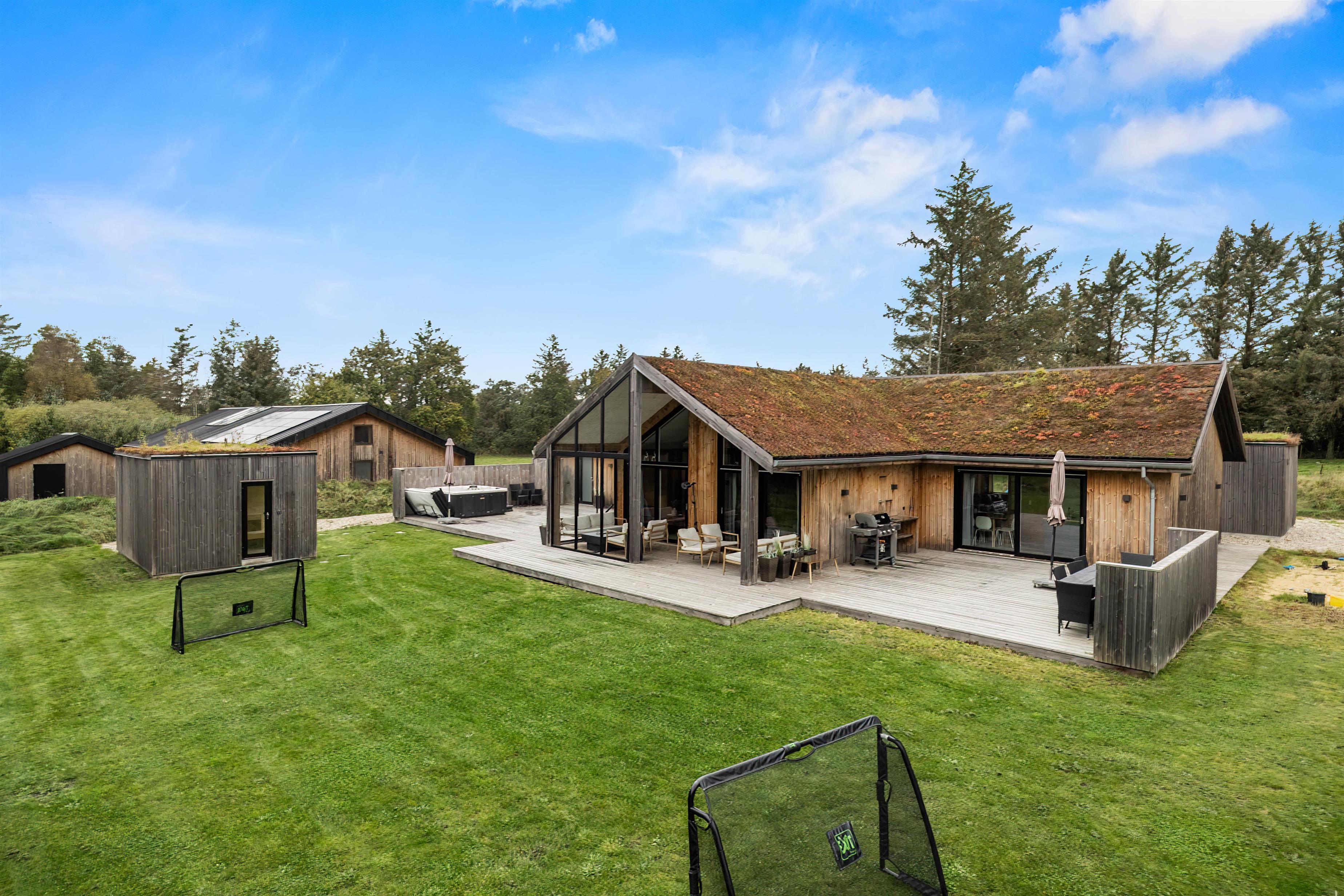 På Strandgodsvej 15 i Henne ligger dette fantastiske sommerhus, som blev opført i 2021, med plads til hele 10 personer og 2 hunde. Den store naturgrund har både udendørsspa, en lækker udesauna, udendørs bruser og udekøkken, mens I indenfor finder et spændende aktivitetsrum. I hele den store feriebolig er der gulvvarme, og der er tilmed en hyggelig hems.
