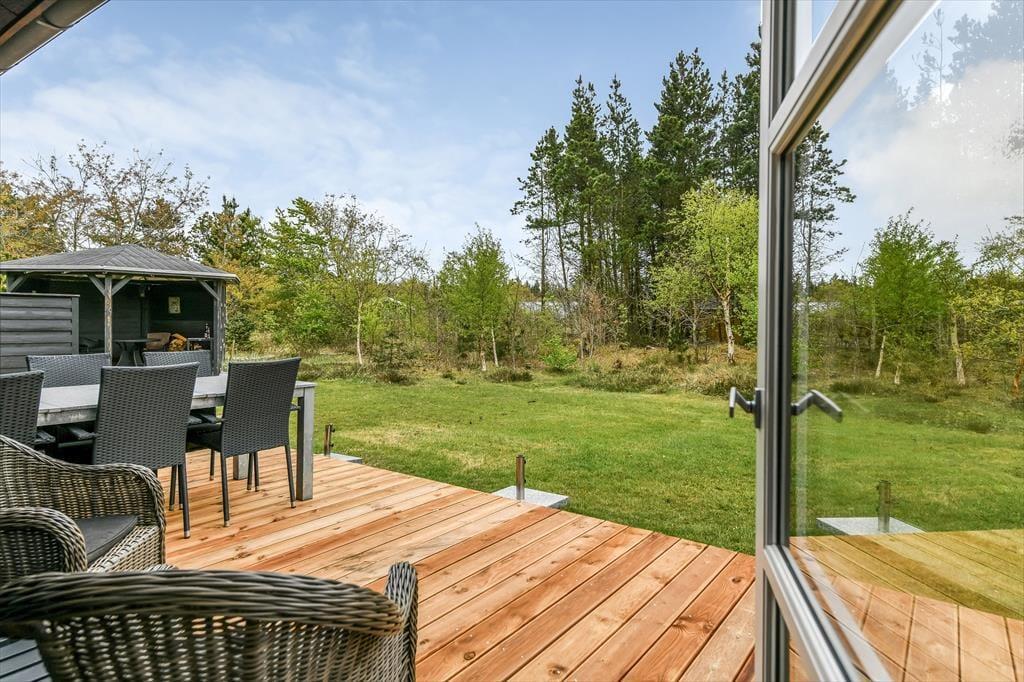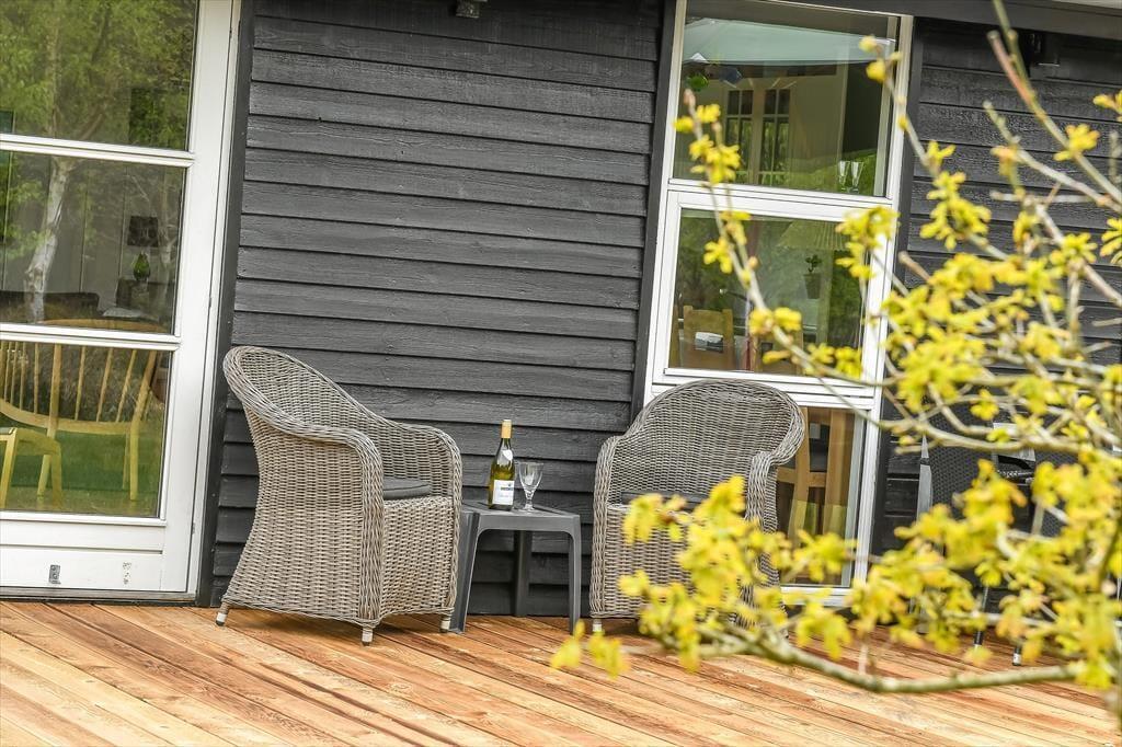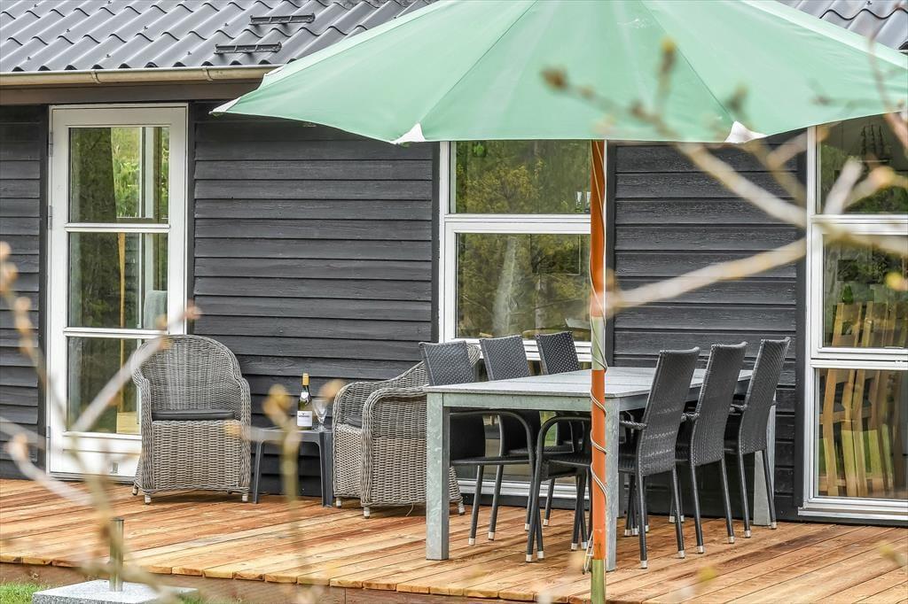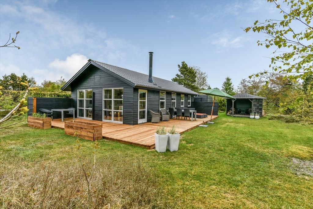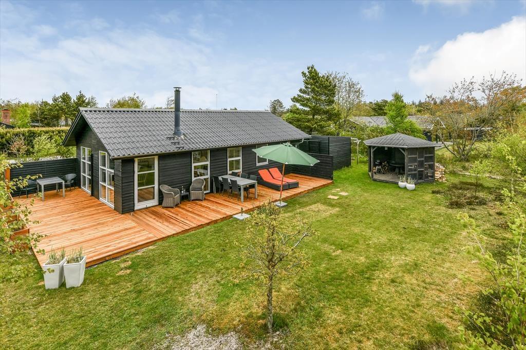 Udenfor venter en skøn, solrig terrasse, der danner den perfekte ramme om feriens udeliv. Her kan du finde din favoritplads i solen, læne dig tilbage i liggestolen og lade dig omfavne af roen, der kendetegner Henneby. Den hyggelige pavillon forlænger udesæsonen og giver dig mulighed for at nyde middagen i det fri – også selvom aftenduggen falder, eller vinden suser i trætoppene. Måske tænder I stearinlysene og nyder et glas vin i pavillonen, mens solen langsomt går ned bag trætoppene? Alt omkring huset indbyder til ro, nærvær og lange, afslappende feriedage, hvor du ikke skal andet end at nyde nuet.