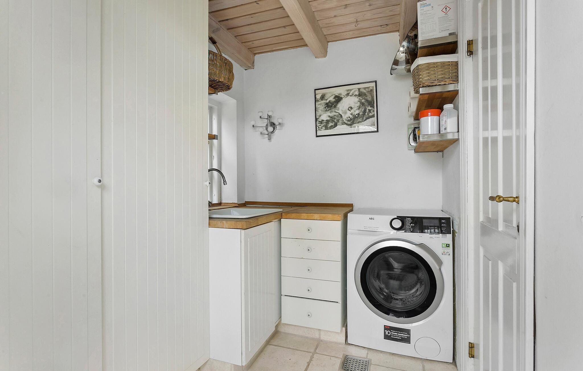 Nyd en afslappende ferie i dette charmerende stråtagshus nær Roskilde Fjord. Den rolige beliggenhed, det stilfulde interiør og den store have gør dette feriehus til et ideelt tilflugtssted for jeres næste ferie. Lad jer byde velkommen af ??husets varme atmosfære. Den rummelige opholdsstue med sine synlige træbjælker udstråler komfort. Find jer godt til rette i den hyggelige sofa foran den åbne brændeovn og nyd den knitrende ild. Den tilstødende spiseplads giver plads til hyggelige timer over måltider sammen. Det moderne køkken med en rummelig arbejdsflade lægger op til at lave mad. Et lyst, åbent rum venter jer på loftet med komfortable siddepladser og retreater.