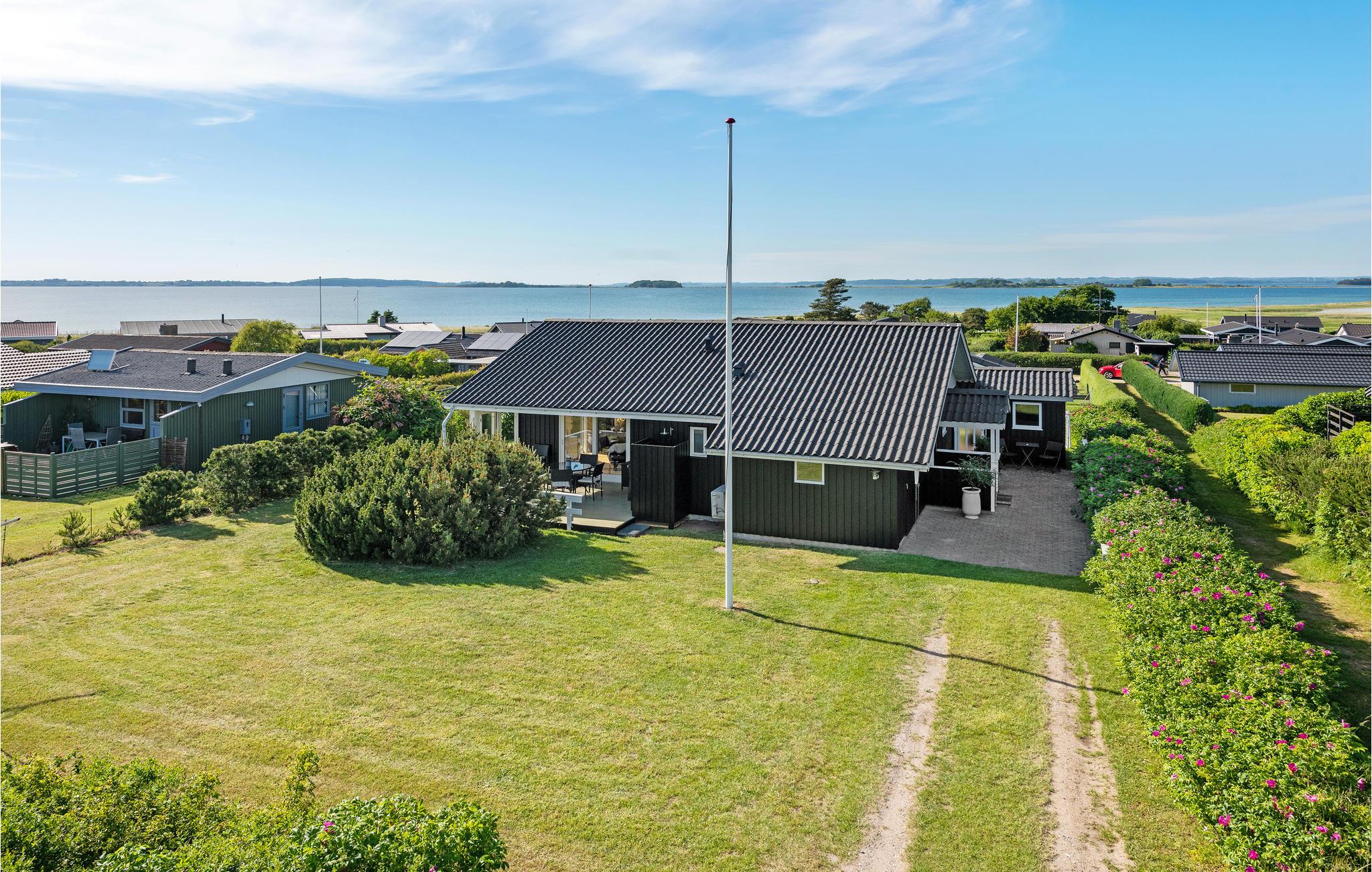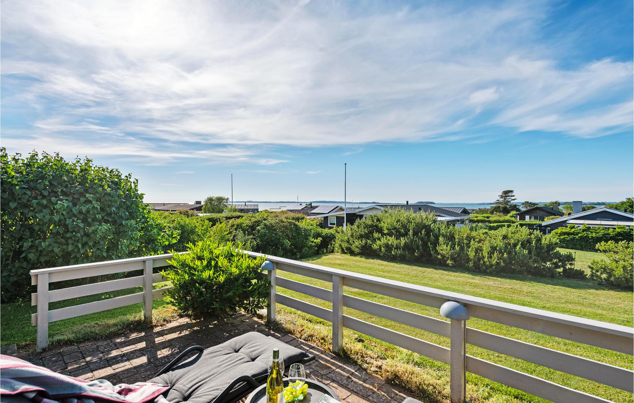 Lyst og moderne sommerhus med terrasser og delvis havudsigt nær stranden ved Faaborg.