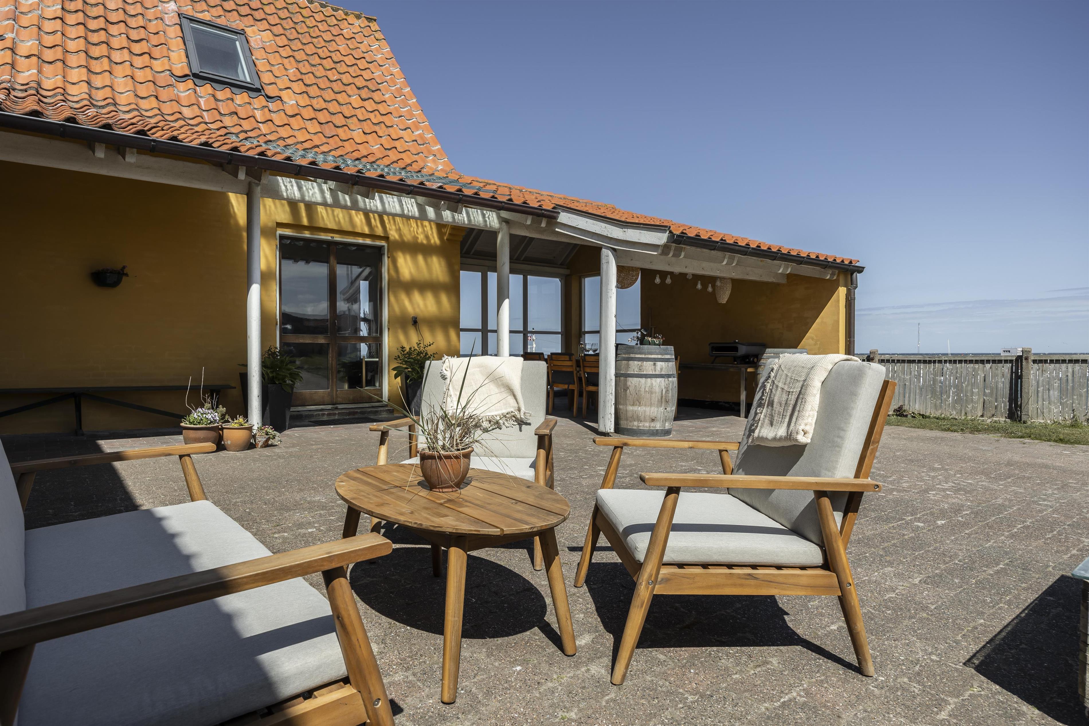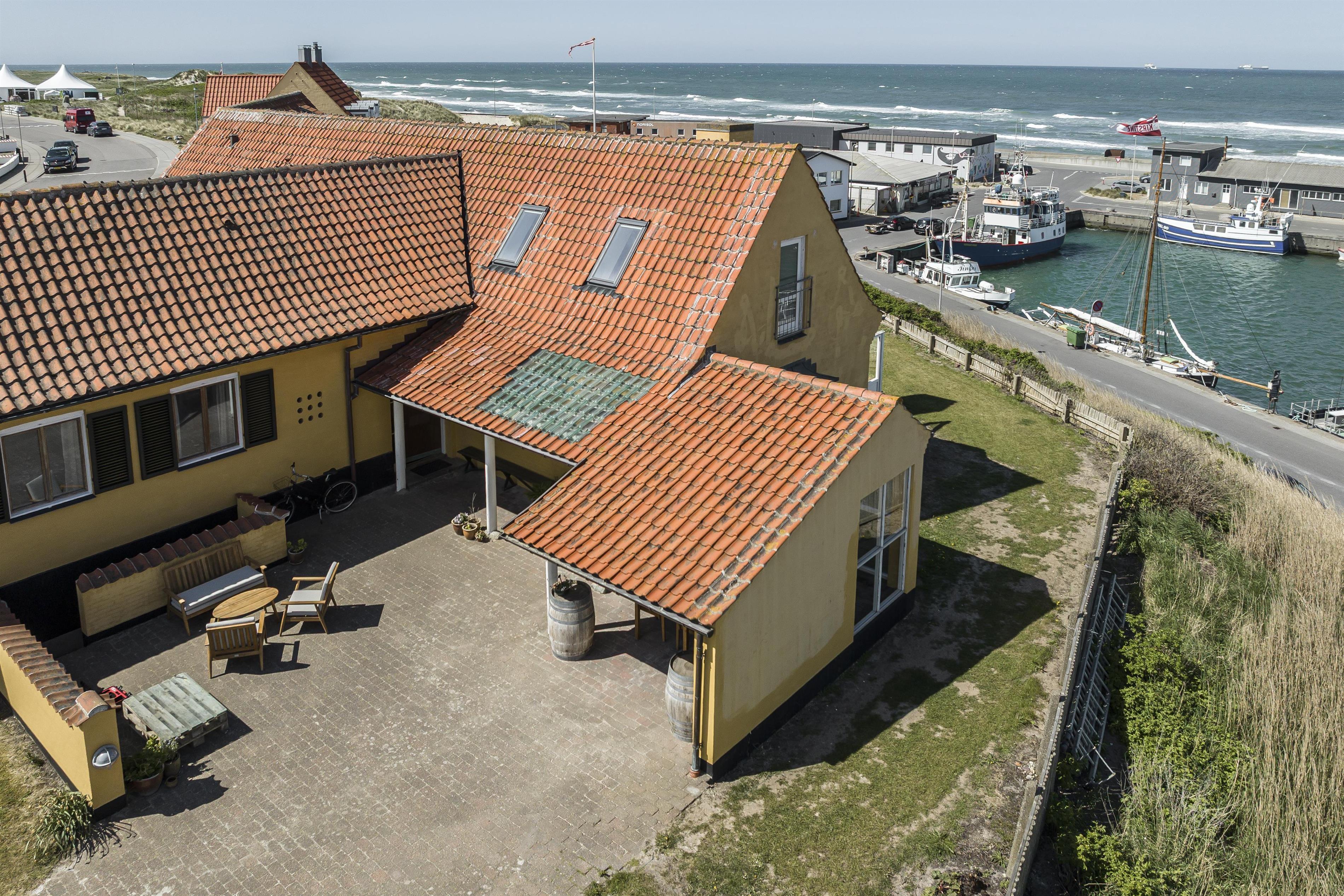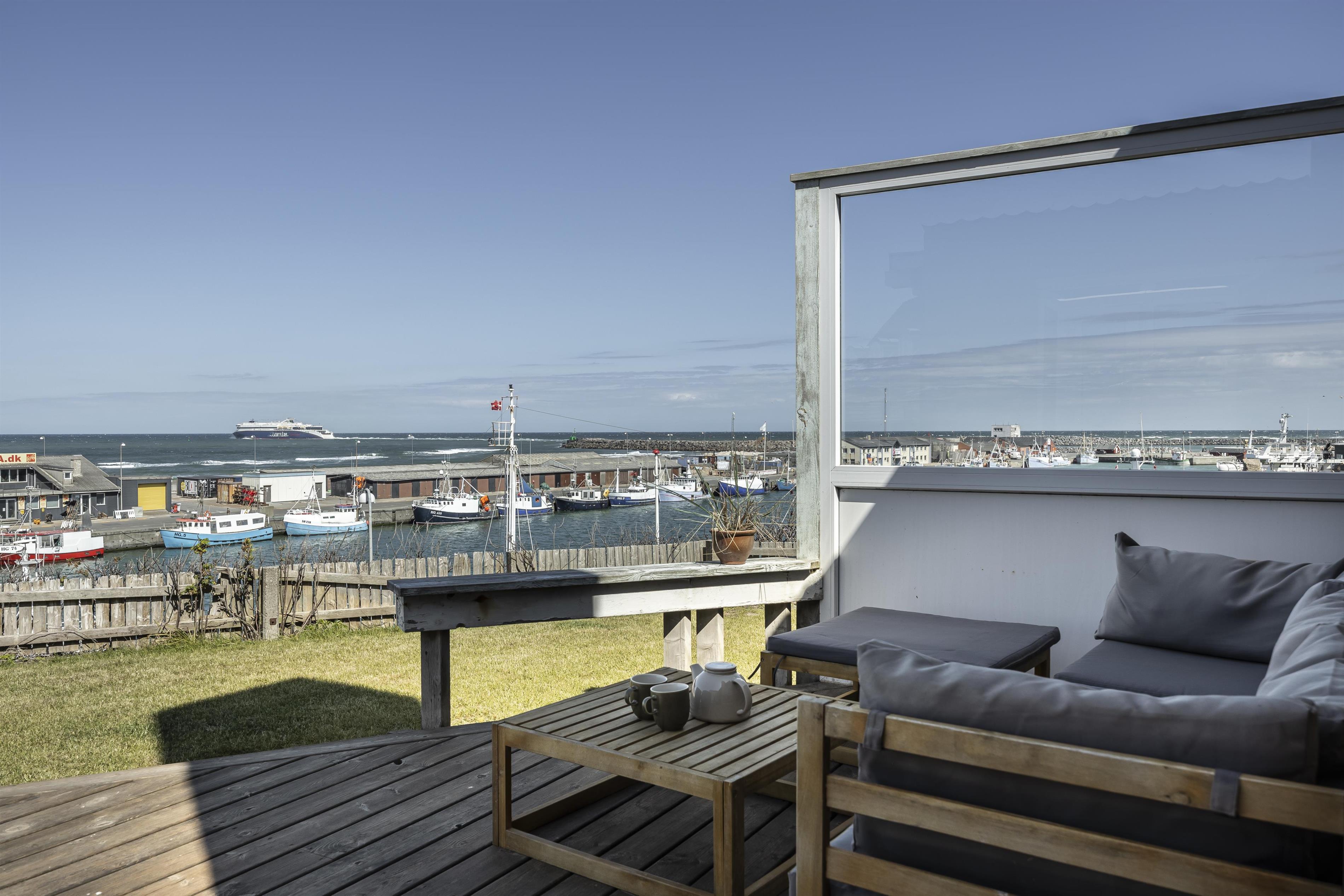 Selvom huset ligger midt i Hirtshals by, er der mulighed for ro og privatliv på de skønne terrasser. Den ene terrasse er overdækket og byder på læ, så du kan nyde udelivet i al slags vejr. Terrassen vender væk fra byens liv, hvilket gør det muligt at slappe af helt ugeneret med udsigt til havet og havnens stemningsfulde liv. Her kan du nyde din morgenkaffe eller et glas vin i aftensolen, mens du følger skibene og færgerne sejle ind og ud af havnen.