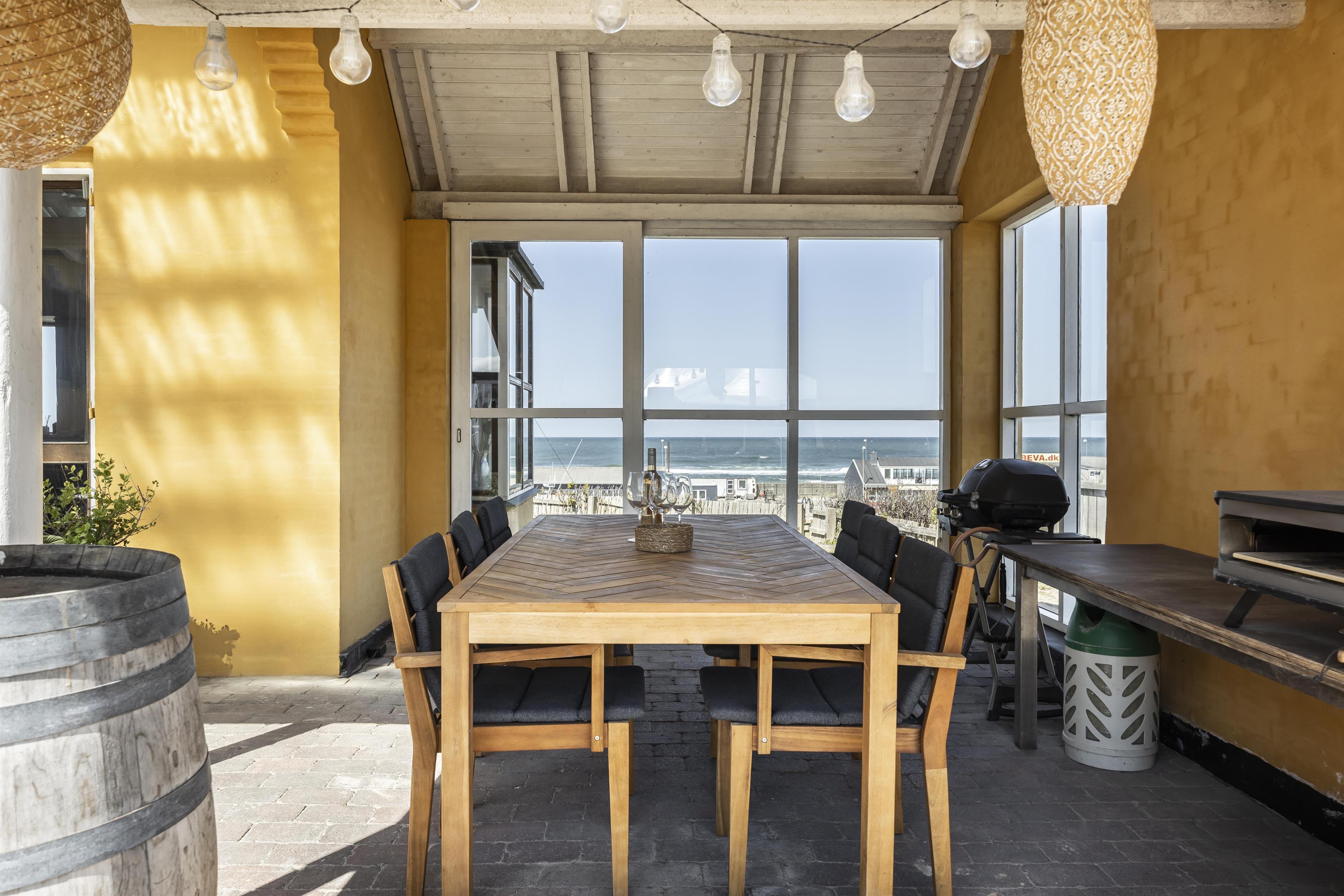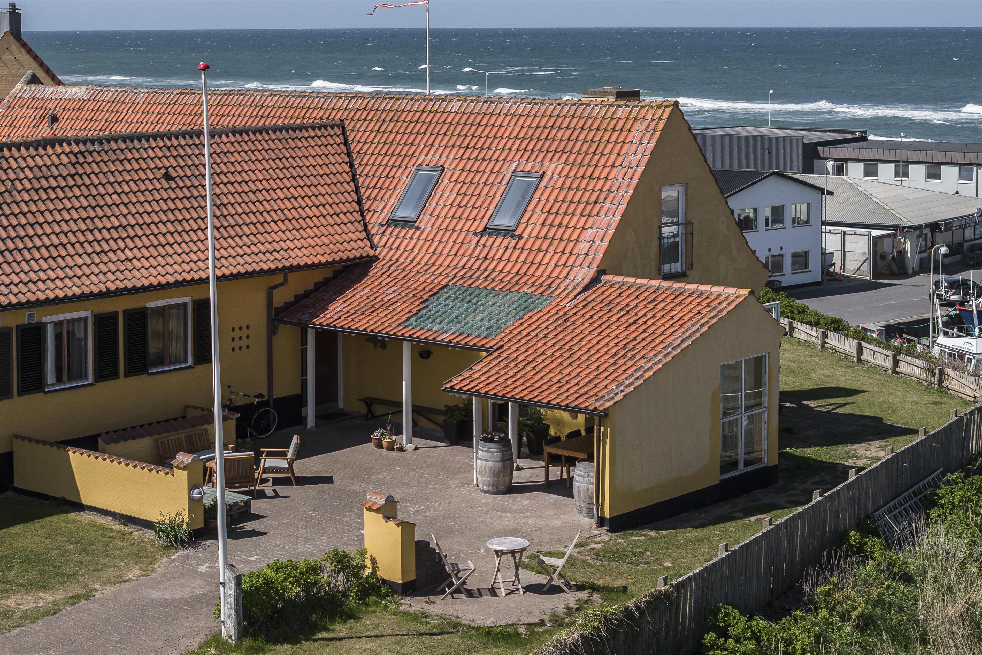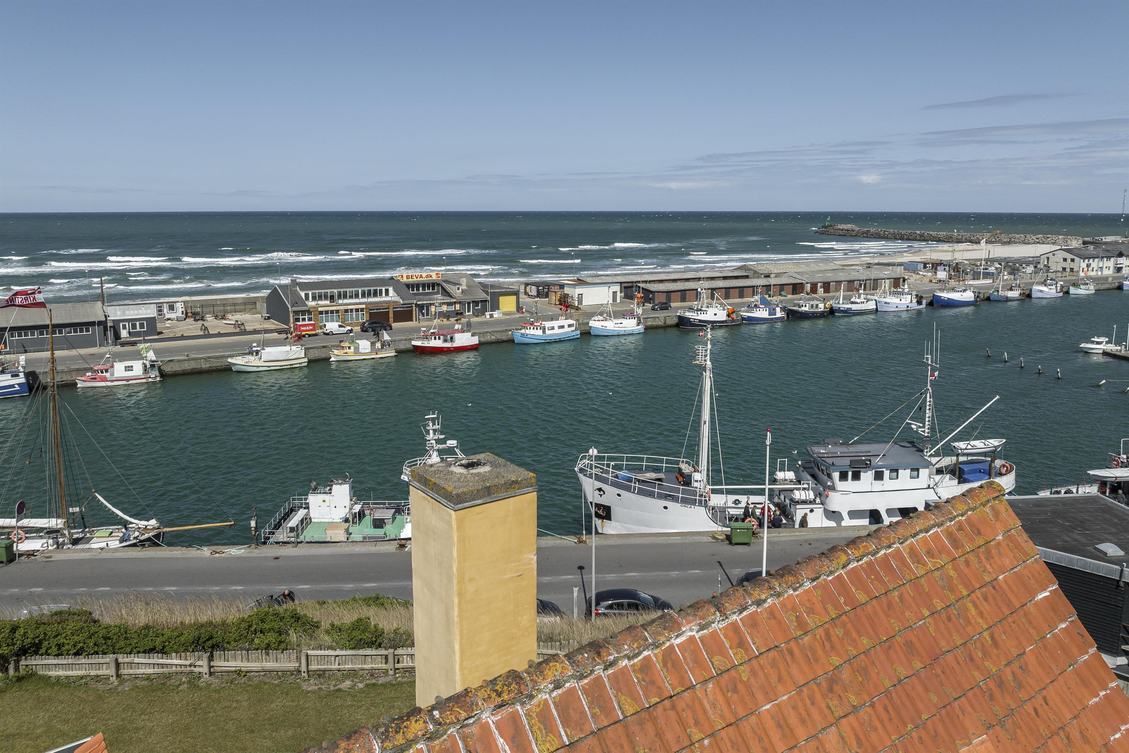 Selvom huset ligger midt i Hirtshals by, er der mulighed for ro og privatliv på de skønne terrasser. Den ene terrasse er overdækket og byder på læ, så du kan nyde udelivet i al slags vejr. Terrassen vender væk fra byens liv, hvilket gør det muligt at slappe af helt ugeneret med udsigt til havet og havnens stemningsfulde liv. Her kan du nyde din morgenkaffe eller et glas vin i aftensolen, mens du følger skibene og færgerne sejle ind og ud af havnen.