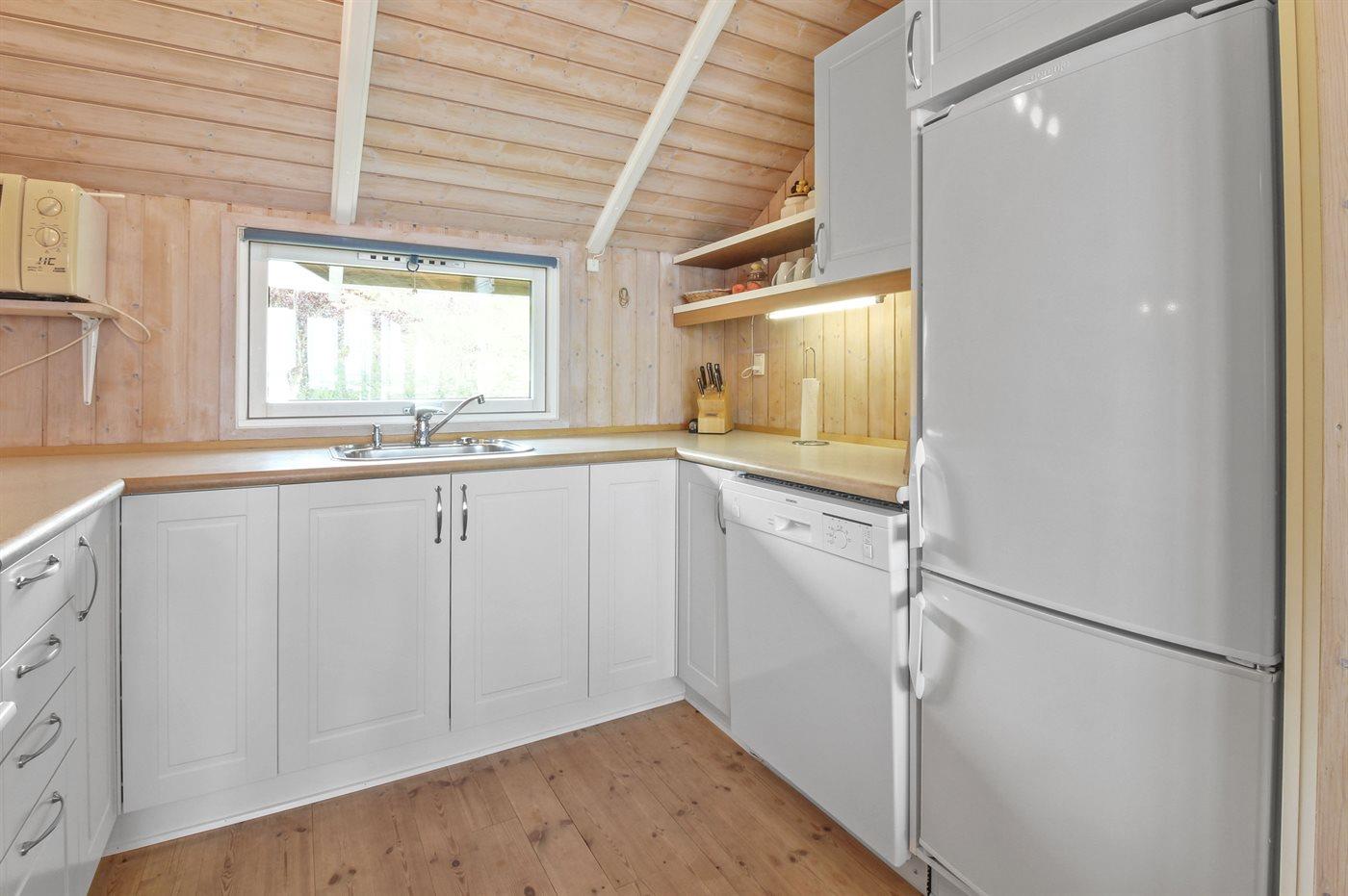 Køkkenet er udstyret med 1 køleskab. Der er 4 keramiske kogeplader, varmluftovn, mikrobølgeovn samt opvaskemaskine.