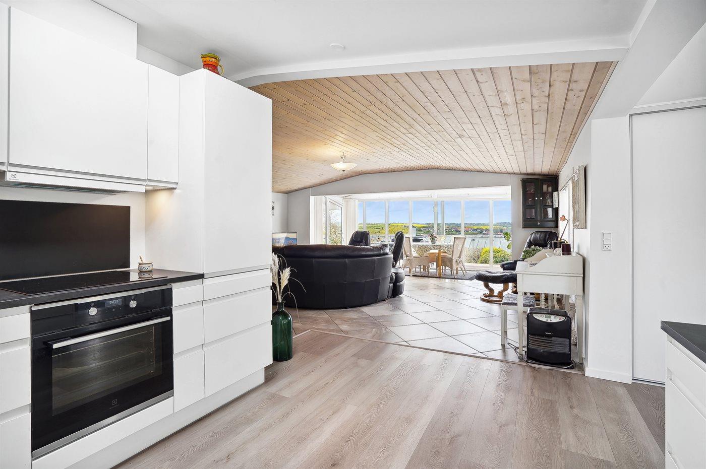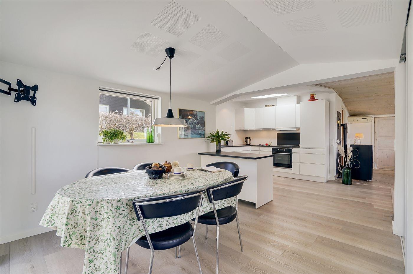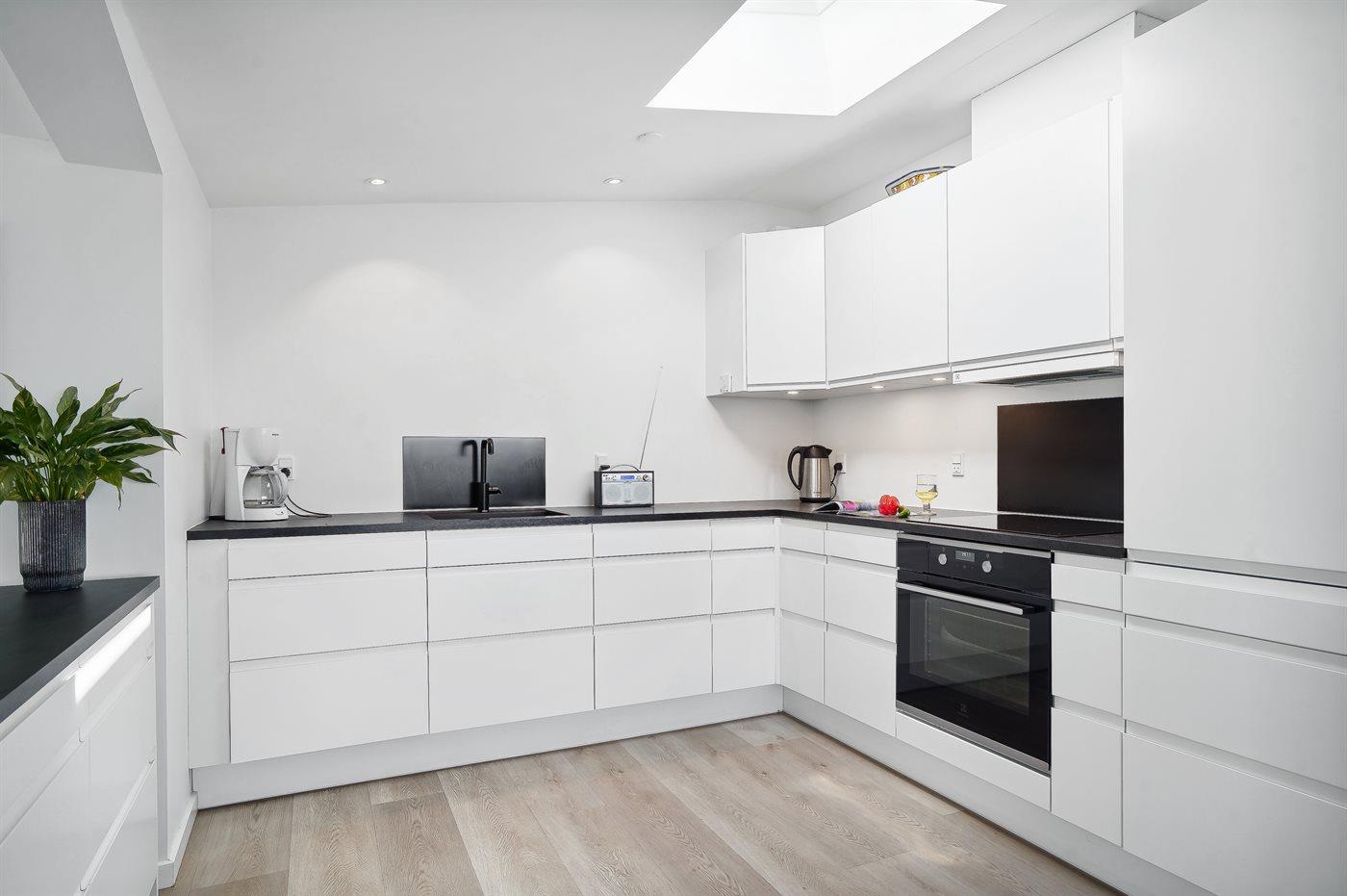 Køkkenet er udstyret med 1 køleskab. Der er 4 keramiske kogeplader, varmluftovn, mikrobølgeovn samt opvaskemaskine.