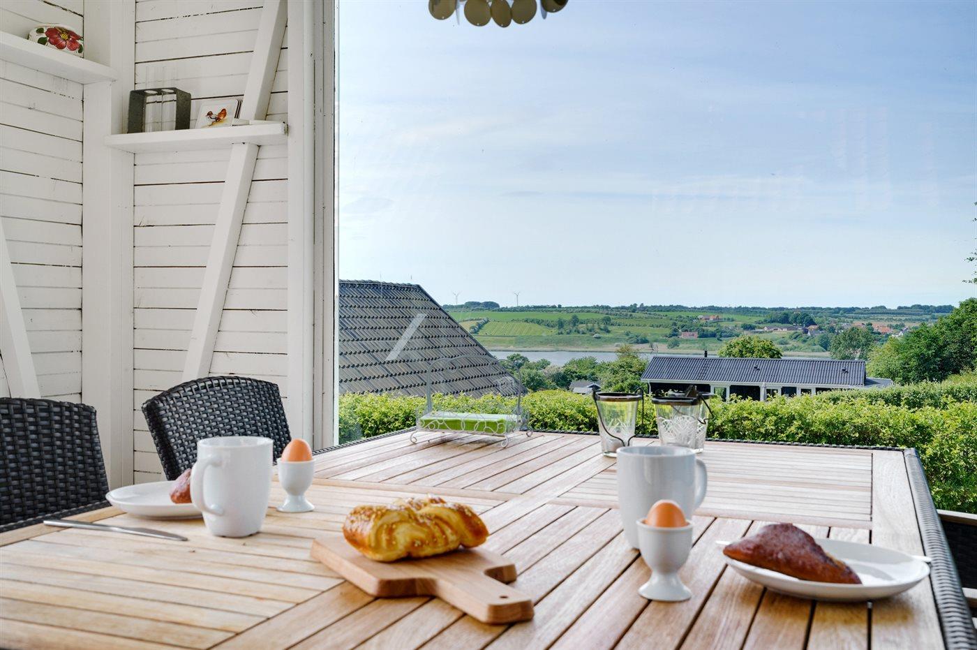Stort sommerhus nær Limfjorden med spa, brændeovn og flot udsigt til fjorden på en solrig grund.