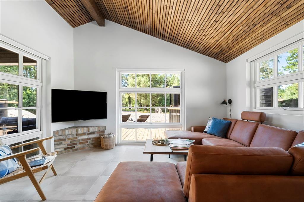 Indendørs mødes du af et moderne og stilrent sommerhus, hvor indretningen emmer af kvalitet og velvære. De store vinduespartier lader lyset strømme ind, og det åbne køkken-alrum skaber en indbydende atmosfære, hvor samvær er i centrum. Med tre badeværelser er der god plads til alle, så morgenrutinerne glider let, og der er rig mulighed for at trække sig tilbage og nyde ferien i ro og mag.