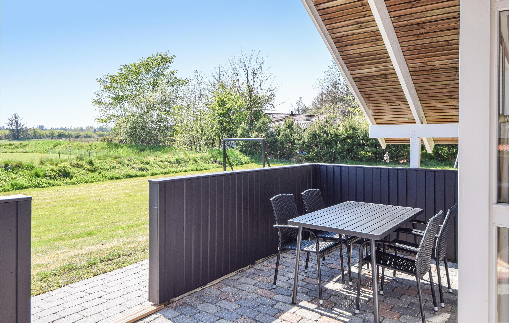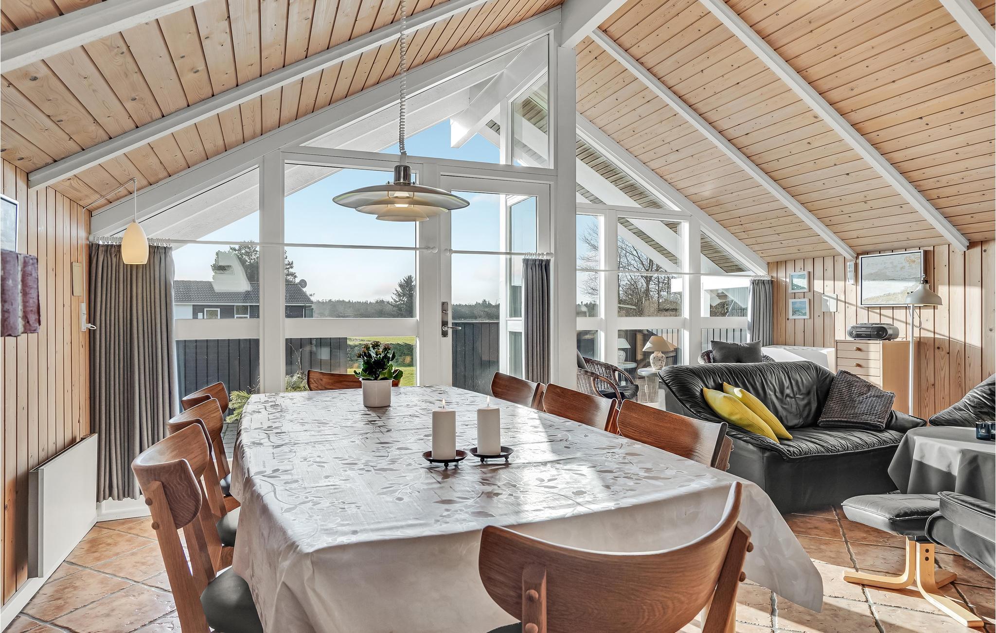 Godt sommerhus beliggende på en stor grund der indbyder til leg og boldspil. Fra grunden er der udsigt til både golfbanen og ned mod Ho bugt. I forbindelse med husets indgang er der lavet en slags forgang; et lille lukket område, hvor der er god plads til jakker og sko. Fra stuen er der udgang til en dejlig, lukket, delvis overdækket terrasse, hvor I kan sidde og nyde de dejlige feriedage med duften af grill og se ud over den dejlige grund, der ofte får besøg af rådyr og masser af fugle.