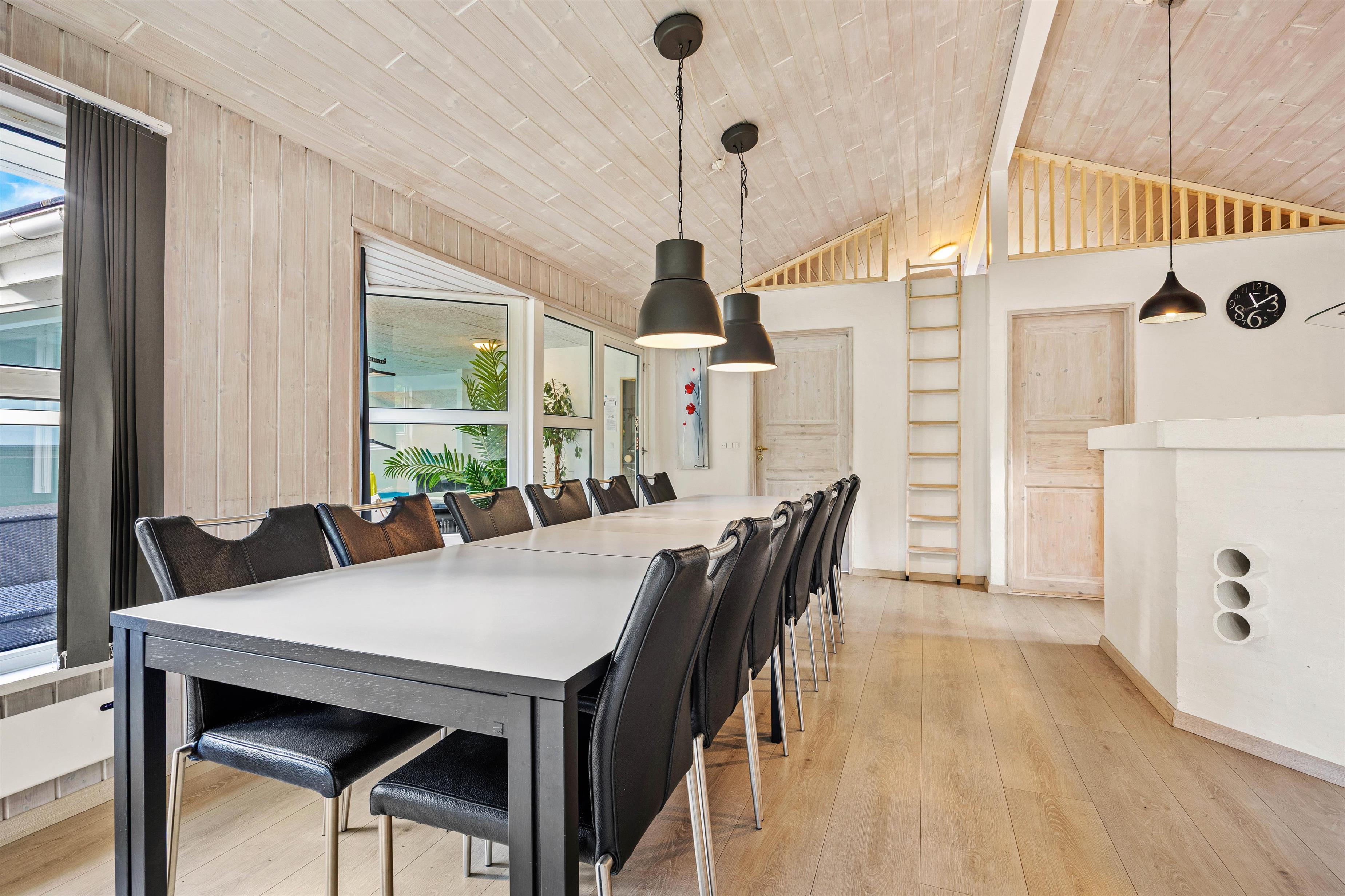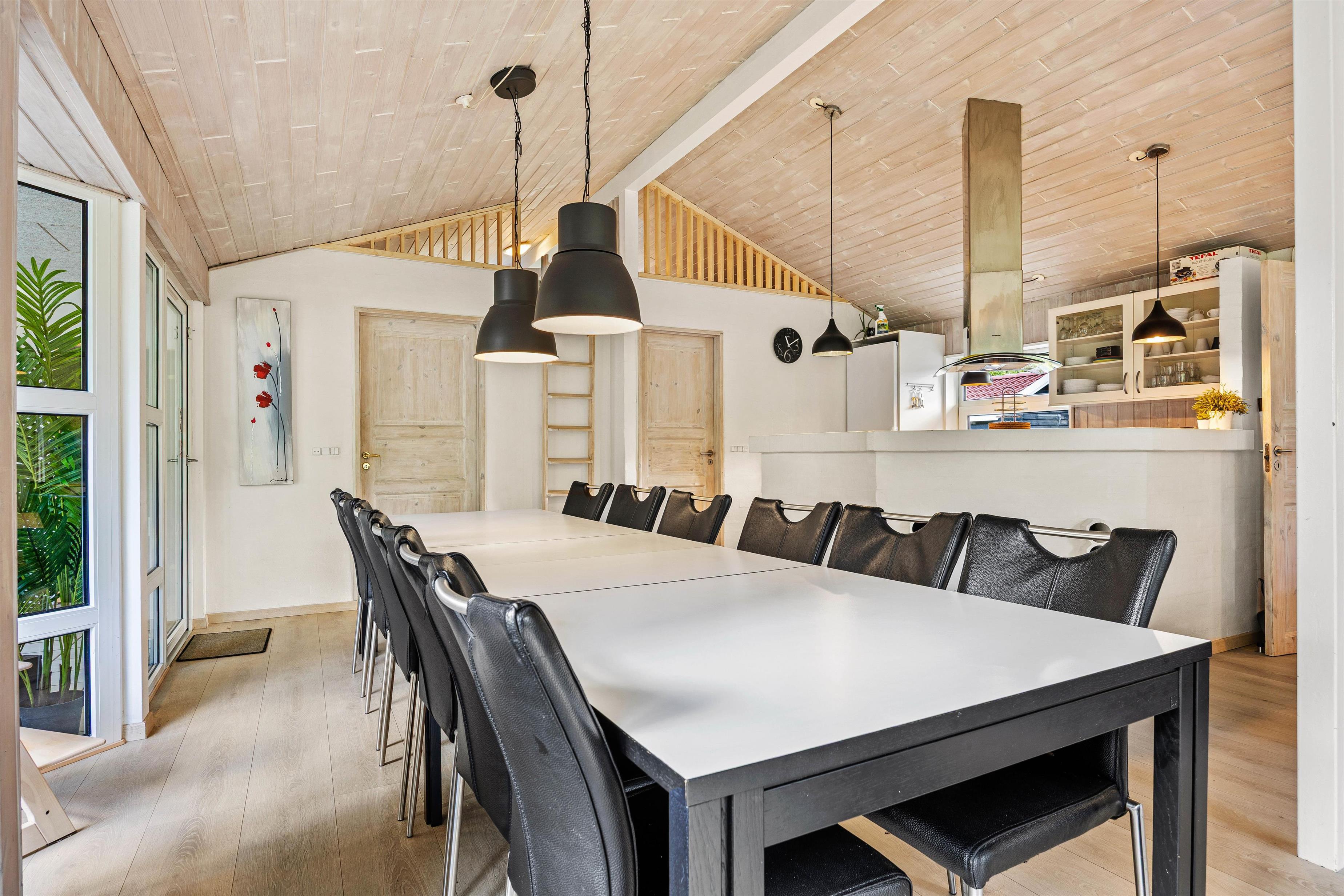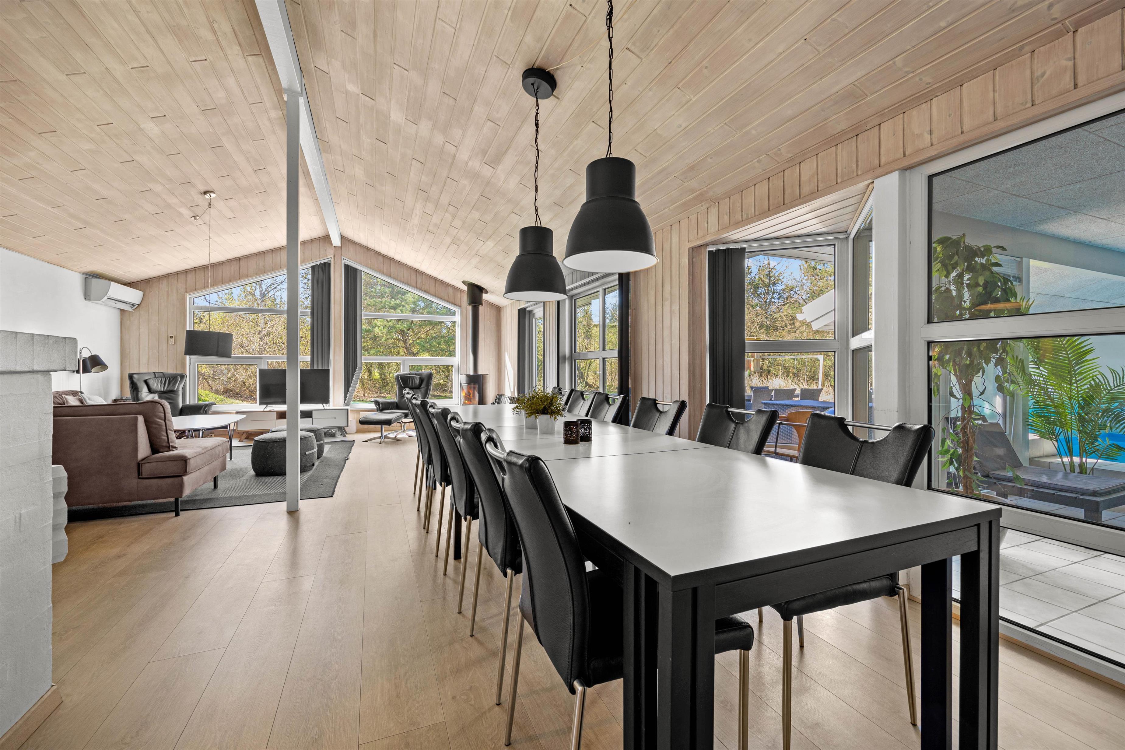Højdepunkterne for dette dejlige feriehus er det det opholdsrum, hvor stue og køkken er i åben forbindelse, og selvfølgelig poolrummet. Her er den 23 m2 store swimmingpool samt spa og sauna til afslapning. Her er I sikret mange dejlige stunder uanset vind og vejr – poolen indbyder til både vandplaskeri, boldspil og dykning. Senere kan I alle samles omkring det lange spisebord. Lad opvaskemaskinen klare oprydningen, mens I slænger jer i den komfortable sofa. Pop popcornene, spil brætspil eller se film, mens brændeovnens varme breder sig i rummet.