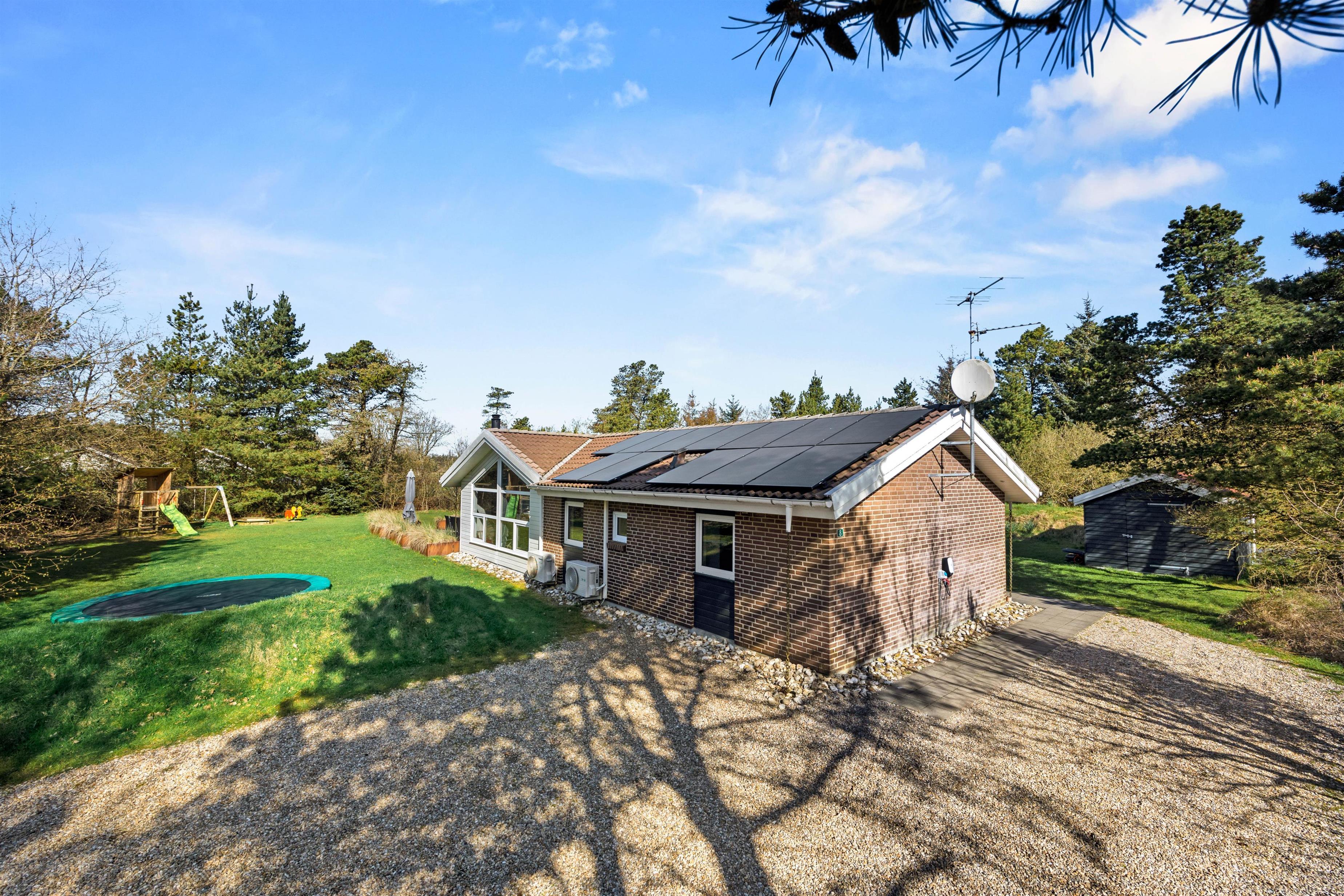 I ly bag træer ligger feriehuset på en stor naturgrund. Her er så dejligt og virkelig tænkt på at få skabt et uderum for både store og små. Der er flere dejlige terrasser rundt om feriehuset, så I kan nyde solskinstimerne. Den flade græsplæne er perfekt til fodbold eller kongespil. I den indhegnede have er en stor nedgravet trampolin, en sandkasse og et legetårn med både gynger og rutsjebane. Mens ungerne hopper rundt, kan der solbades og slappes af på terrassen.