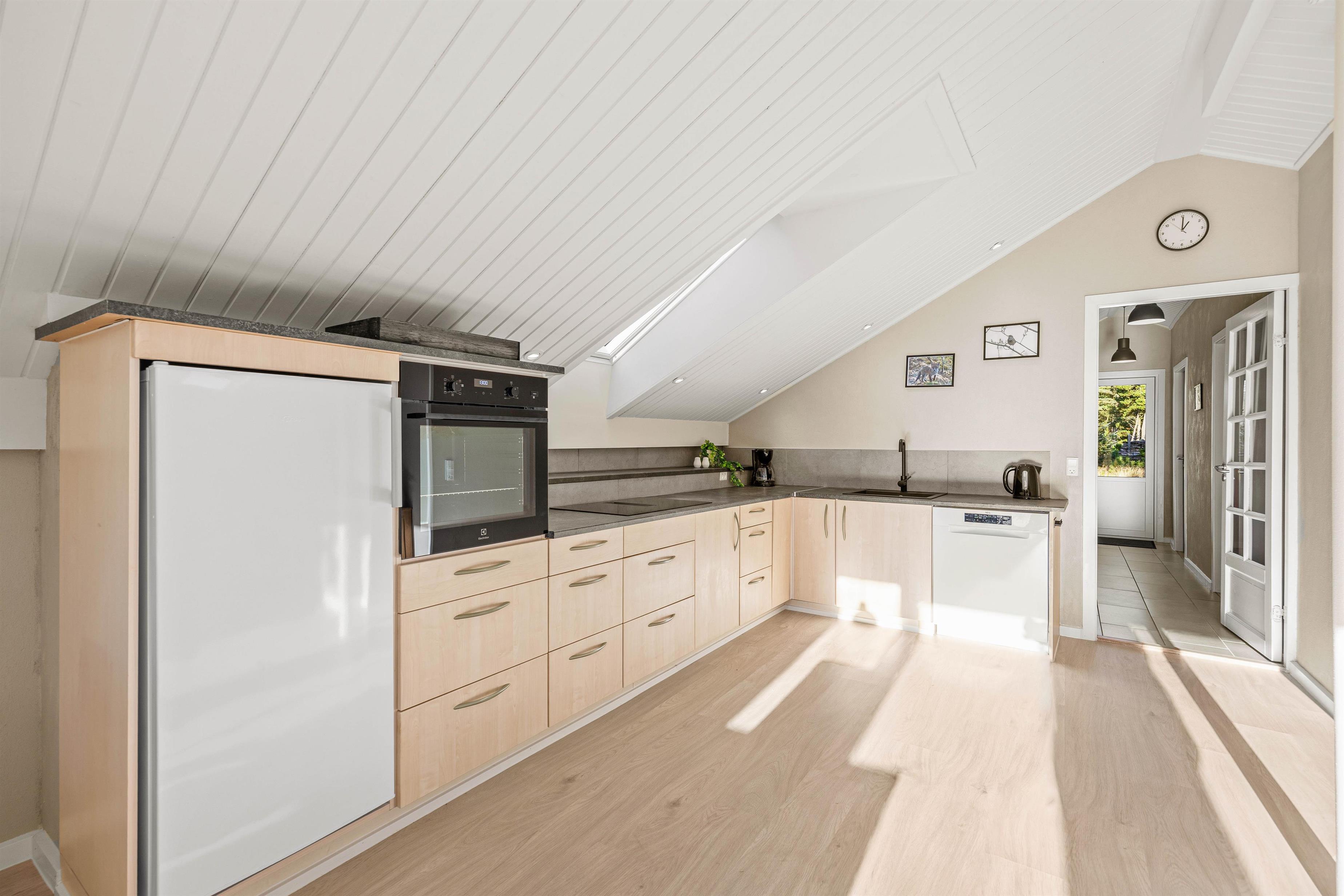 Det lyse køkken-alrum er husets naturlige samlingspunkt, hvor loft til kip og store vinduespartier giver en åben og behagelig atmosfære. Her er god plads til madlavning, fælles måltider og hyggestunder. Køkkenet er renoveret og udstyret med opvaskemaskine og en rummelig 90 liters fryser, så det er let at have alt nødvendigt med til ferien. Badeværelset byder på gulvvarme, og vaskemaskinen gør det nemt at klare tøjvask under opholdet.