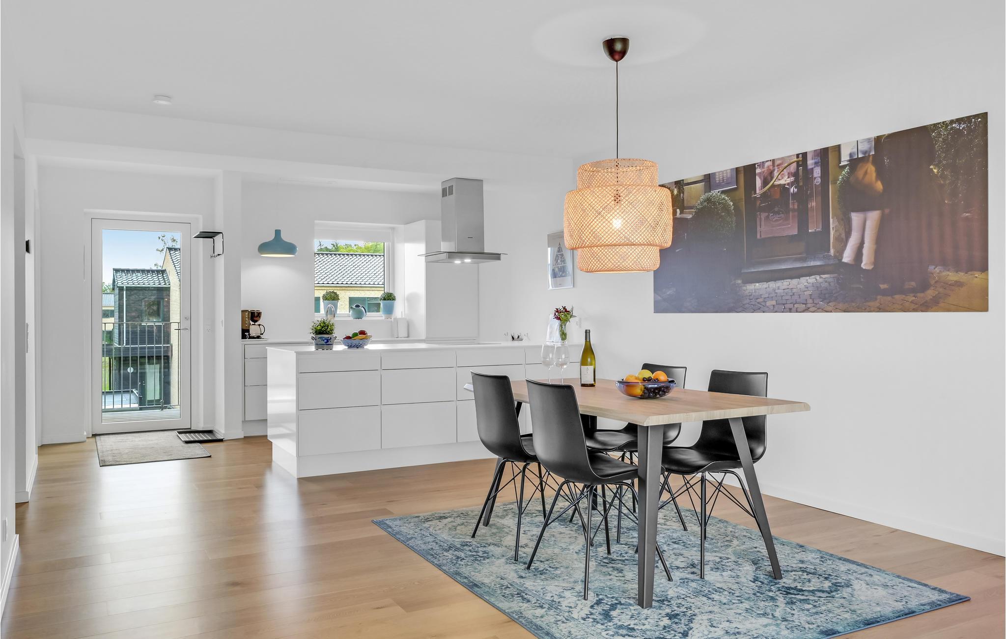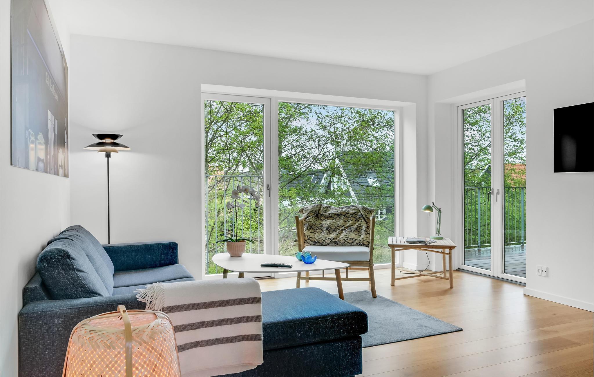 I Hornbæk Skovpark, med få kilometers afstand til hyggelige Hornbæk, ligger denne meget smagfuldt indrettede ferielejlighed på første sal. Lejligheden har dejlige altaner på begge sider af ejendommen - på den ene kan I nyde morgenkaffen og se solen stå op, mens modsatte side er klar til hyggelige aftener med lækkert mad og den smukke solnedgang. Fra begge sider af lejligheden er der et rigtig godt lysindfald, der gør at lejligheden er meget lys og indbydende. Det lækre, åbne køkken ligger i forbindelse med stuen, der er indrettet med flotte, klassiske møbler.