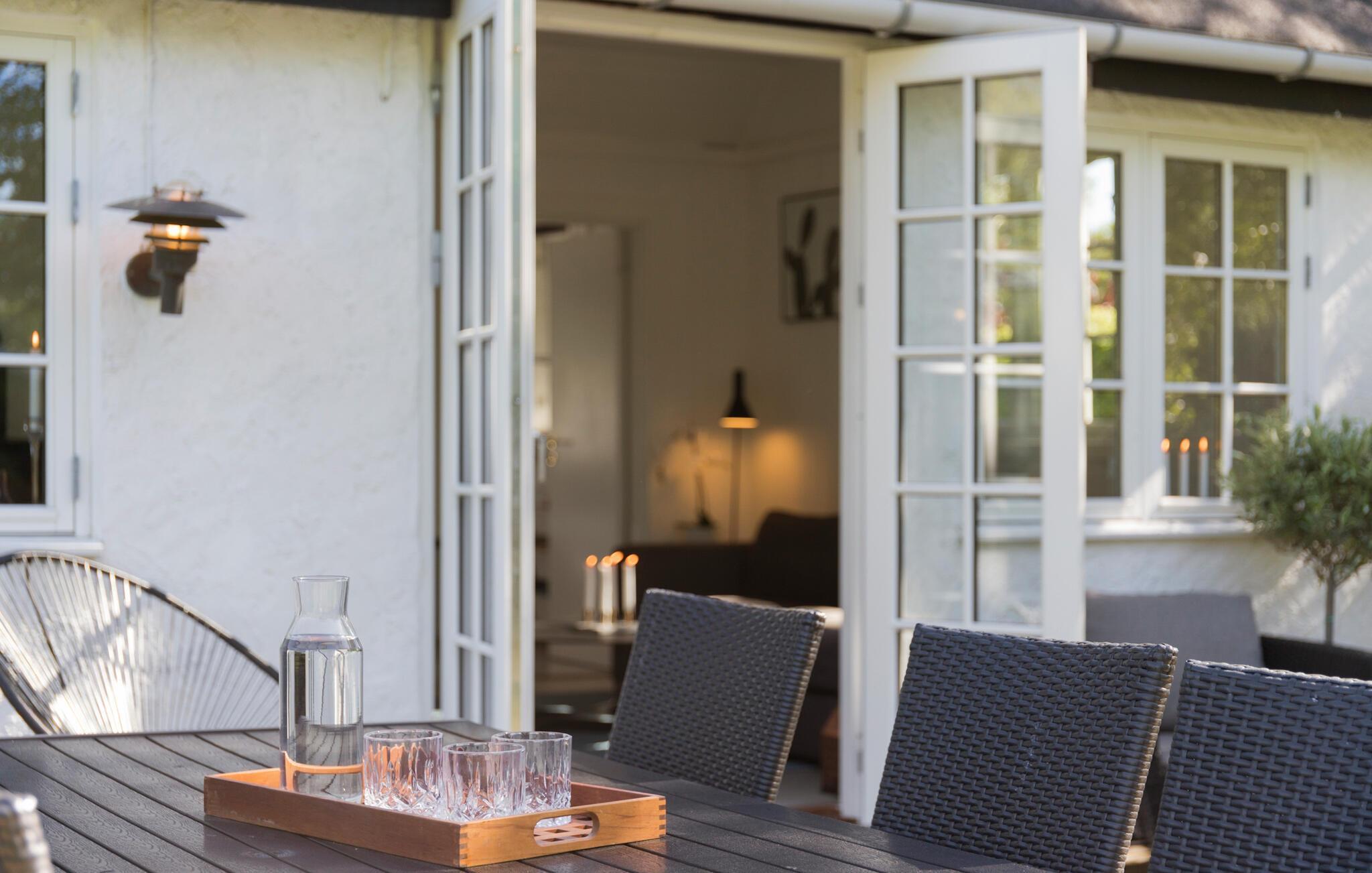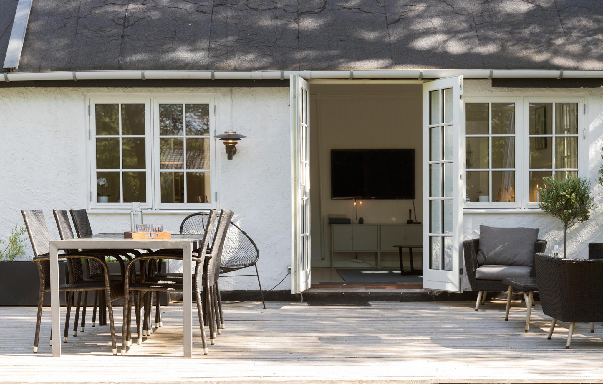 Charmerende og moderne feriehus i Hornbæk med stor terrasse, have, brændeovn og tæt på strand og lystbådehavn.