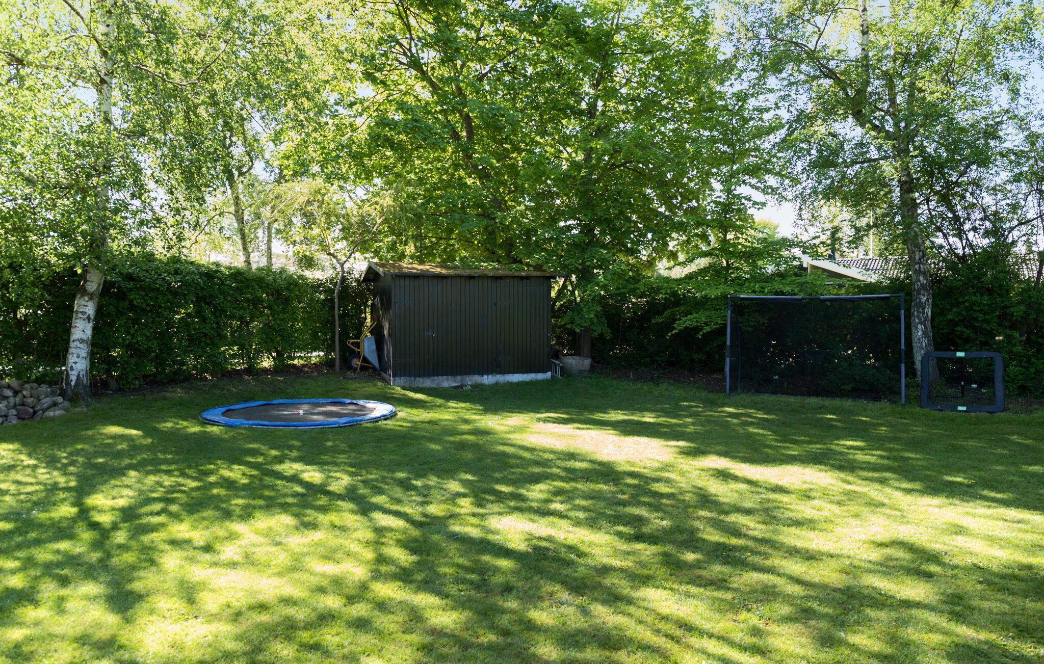 Udeområdet er en sand perle. Her venter jer en stor terrasse, hvor I kan nyde solen og den friske luft lige fra morgenstunden, mens børnene løber rundt og leger i haven. Her er der masser af legeredskaber og en trampolin, hvor de kan brænde energi af i løbet af dagen. Køb lidt lækkert med hjem til grillen, steg nogle saftige bøffer under aftensolen og rund en smuk sommerdag af med skumfiduser og snobrød ved bålpladsen, mens I lægger planer for de kommende dage.