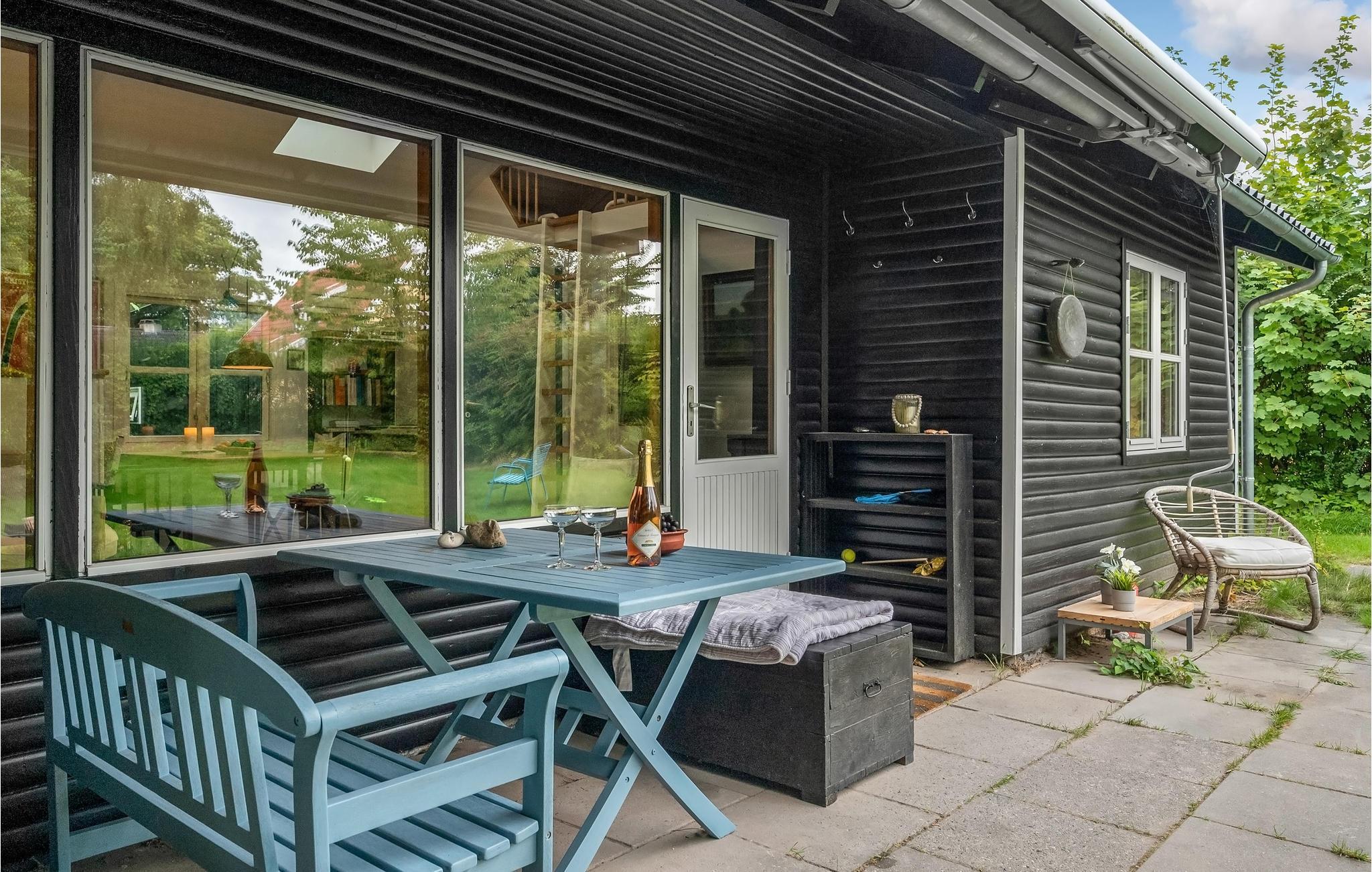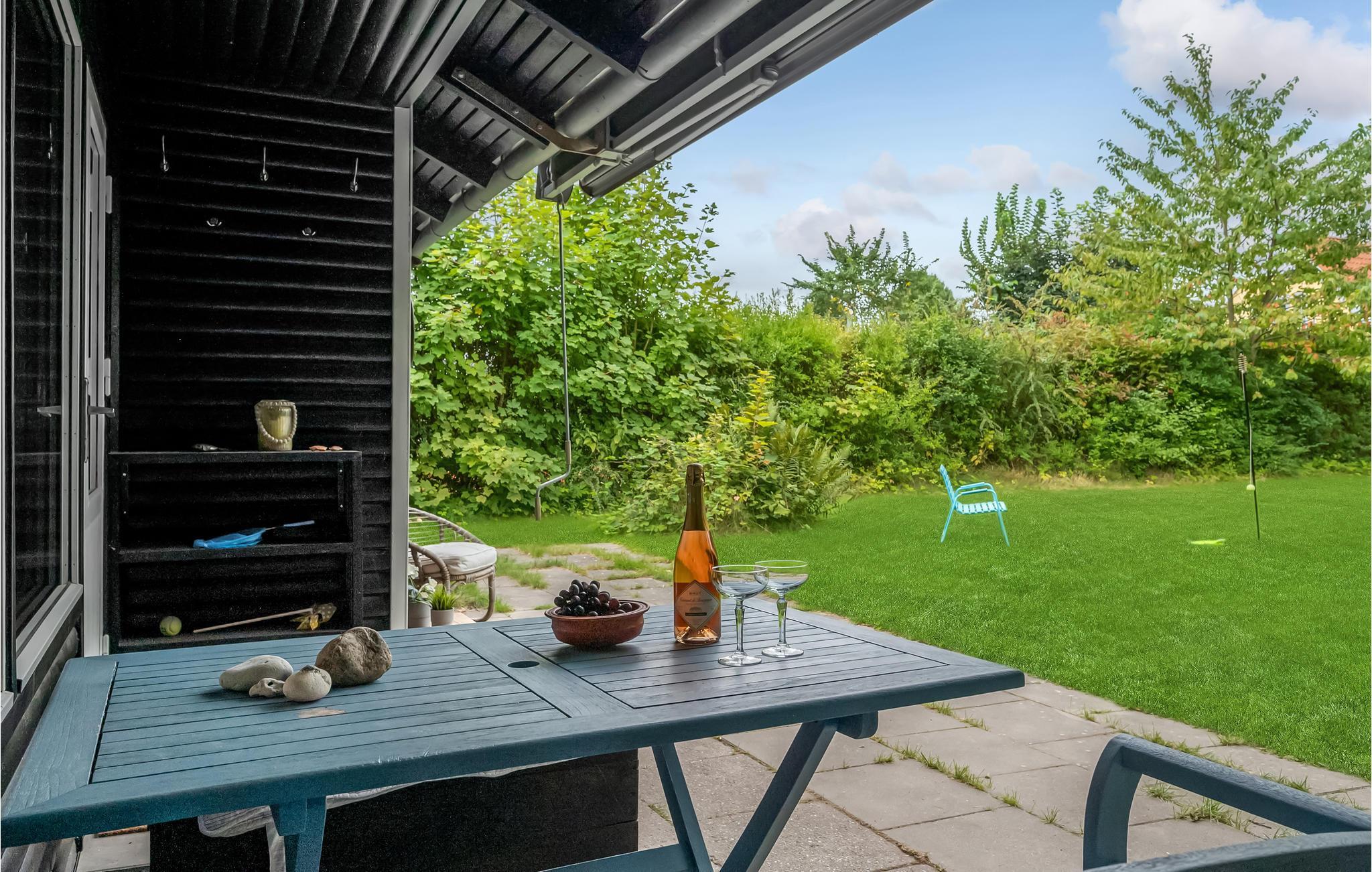 Den overdækkede terrasse inviterer til hyggelige stunder i det fri, hvor I kan læne jer tilbage og lytte til havets brusen længere ude. På grunden er der både trampolin til børnene samt frugttræer og buske, som I frit kan plukke fra, når sæsonen er til det.