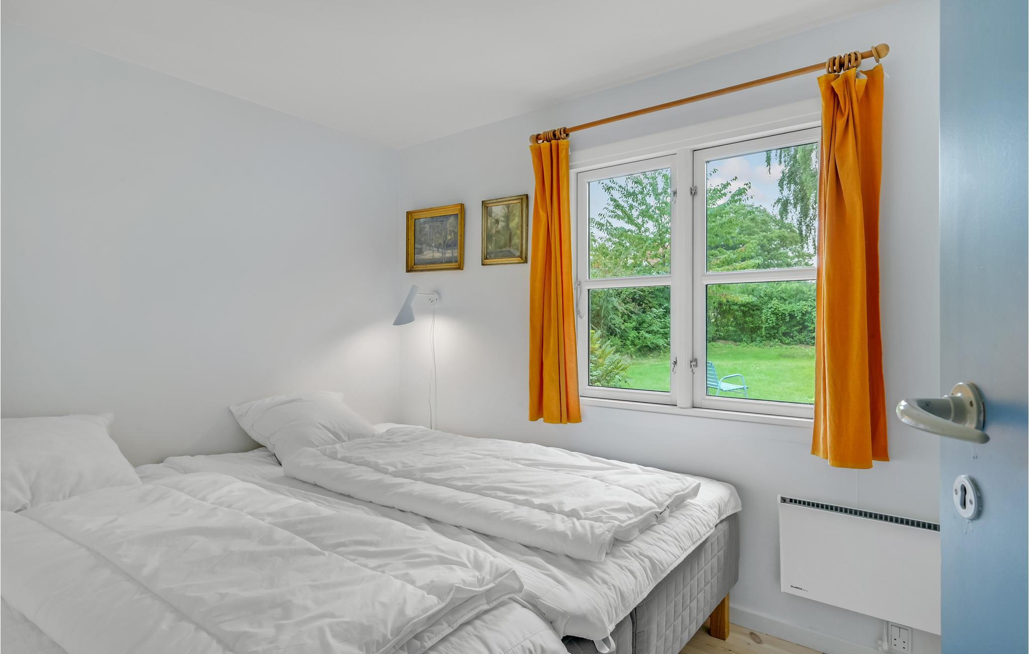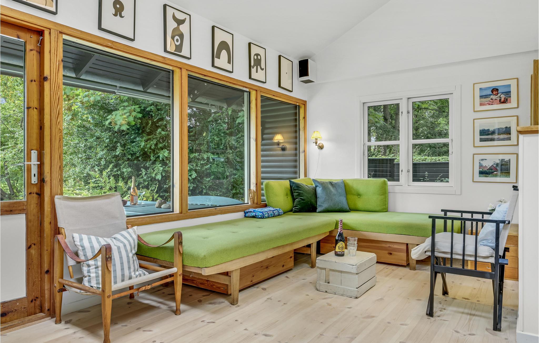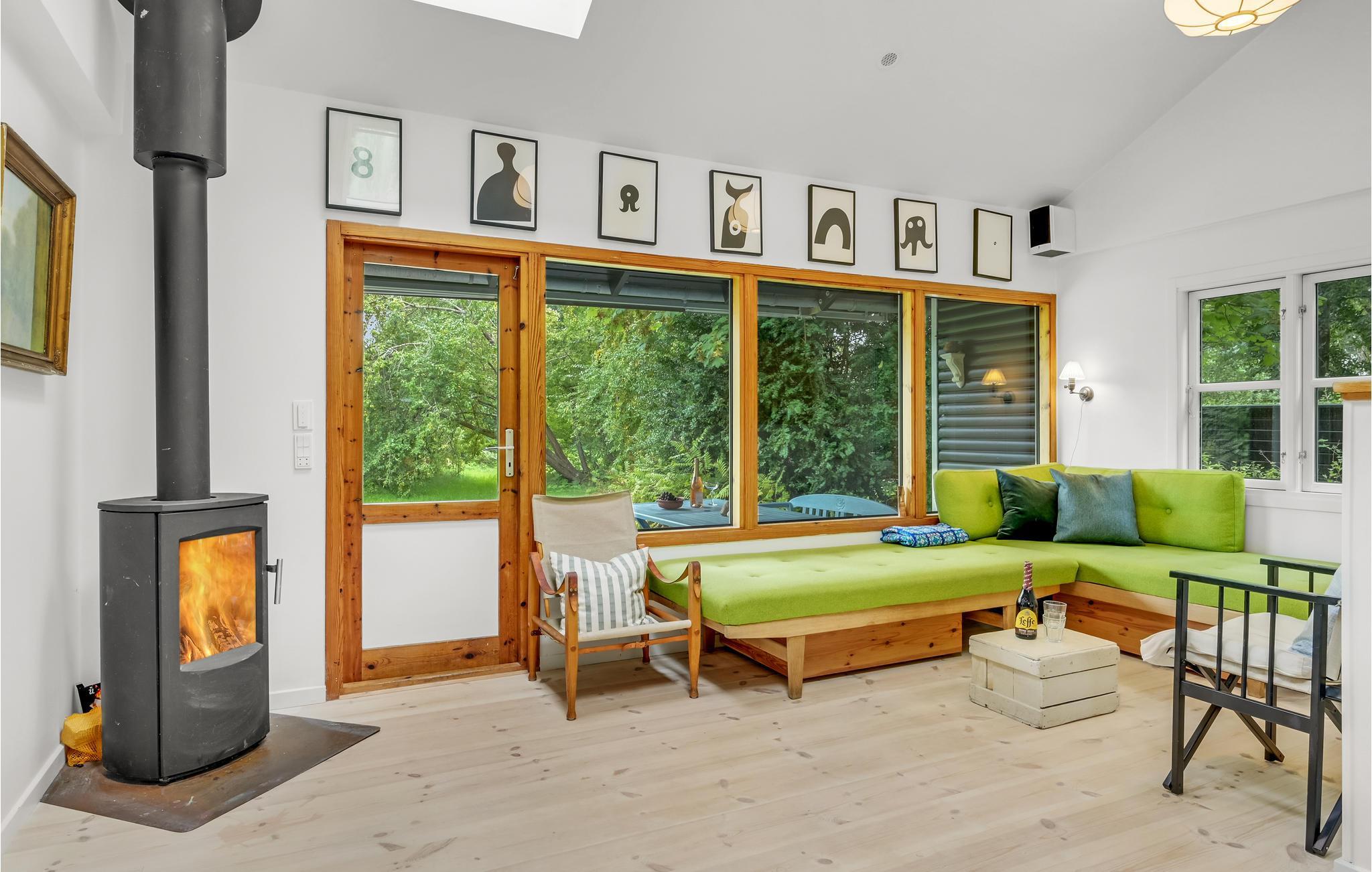 Huset har tre soveværelser, så her er der god plads til en familie. Rummene er hyggeligt og komfortabelt indrettede, og de store vinduer giver en dejlig udsigt til den grønne grund. I stuen er der lagt op til hyggelige aftener med spil eller en god bog, mens I nyder varmen fra brændeovnen.