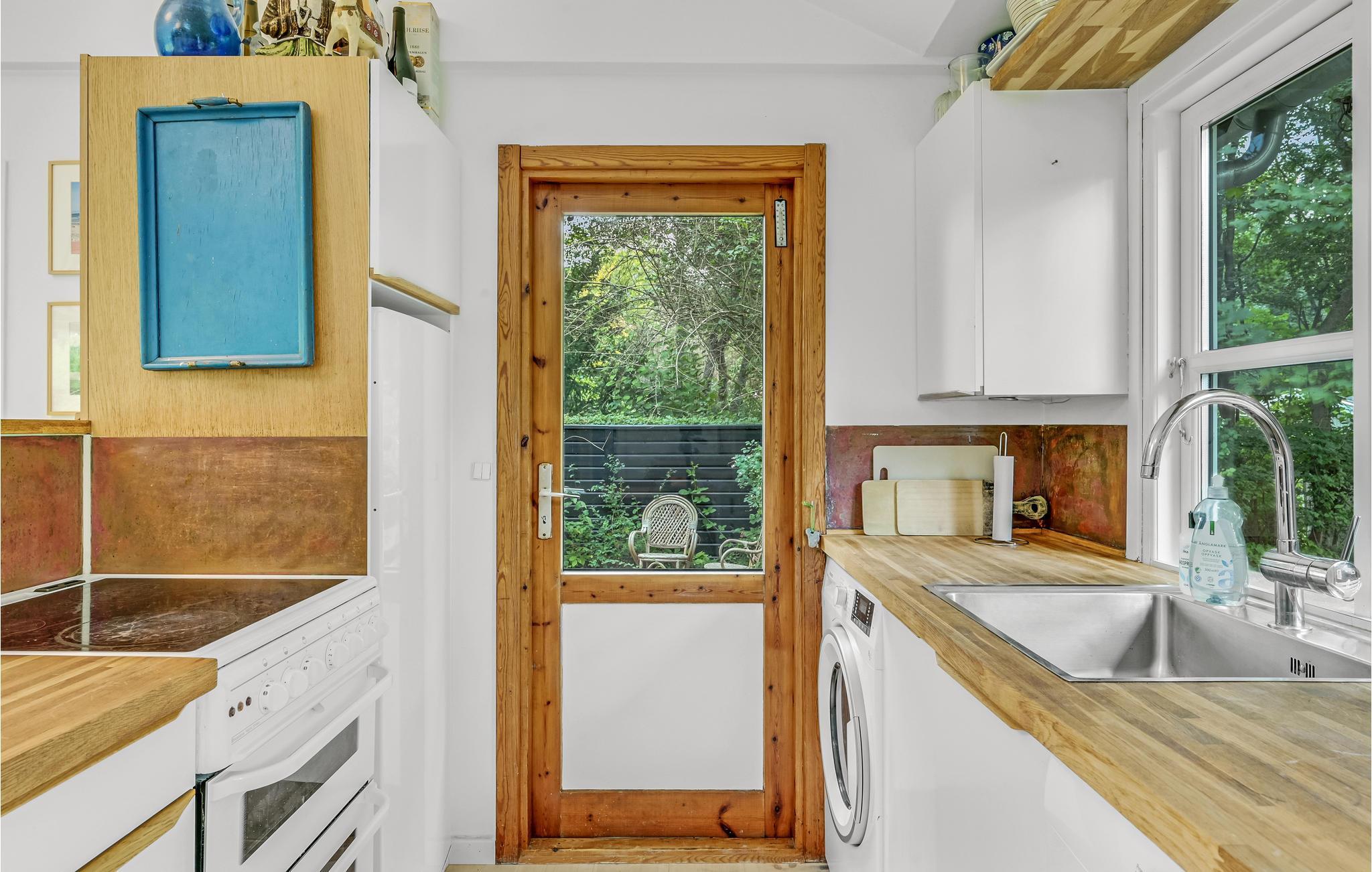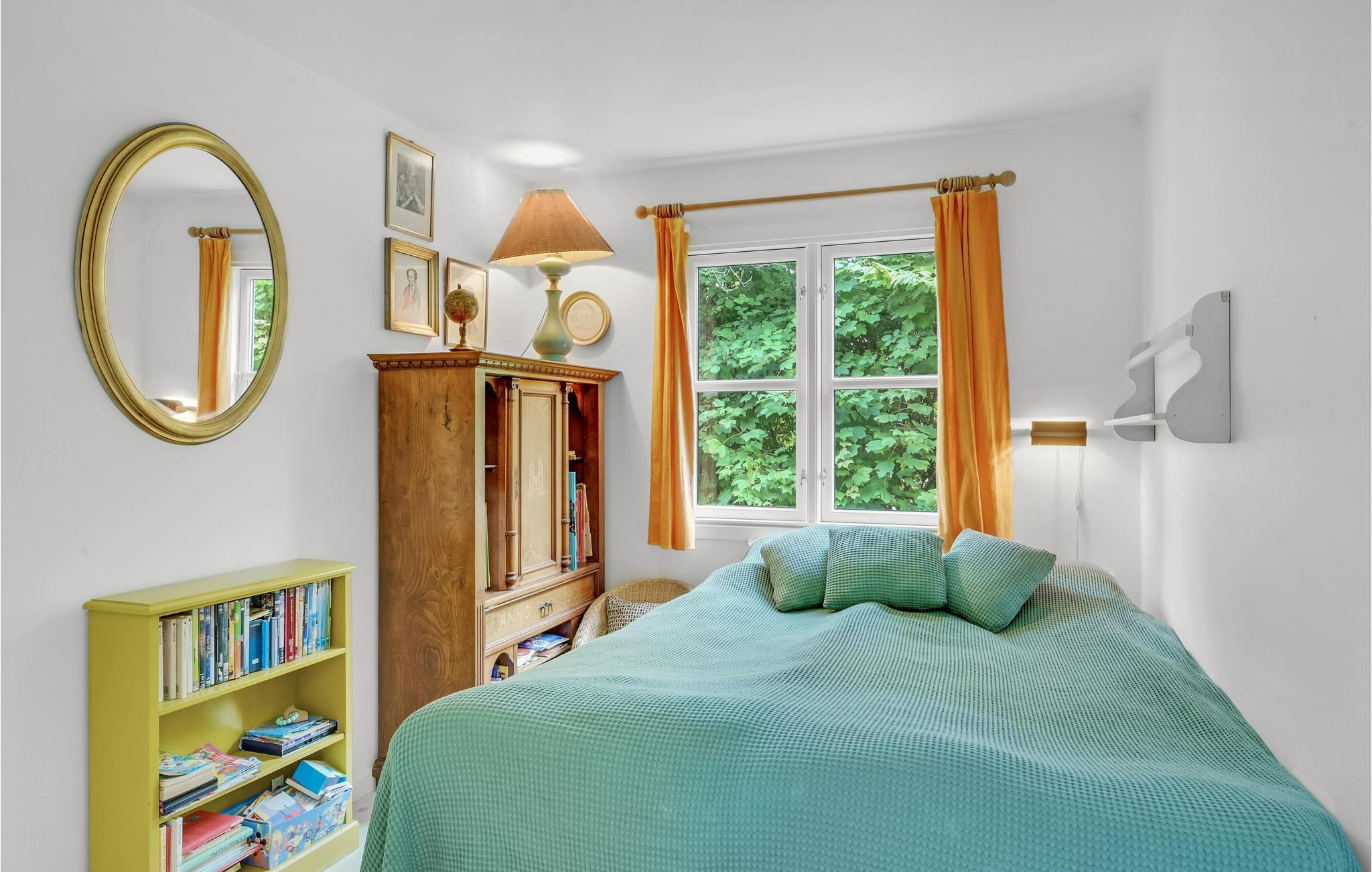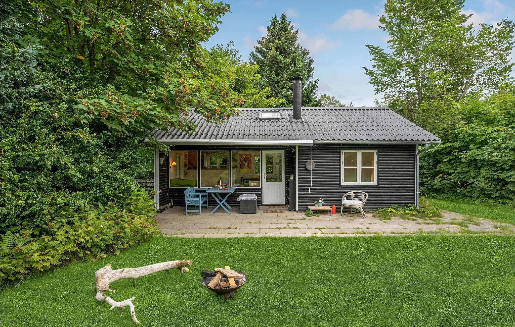 Huset har tre soveværelser, så her er der god plads til en familie. Rummene er hyggeligt og komfortabelt indrettede, og de store vinduer giver en dejlig udsigt til den grønne grund. I stuen er der lagt op til hyggelige aftener med spil eller en god bog, mens I nyder varmen fra brændeovnen.