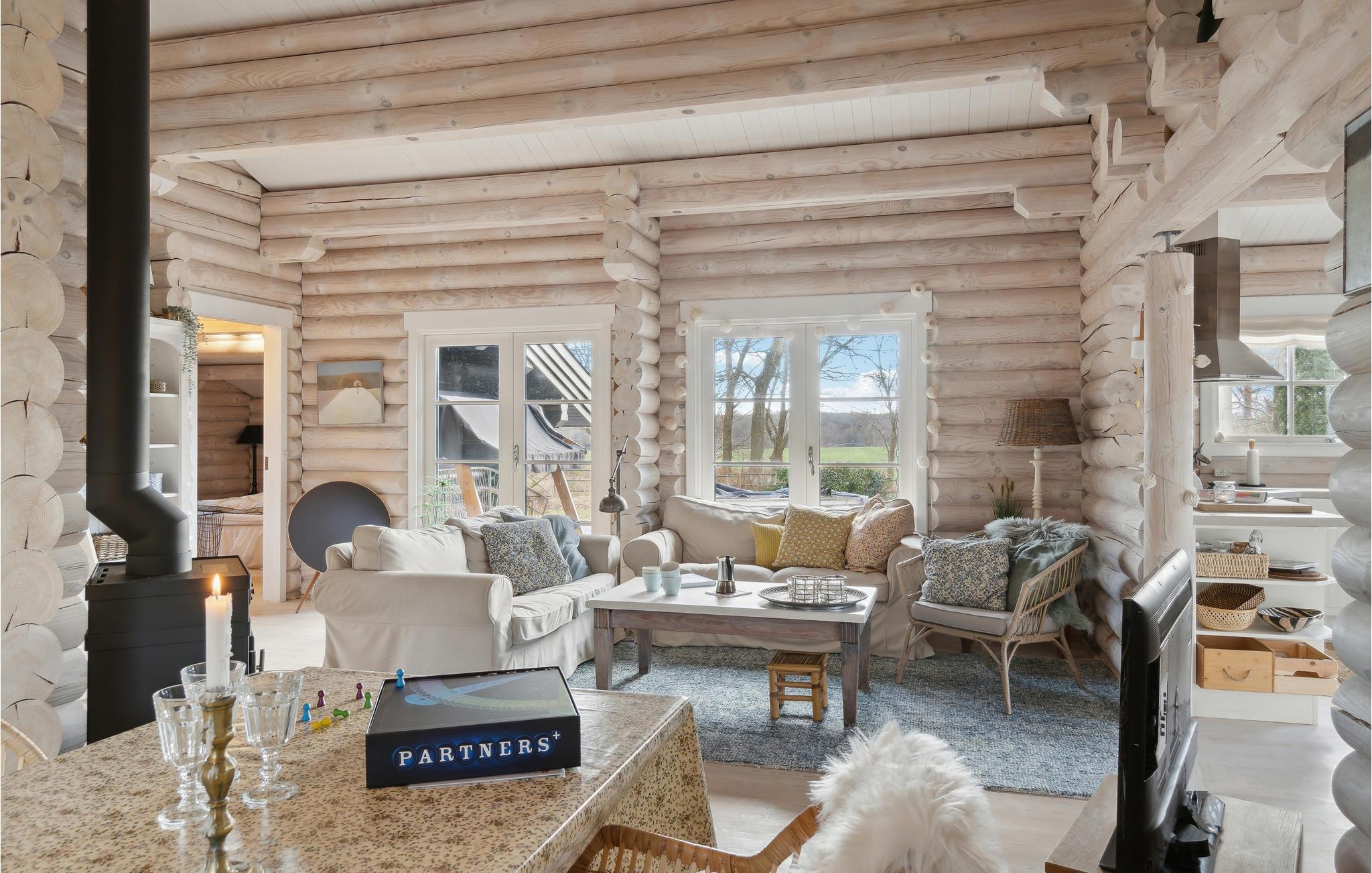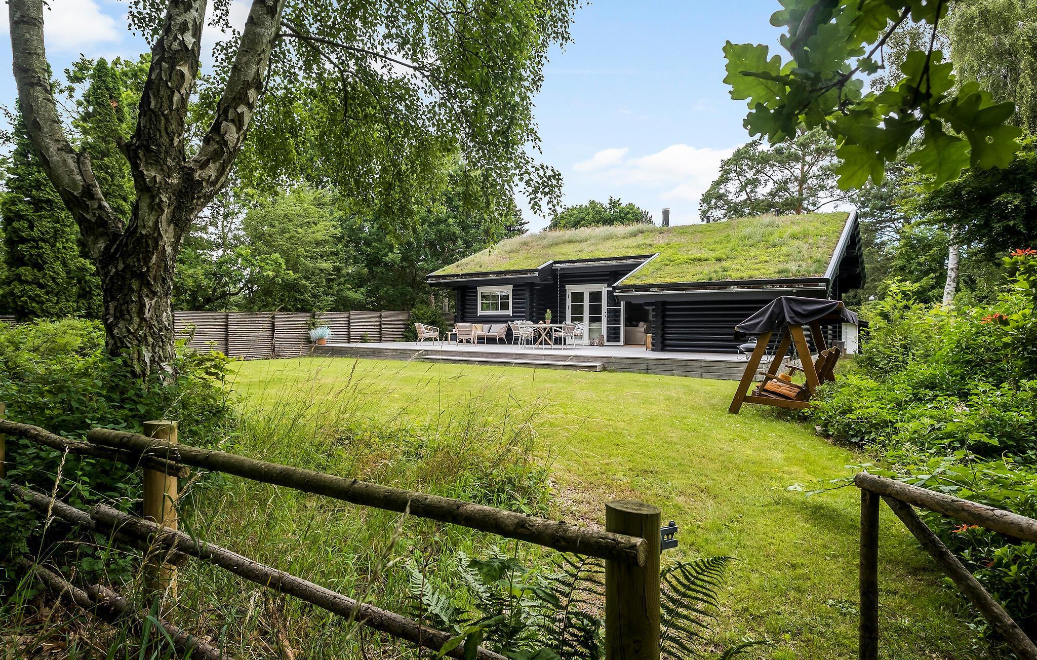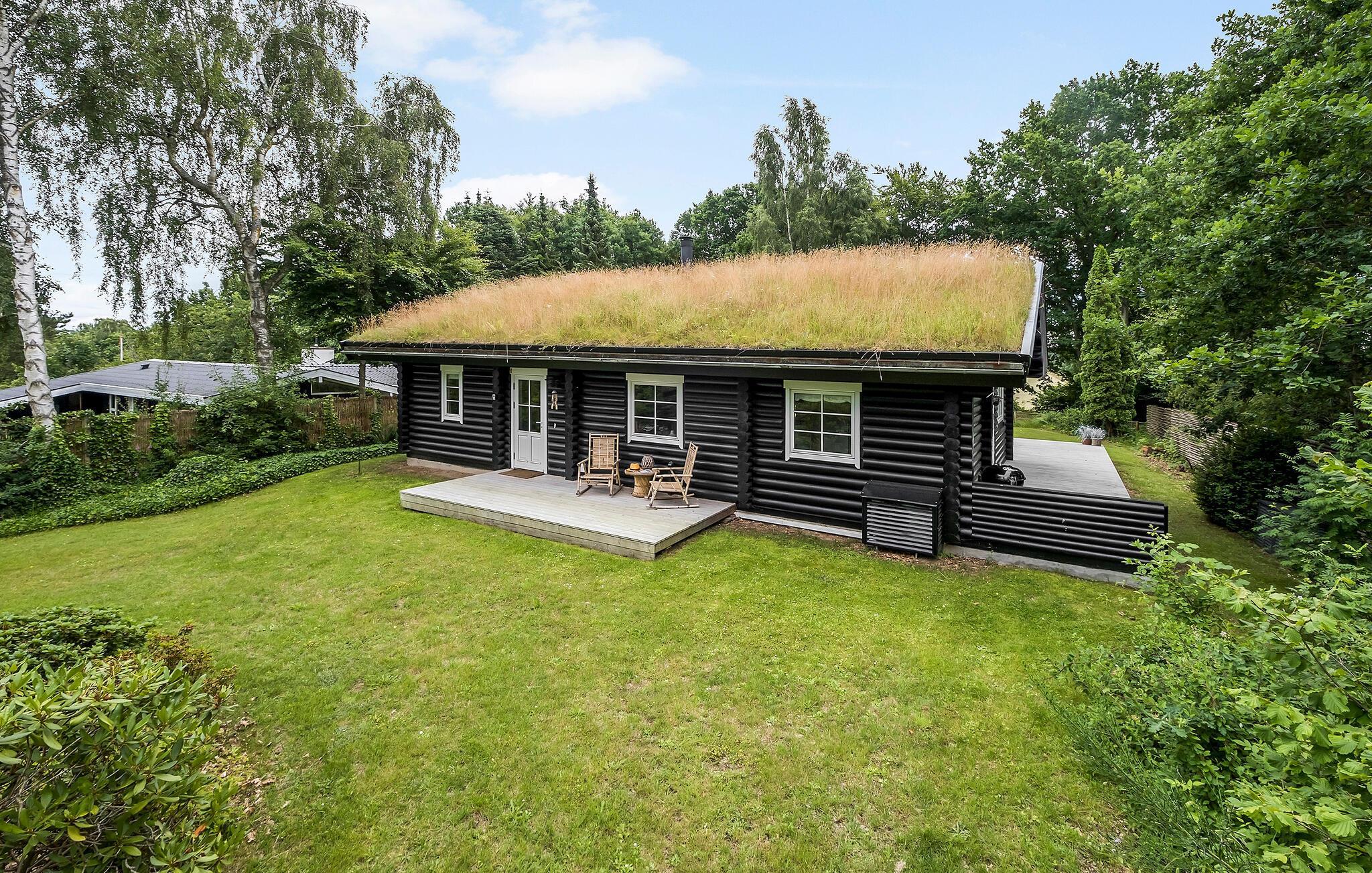 Charmerende bjælkehytte i Hornbæk med spabad, brændeovn og stor have i rolige omgivelser.