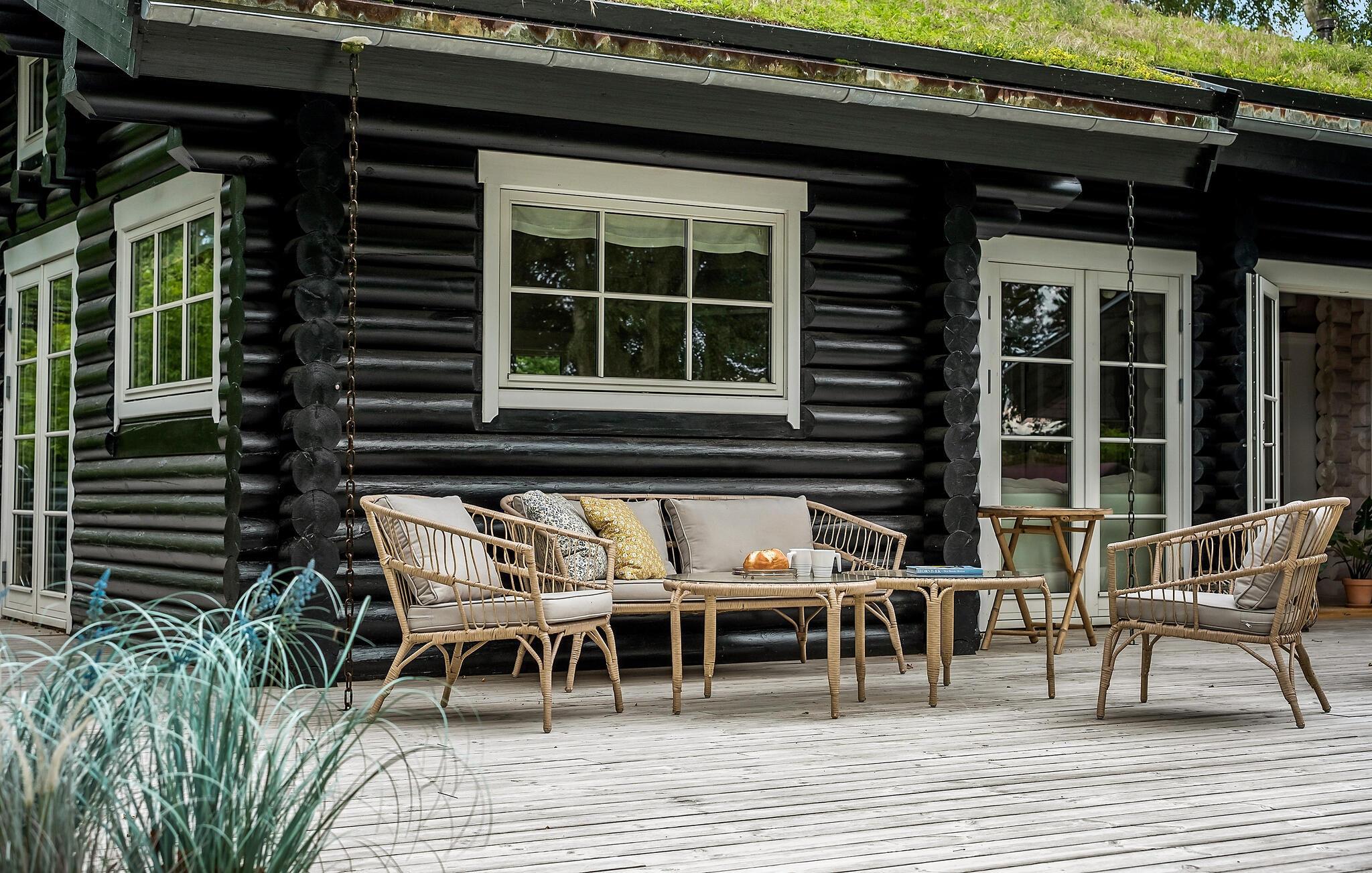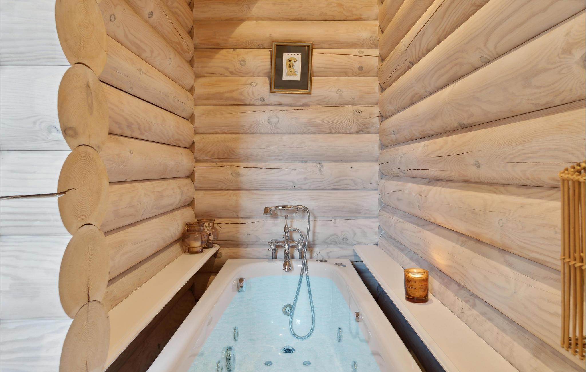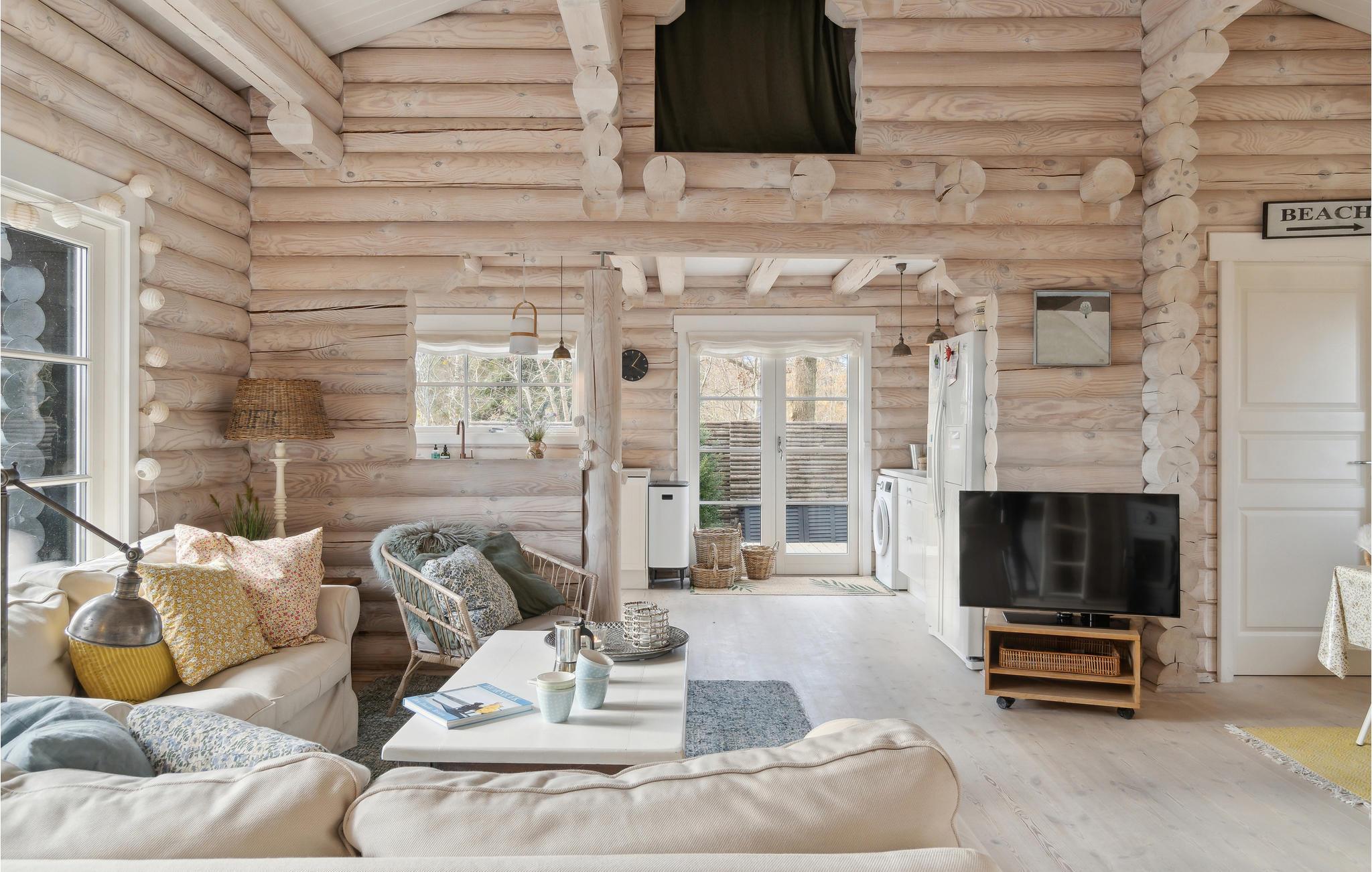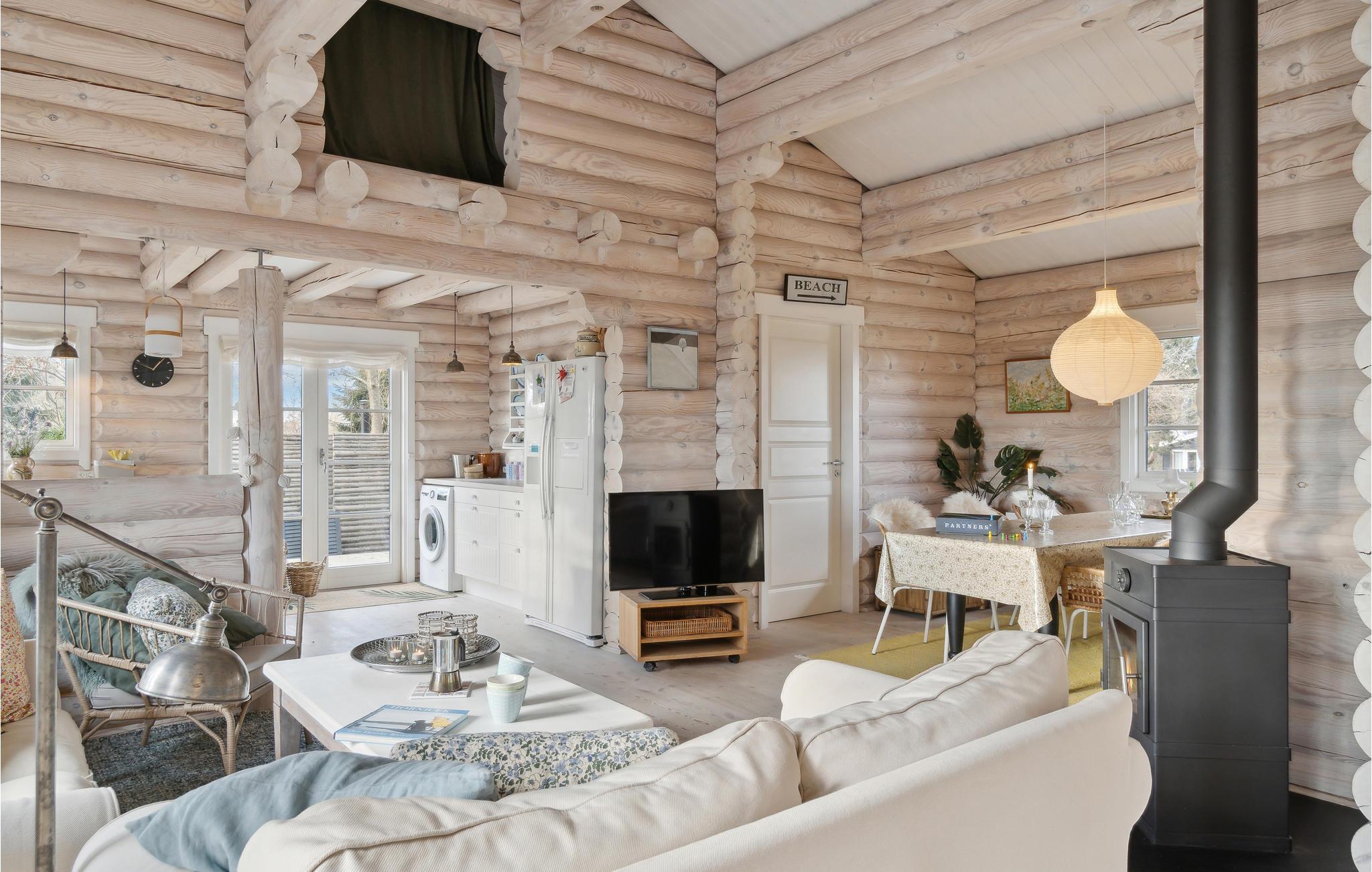 Charmerende bjælkehytte i Hornbæk med spabad, brændeovn og stor have i rolige omgivelser.