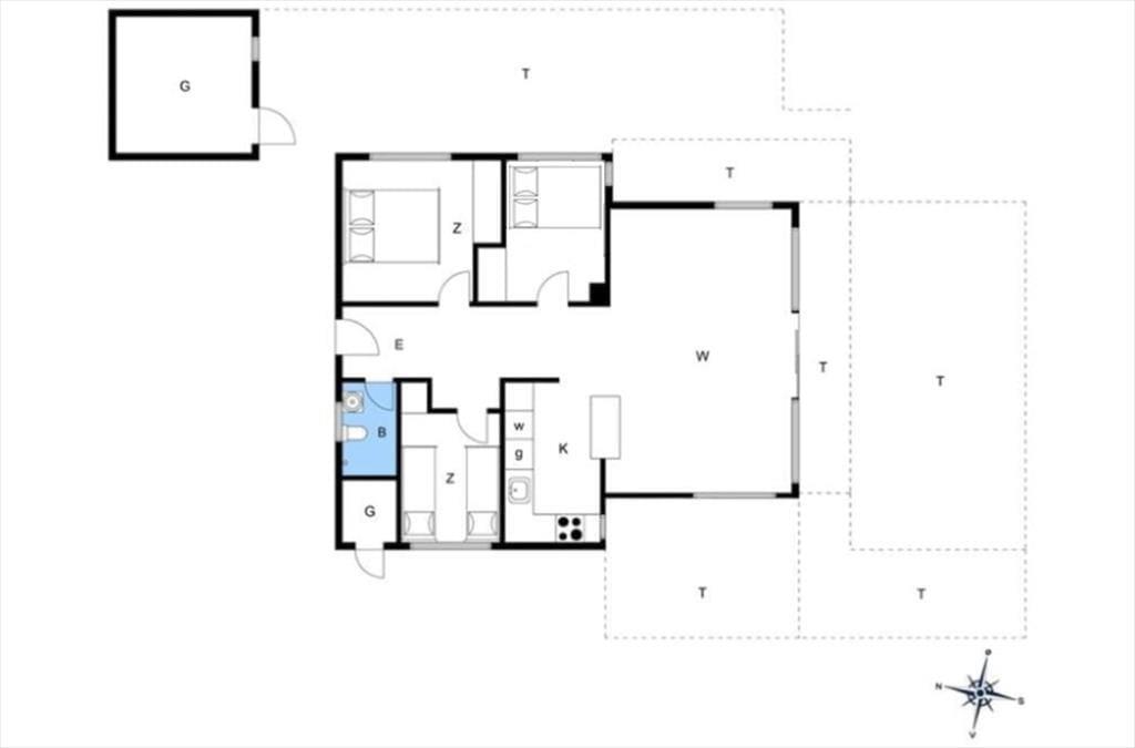 Huset indeholder en entré, der naturligt fører en videre til opholdsrummet med en fantastisk udsigt over haven og havet. Derudover er der et veludstyret køkken i åben forbindelse med stue med spiseplads og udgang til terrasse. Der er desuden et badeværelse og i alt tre soverum: et soveværelse med en dobbeltseng, et værelse med to enkeltsenge samt et værelse med en enkeltseng.
