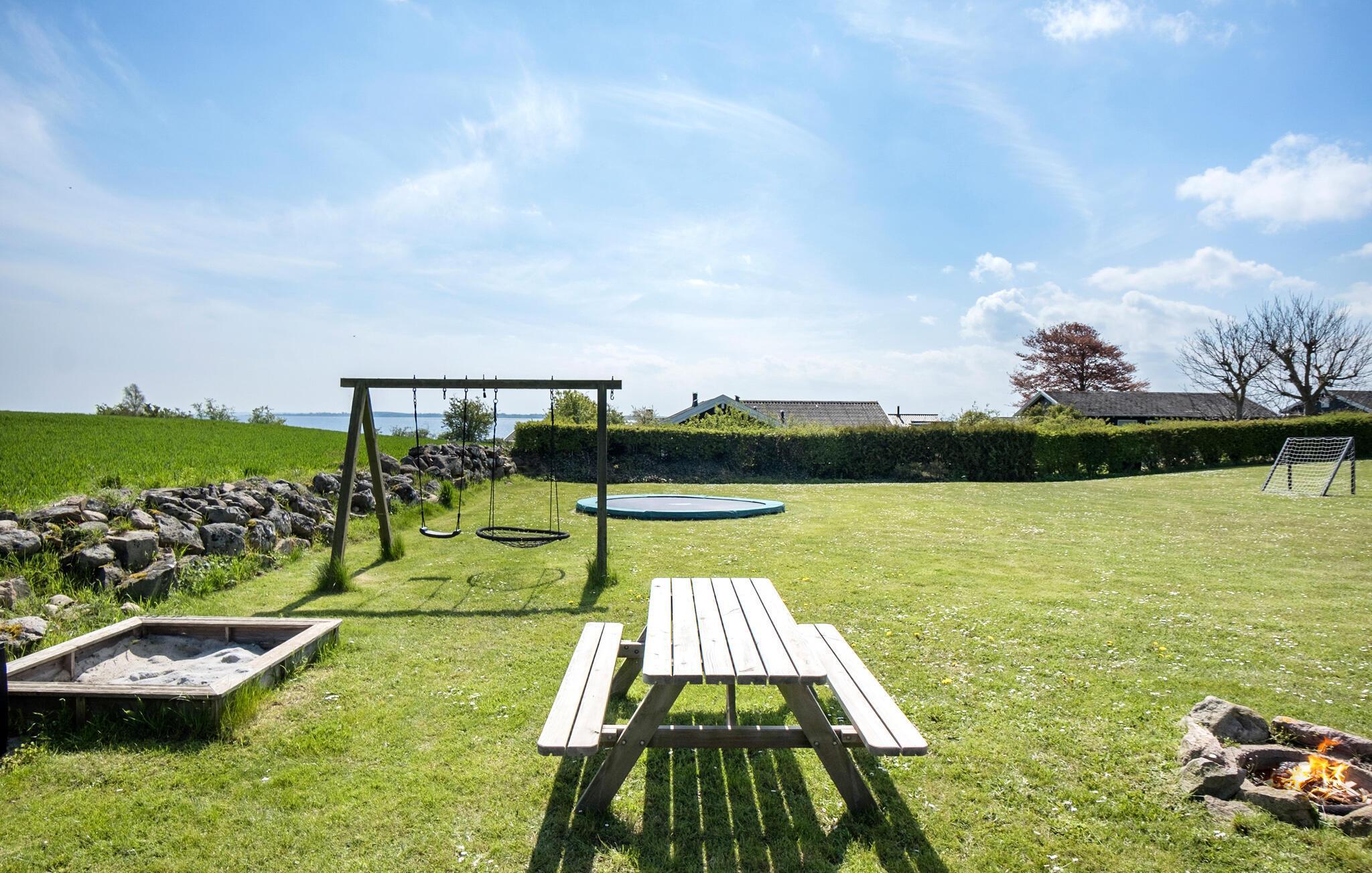 Udeområdet er tilsvarende dejligt. Huset ligger på en stor naturgrund med trampolin, gynge og sandkasse, hvor børnene kan boltre sig lige fra morgenstunden på de smukke sommerdage. Alt imens kan de voksne nyde solen på terrassen, nippe til en kølig drink og smide gode bøffer på grillen til en lækker aftensmad i det fri. Senere kan I sætte jer godt til rette ved den sagte ild ved bålpladsen, og for de særligt friske er der mulighed for at overnatte i shelteret på en stjerneklar nat.