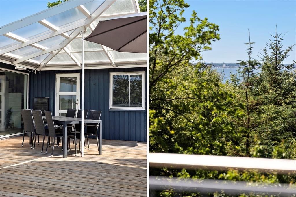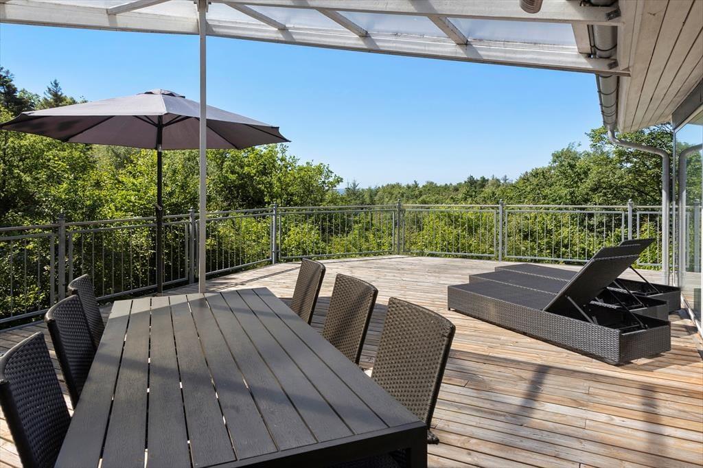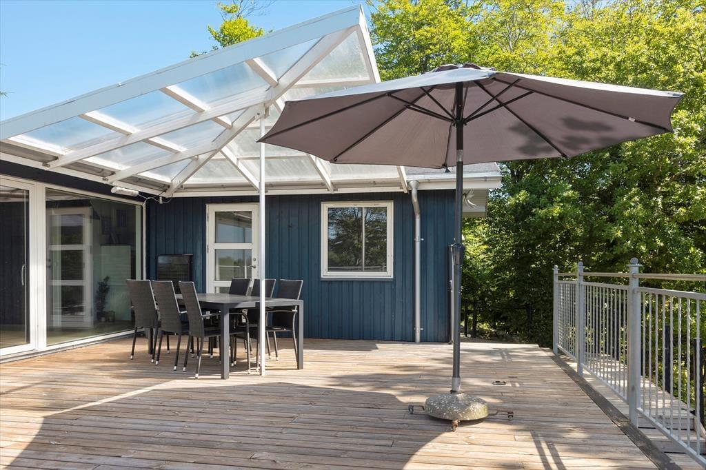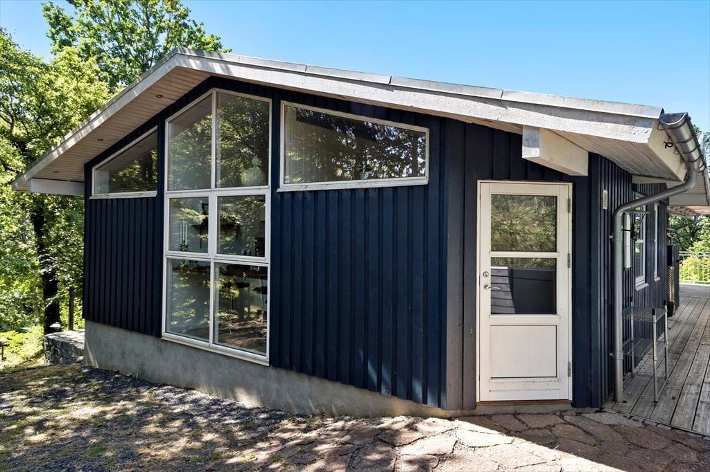 En af de største fordele ved dette sommerhus er den dejlige terrasse, der går næsten helt rundt om huset. Her kan du nyde solens stråler hele dagen. På den hyggelige terrasse kan du slænge dig i liggestolene og mærke roen sænke sig. Hvis du har lyst til at tage det et skridt videre, kan du hoppe i vildmarksbadet og lade varmen fra vandet lindre din træthed, mens du kigger ud på det naturskønne område. Om aftenen kan du nyde et glas vin under stjernerne, eller måske samles om et måltid på terrassen og nyde den friske luft.
