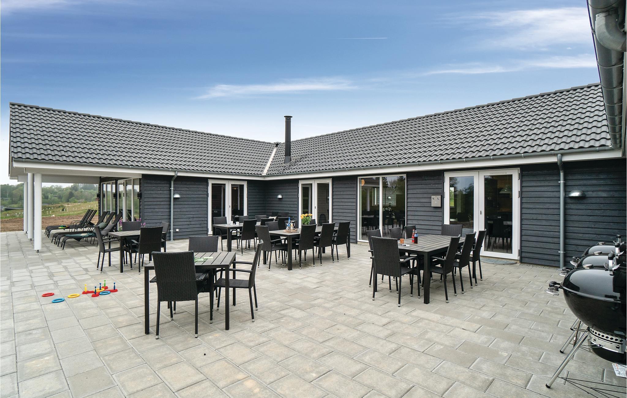 Stort feriehus ved Hostrup Strand med pool, sauna, aktivitetsrum og plads til mange gæster.