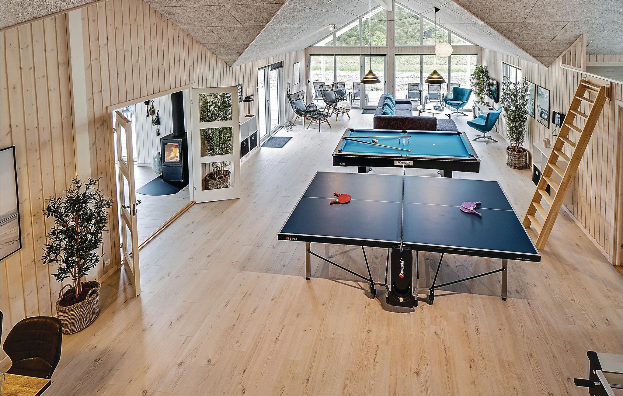 Uanset vejr og årstid har I mulighed for en aktivitetsfyldt ferie. Her har I nemlig et stort aktivitetsrum, der er udstyret med billardbord, Playstation 4, bordtennis, dart og bordfodbold. Giv den gas med spillene og nyd en kold forfriskning i husets helt egen bar med køleskab, som også befinder sig i aktivitetsrummet.