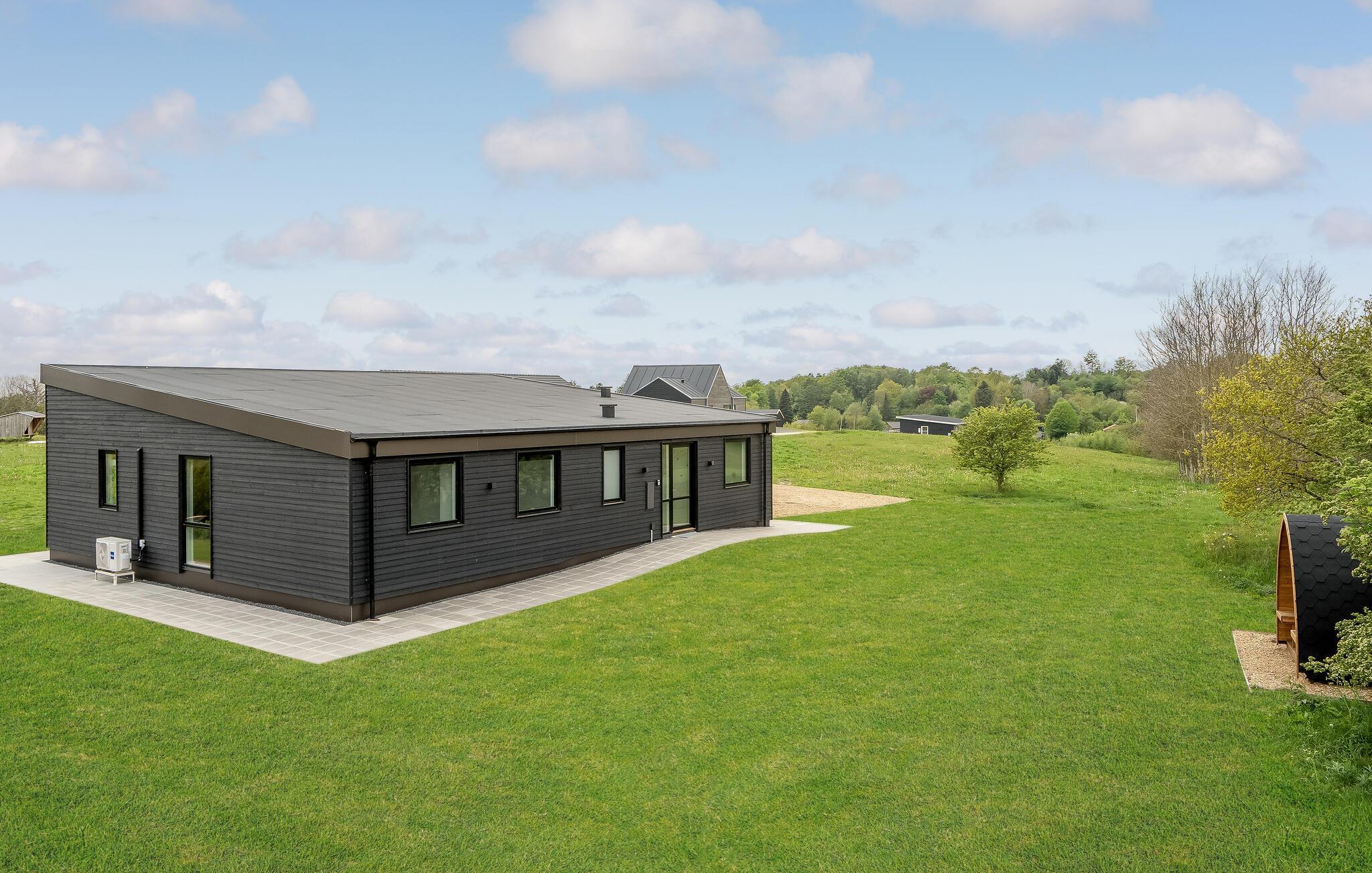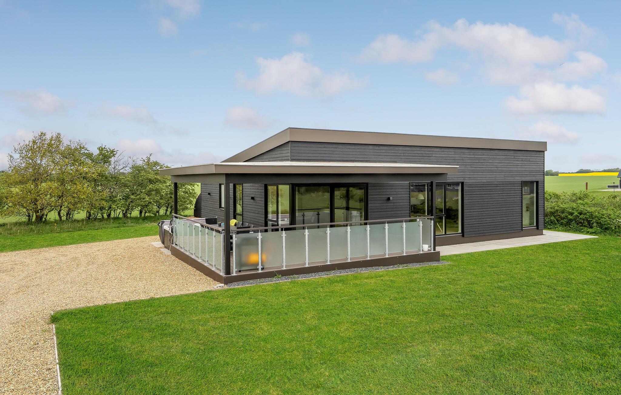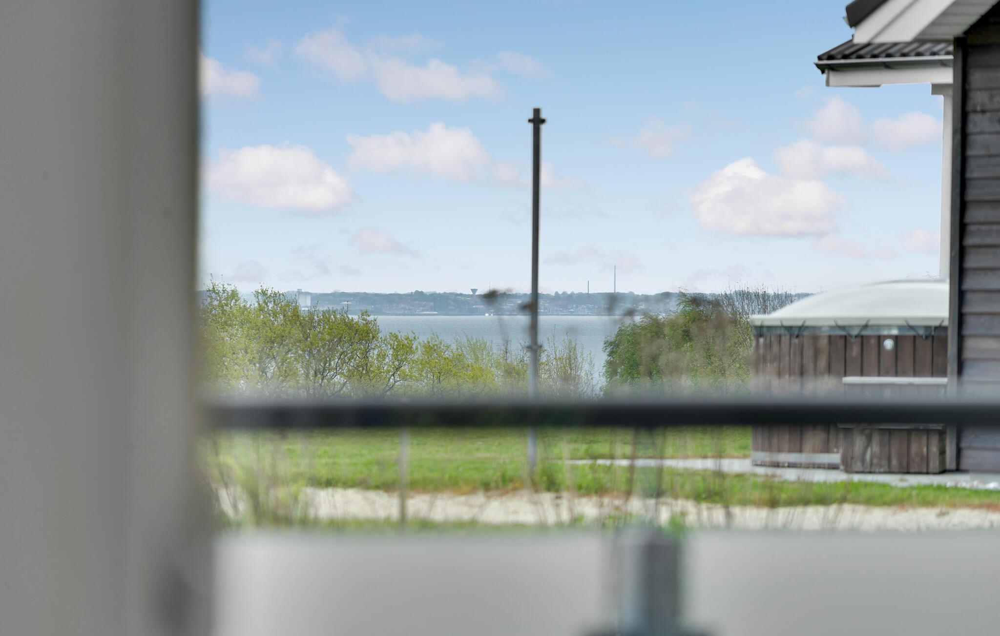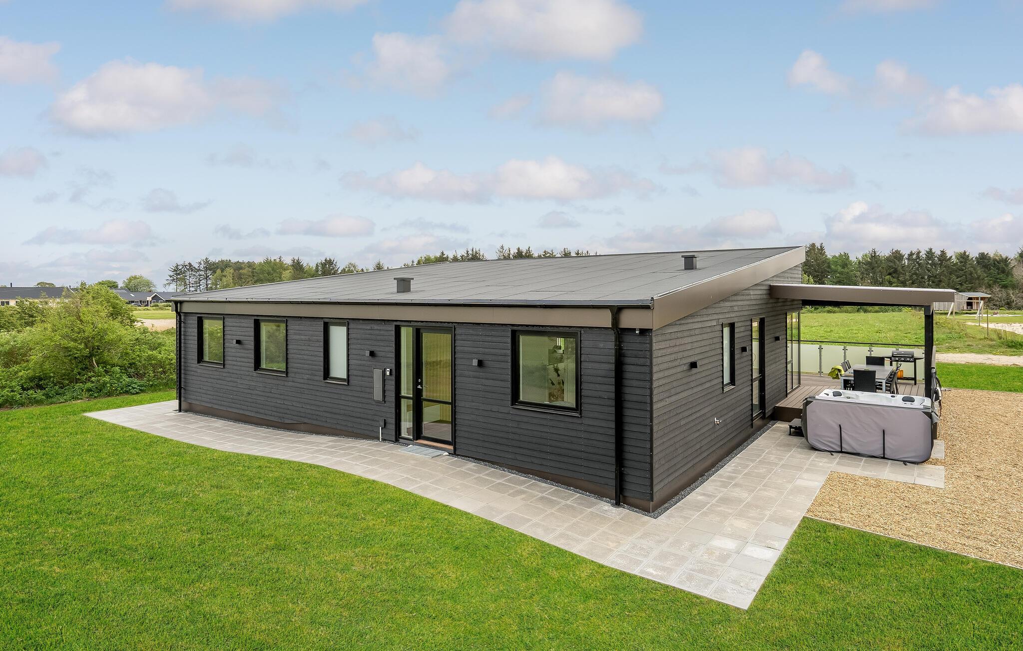 Moderne feriehus ved Hostrup Strand med fjordudsigt, aktivitetsrum, spabad og overdækket terrasse til en afslappende familieferie.