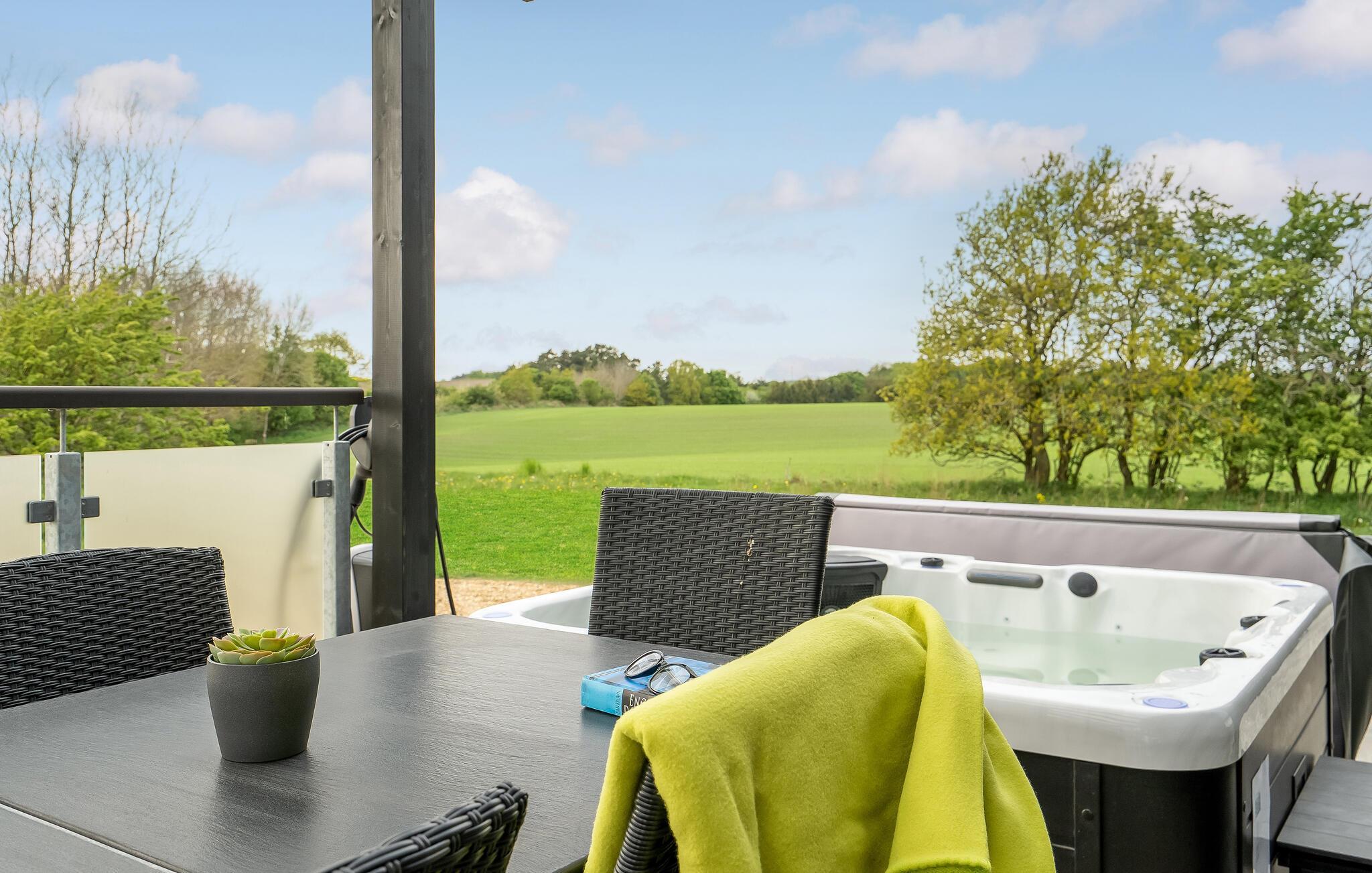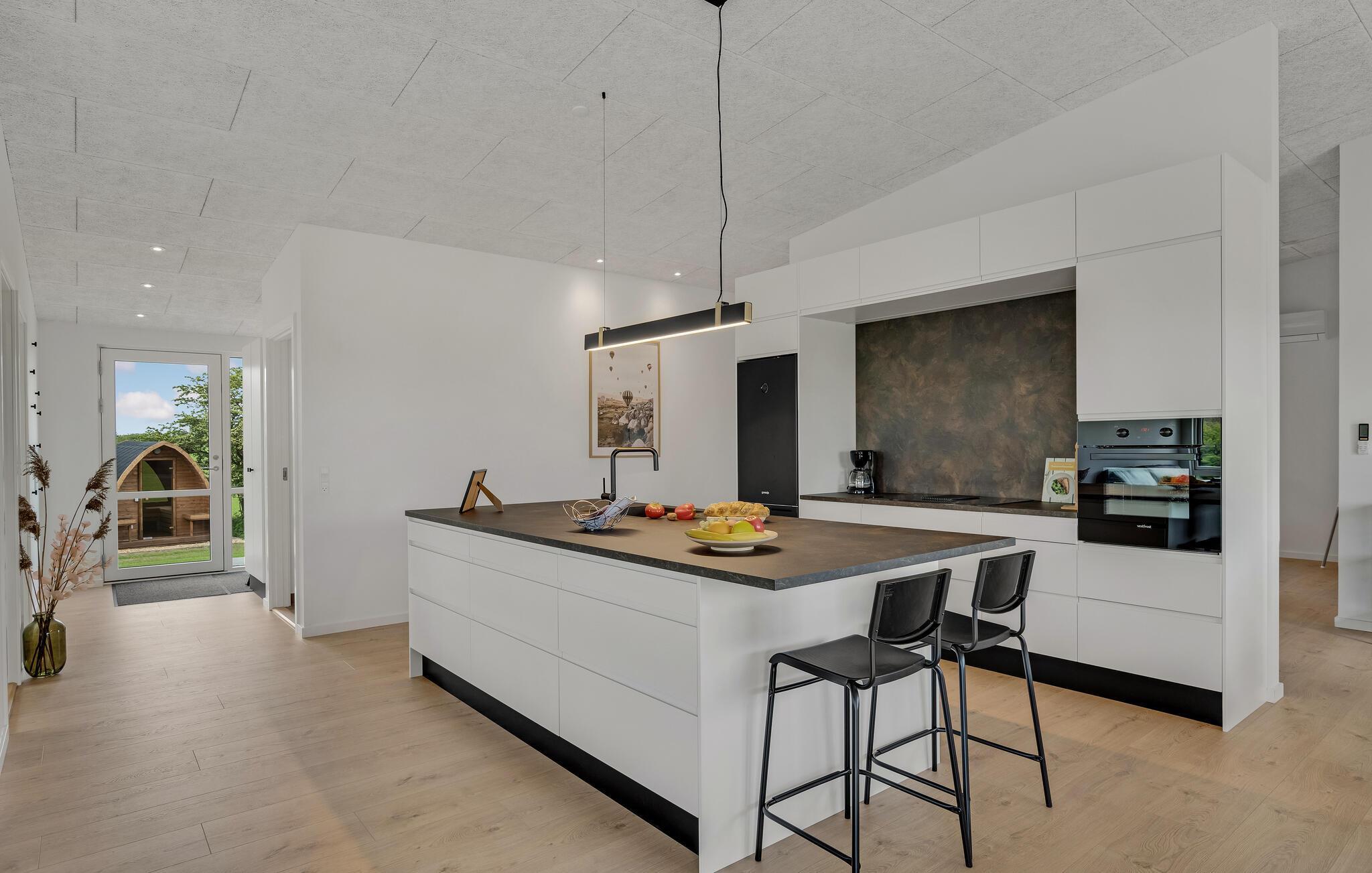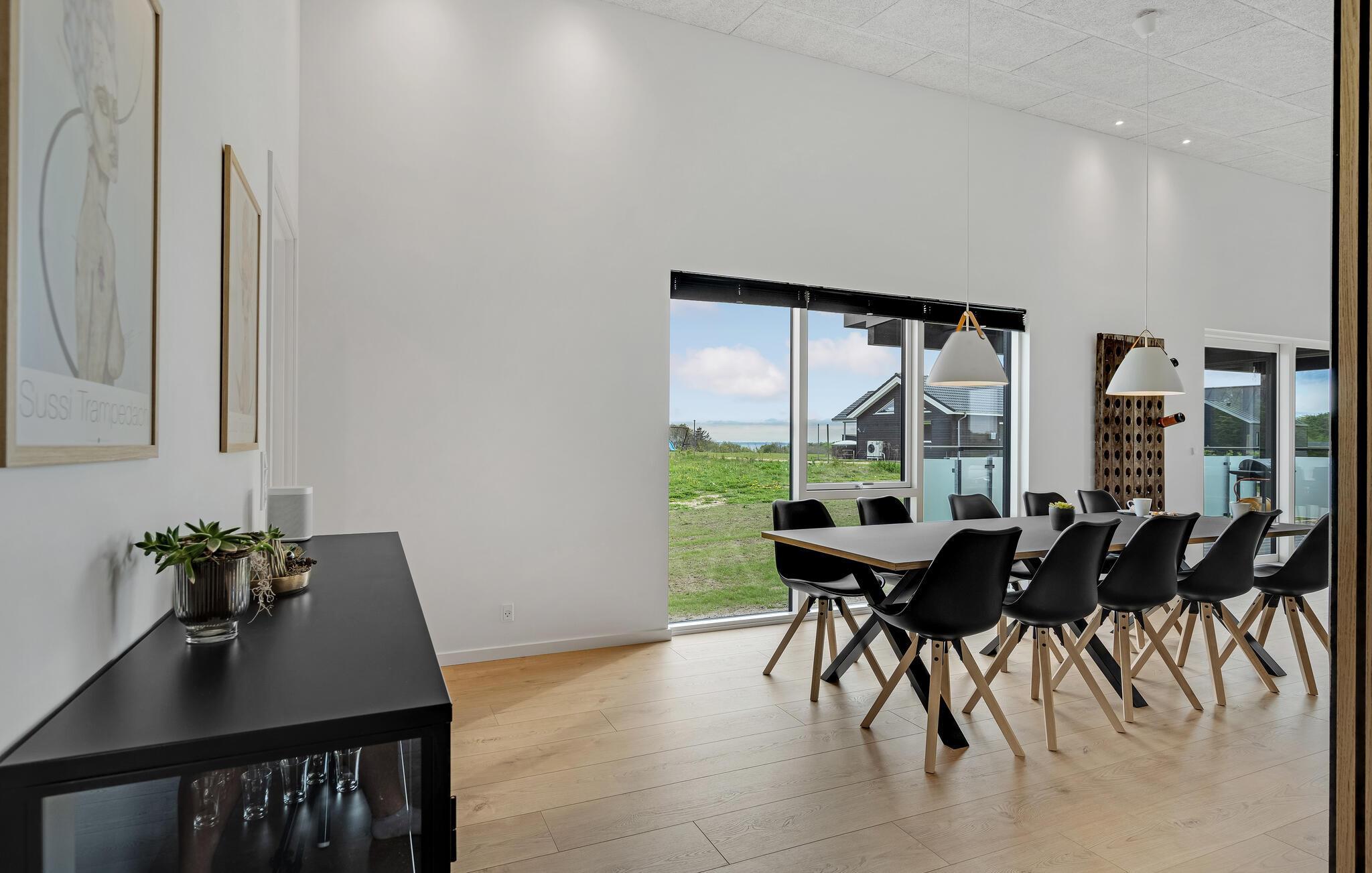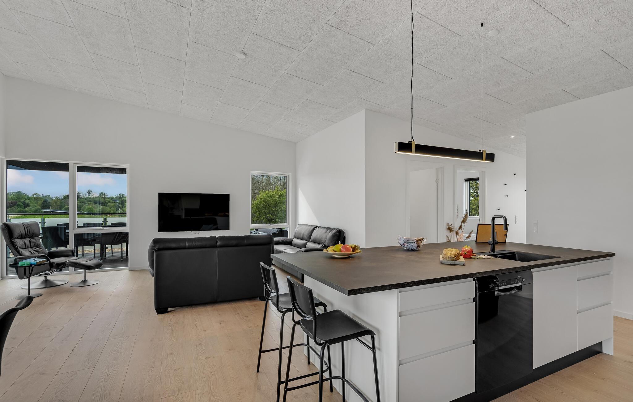 Moderne feriehus ved Hostrup Strand med fjordudsigt, aktivitetsrum, spabad og overdækket terrasse til en afslappende familieferie.