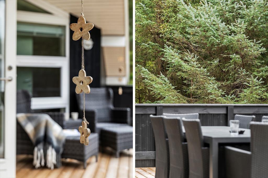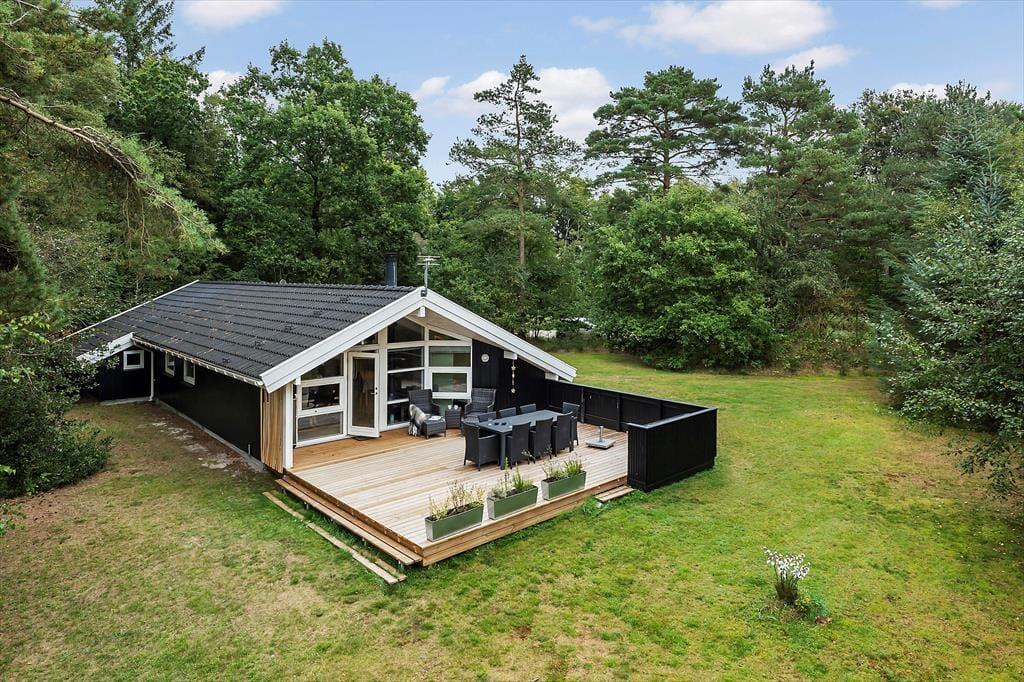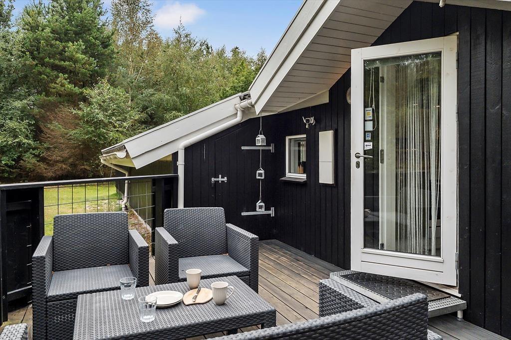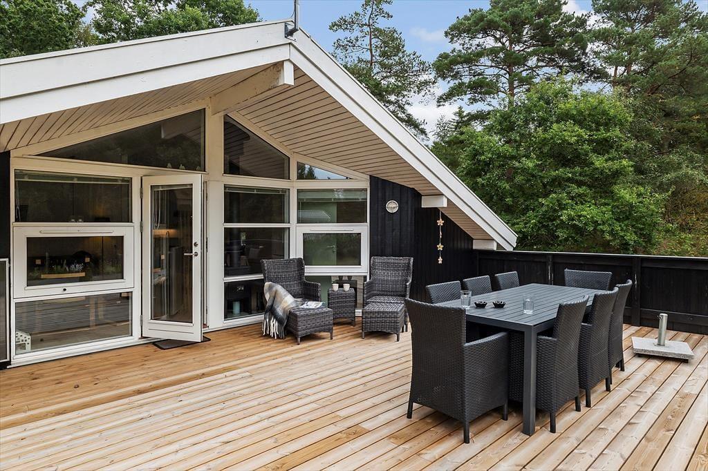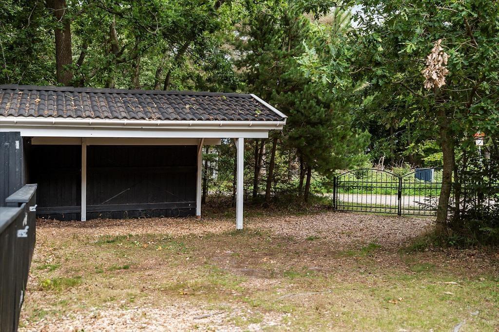 Huset ligger på en naturgrund, men der er rigelig plads til grillhygge og solbadning på husets store åbne og delvist overdækkede terrasser. Den ene terrasse er indhegnet, praktisk hvis man har husdyr eller mindre børn med. Der er en carport ved huset, så også bilen kan blive forkælet lidt på ferien. Der er desuden sandkasse til glæde for børn og barnlige sjæle.