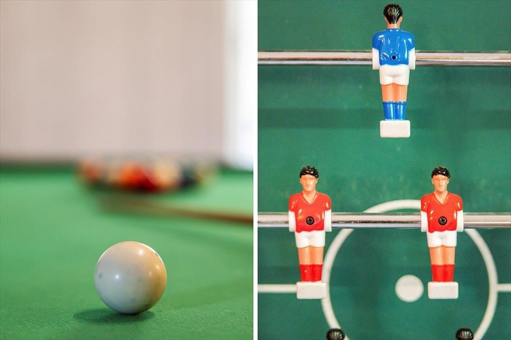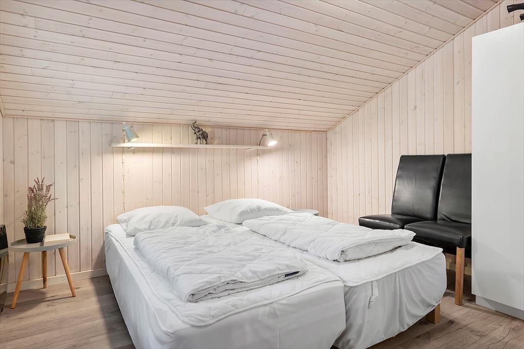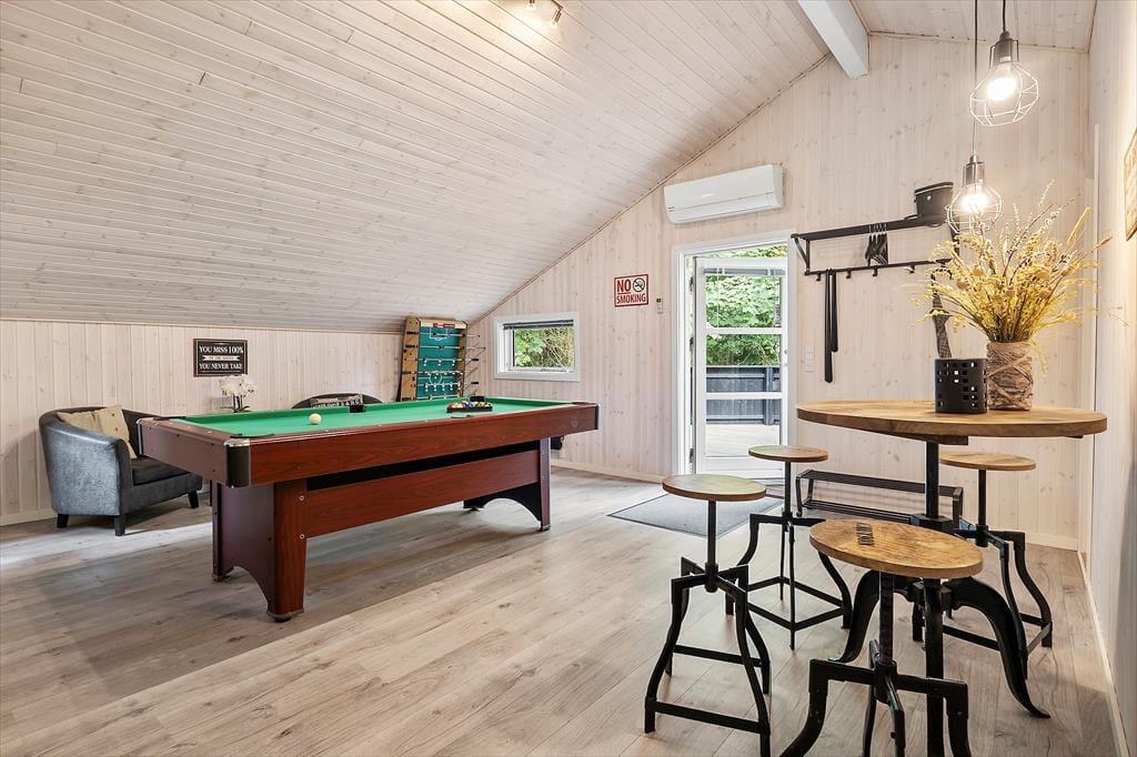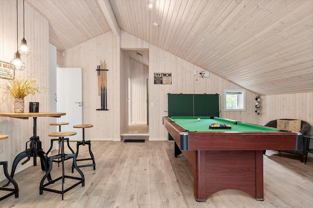 Du træder ind i den nye afdeling af huset, som består af et stort, flot indrettet aktivitetsrum med poolbord, bordfodbold og bordtennisbord samt et cafebord med høje barstole. Herfra er der desuden adgang til et stort soveværelse med dobbeltseng, samt til husets gæstetoilet. Der er adgang til resten af huset via en gang, som ender i husets køkken, som er åbent mod husets lyse spisestue og stue. Via gangen kommer du også forbi det store badeværelse. Huset er flot og moderne indrettet og byder på absolut gode rammer for ferien!