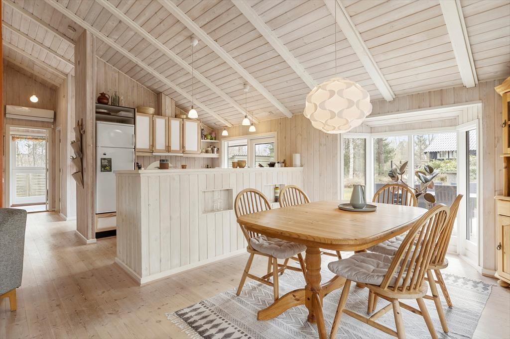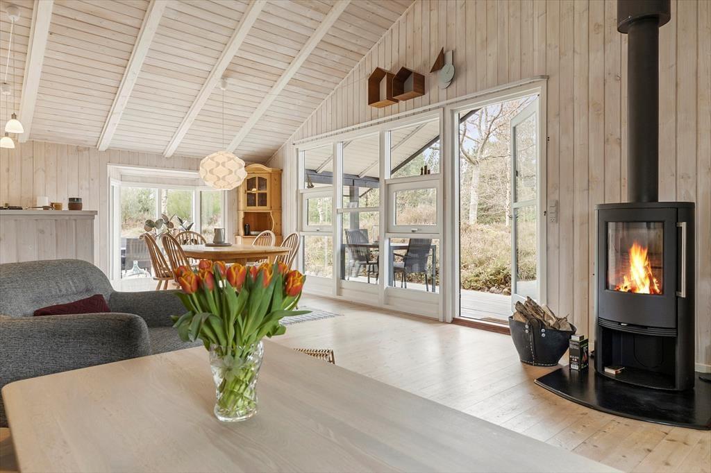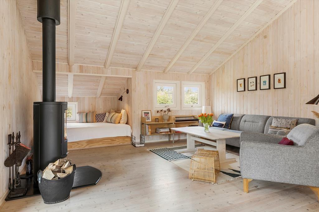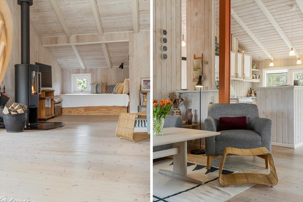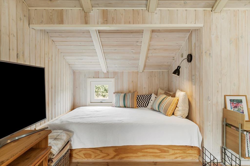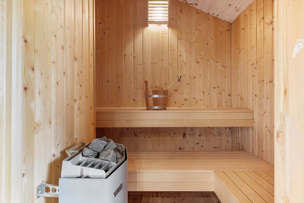 Det første, man bemærker, når man træder ind i sommerhuset, er den lyse og venlige atmosfære. Træbeklædningen på væggene skaber en varm og hyggelig stemning, og med store vinduespartier strømmer dagslyset ind i rummene. Her får du en skøn base, hvor det er nemt at koble af fra hverdagen og finde roen med dem, du holder af. Midt i huset samles opholdsstue og køkken til et hjerterum, hvor der er plads til samtaler over middagsmaden, afslappende stunder i sofaen og hyggelige brætspilsaftener. På de køligere dage kan I forkæle jer selv med lidt ekstra selvforkælelse – saunaen står klar og giver jer den ultimative følelse af ferie og velvære. Og når børnene er faldet i søvn, kan I nyde stilheden med en kop te eller et glas vin og høre vinden suse blidt i træerne udenfor.