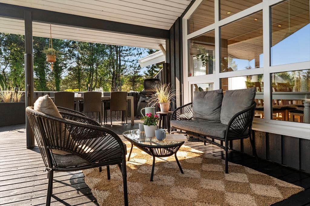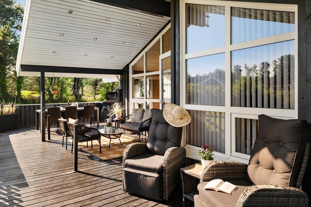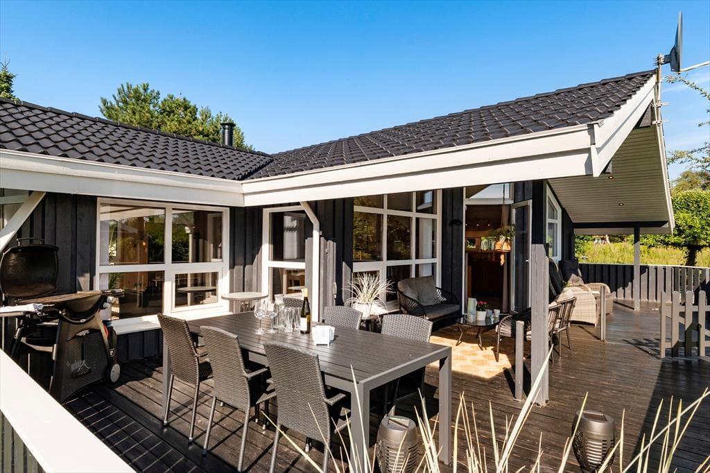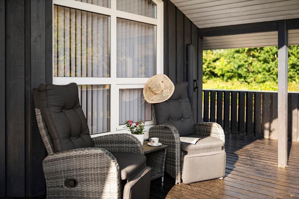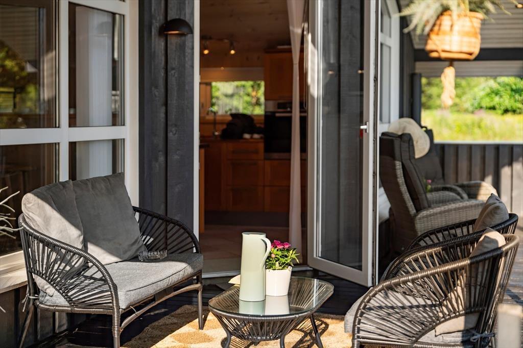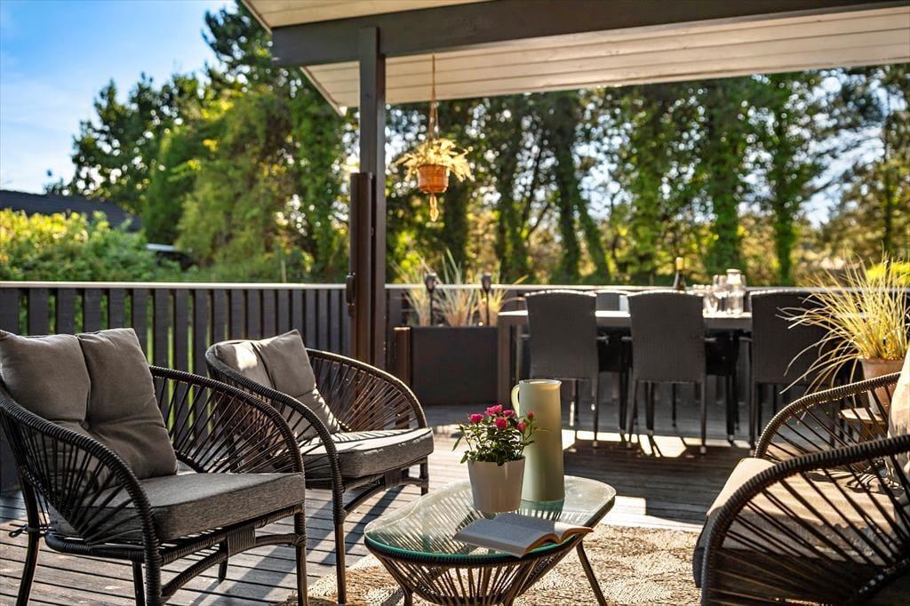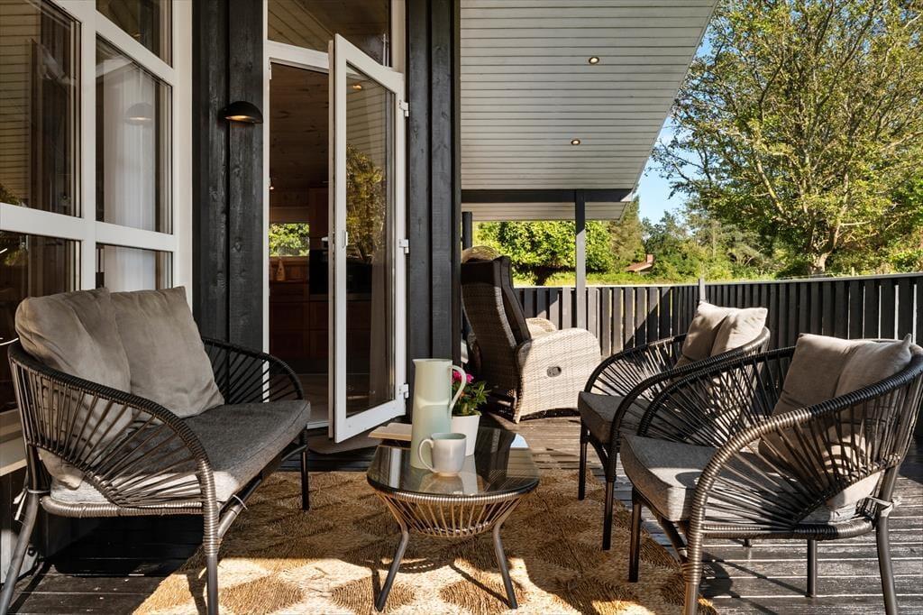 Sommerhuset har en stor terrasse, der både er åben og delvist overdækket, så du kan vælge, om du vil sidde i solen eller søge skygge. Forestil dig en stille morgen med morgenmaden rykket ud på terrassen, mens duggen stadig ligger på græsset, eller en varm sommeraften med grillhygge og lyden af bølgerne i baggrunden. De grønne omgivelser indbyder til afslapning og leg – børnene kan boltre sig på græsplænen, mens de voksne læner sig tilbage i havemøblerne med en god bog. Når mørket falder på, skaber terrasseområdet en helt særlig stemning med sit rolige og private udtryk.