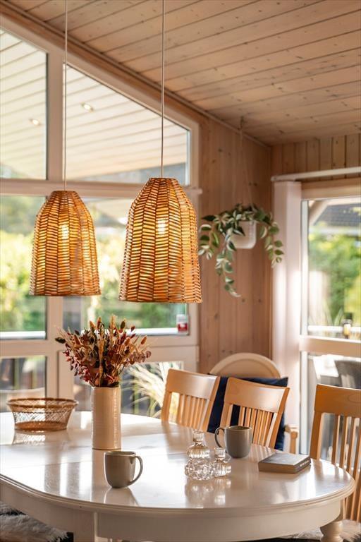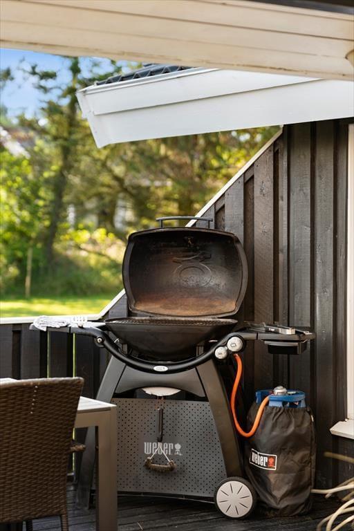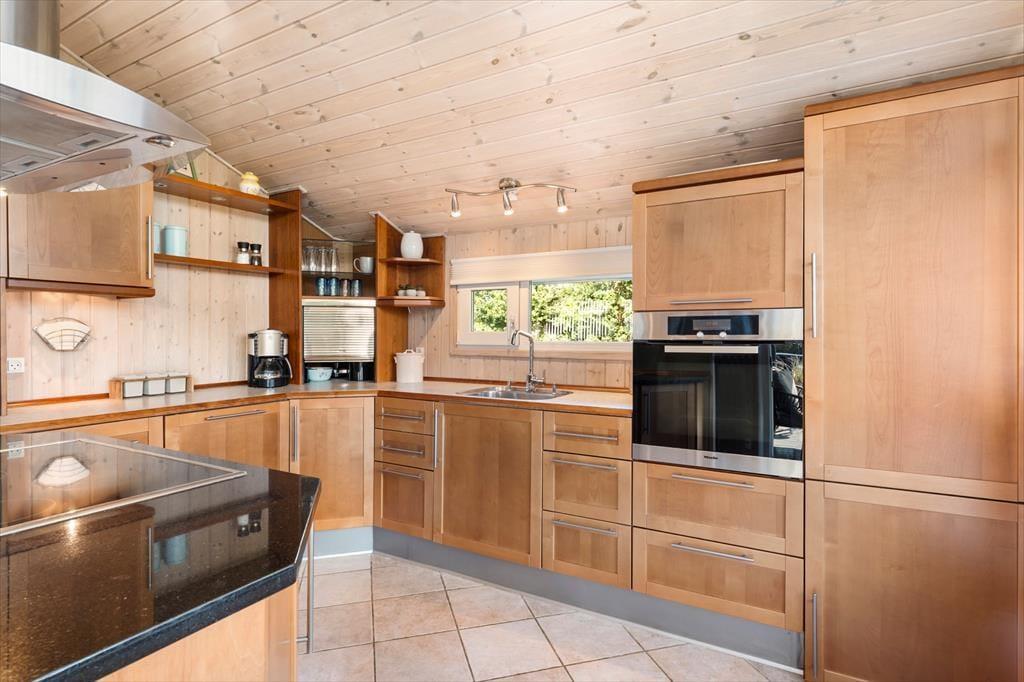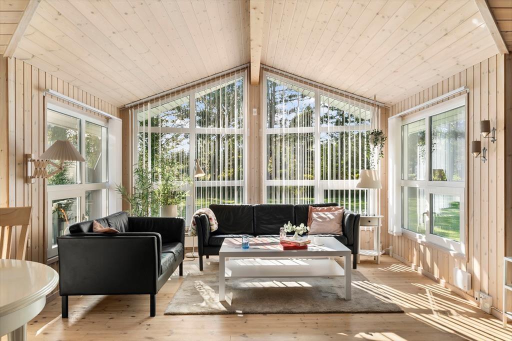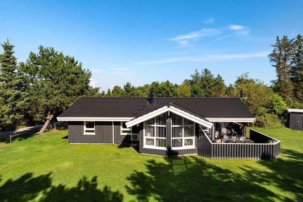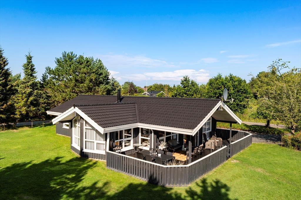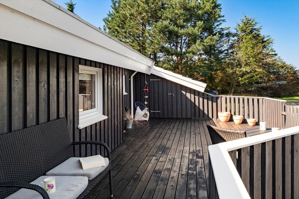 Sommerhuset har en stor terrasse, der både er åben og delvist overdækket, så du kan vælge, om du vil sidde i solen eller søge skygge. Forestil dig en stille morgen med morgenmaden rykket ud på terrassen, mens duggen stadig ligger på græsset, eller en varm sommeraften med grillhygge og lyden af bølgerne i baggrunden. De grønne omgivelser indbyder til afslapning og leg – børnene kan boltre sig på græsplænen, mens de voksne læner sig tilbage i havemøblerne med en god bog. Når mørket falder på, skaber terrasseområdet en helt særlig stemning med sit rolige og private udtryk.