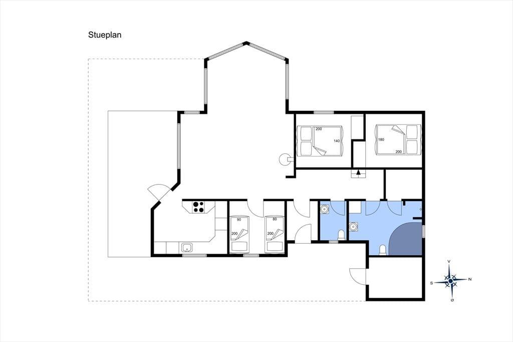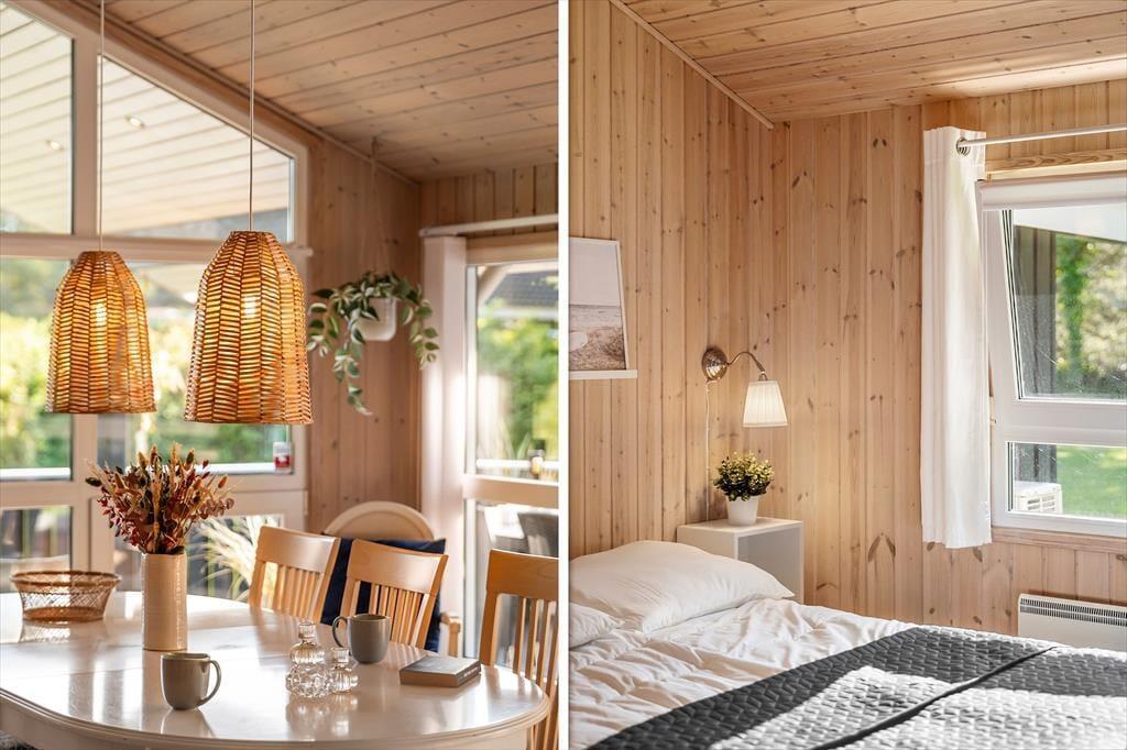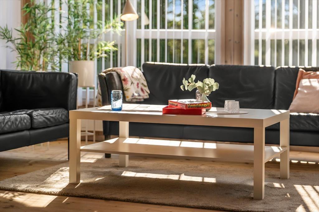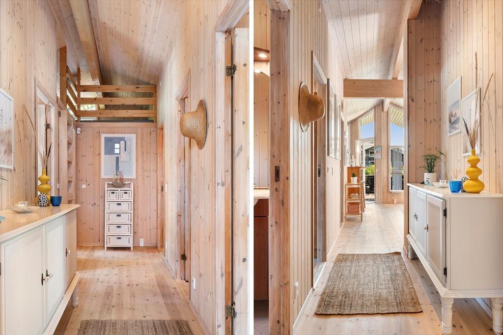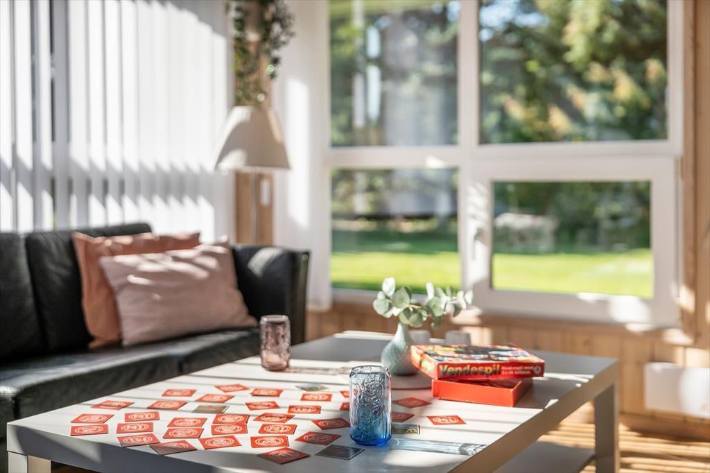 Når du træder ind i sommerhuset, mødes du af en lys og indbydende atmosfære, hvor rummene er indrettet med fokus på hygge og funktionalitet. Store vinduespartier lukker lyset ind og skaber en naturlig forbindelse til naturen udenfor, så du hele tiden fornemmer, at du er tæt på kysten. Det store badeværelse er en særlig luksus med spa og sauna – perfekt til en stille stund efter en frisk gåtur langs stranden. Samlingspunktet i huset er den åbne stue med køkken og spiseområde, hvor I kan tilbringe timer med fælles madlavning, brætspil og lange samtaler, mens duften af frisklavet kaffe breder sig.