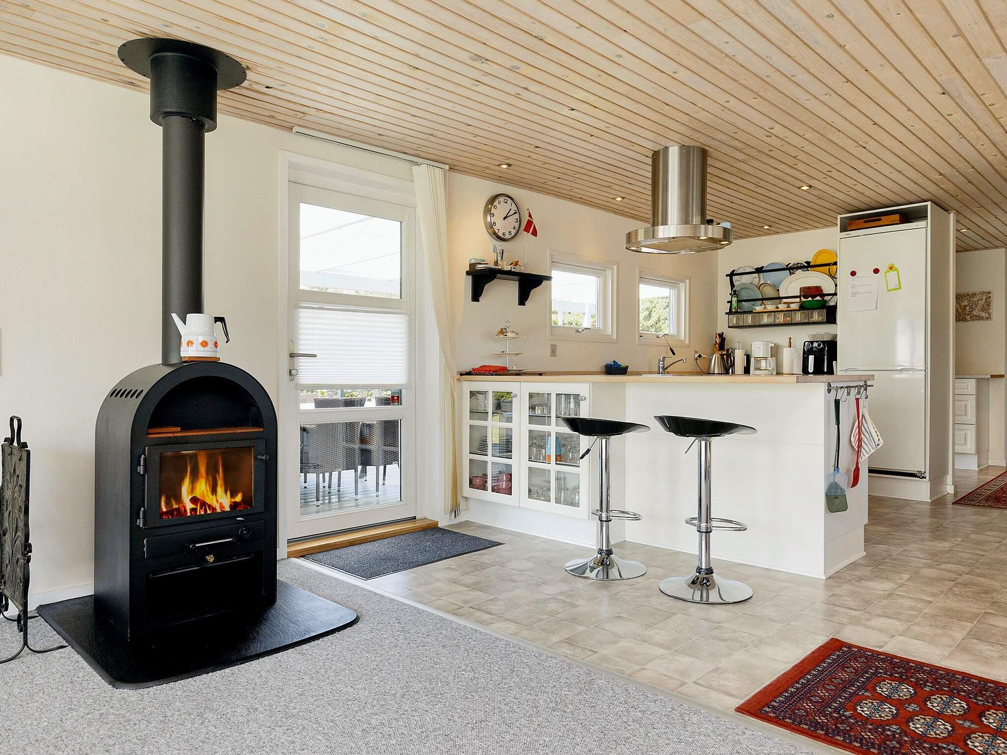 1 Opholdsstue: Brændeovn, stereoanlæg med cd, dvd-afspiller, Chromecast, tv, parabol, høj stol
