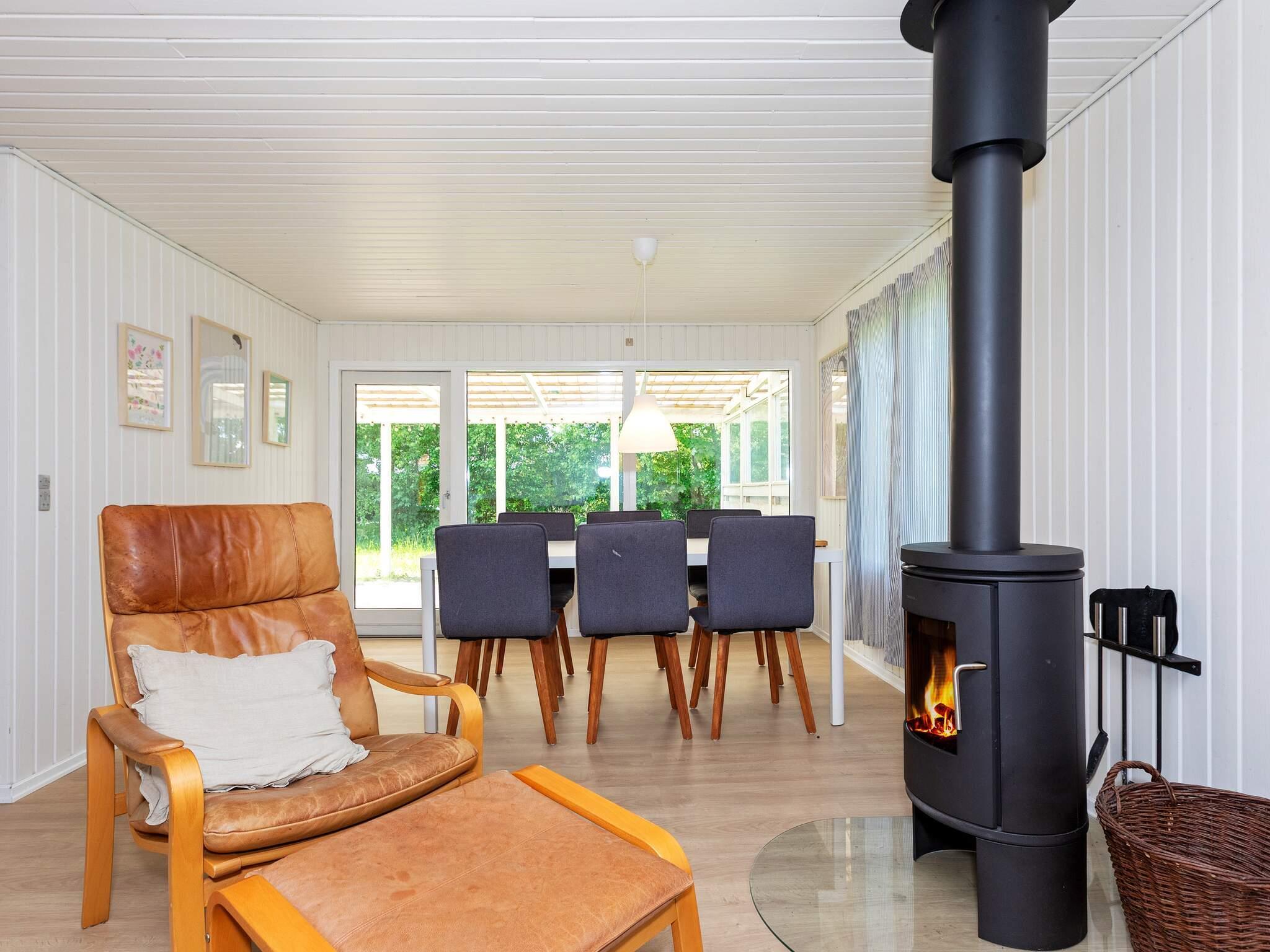 Indvendigt har feriehuset et hyggeligt alrum, der kombinerer køkken, spisestue og opholdsrum i en åben planløsning. Opholdsområdet inkluderer et tv med Chromecast, så du kan streame dit yndlingsindhold. Interiøret er lyst og gennemtænkt møbleret, hvilket skaber en varm og indbydende atmosfære for familier og små grupper.