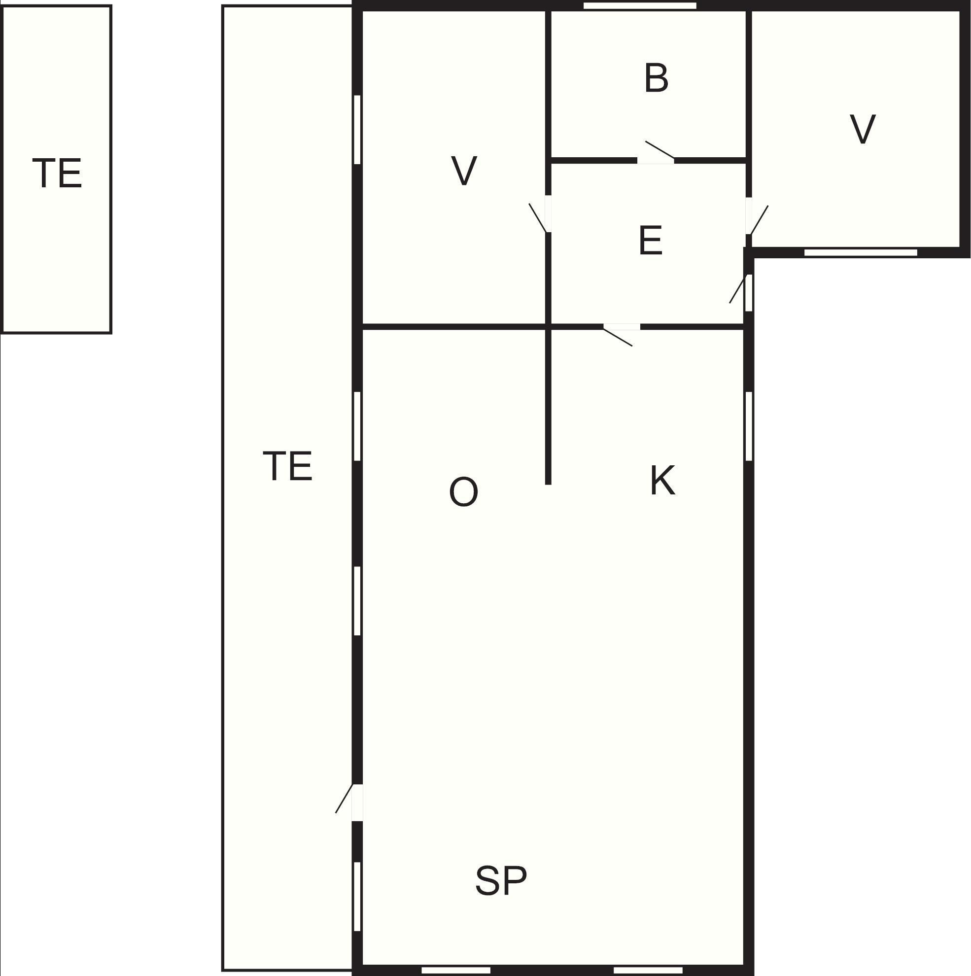 1 Alrum: Brændeovn, stereoanlæg med cd, tv, elkogepl., køle-frys, mikroovn, kaffemaskine