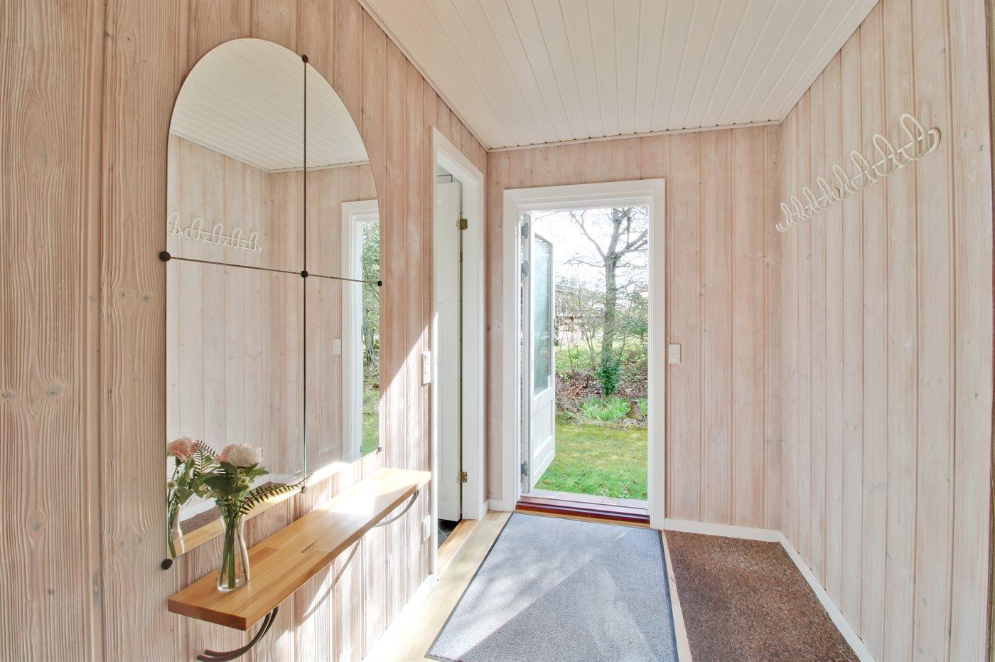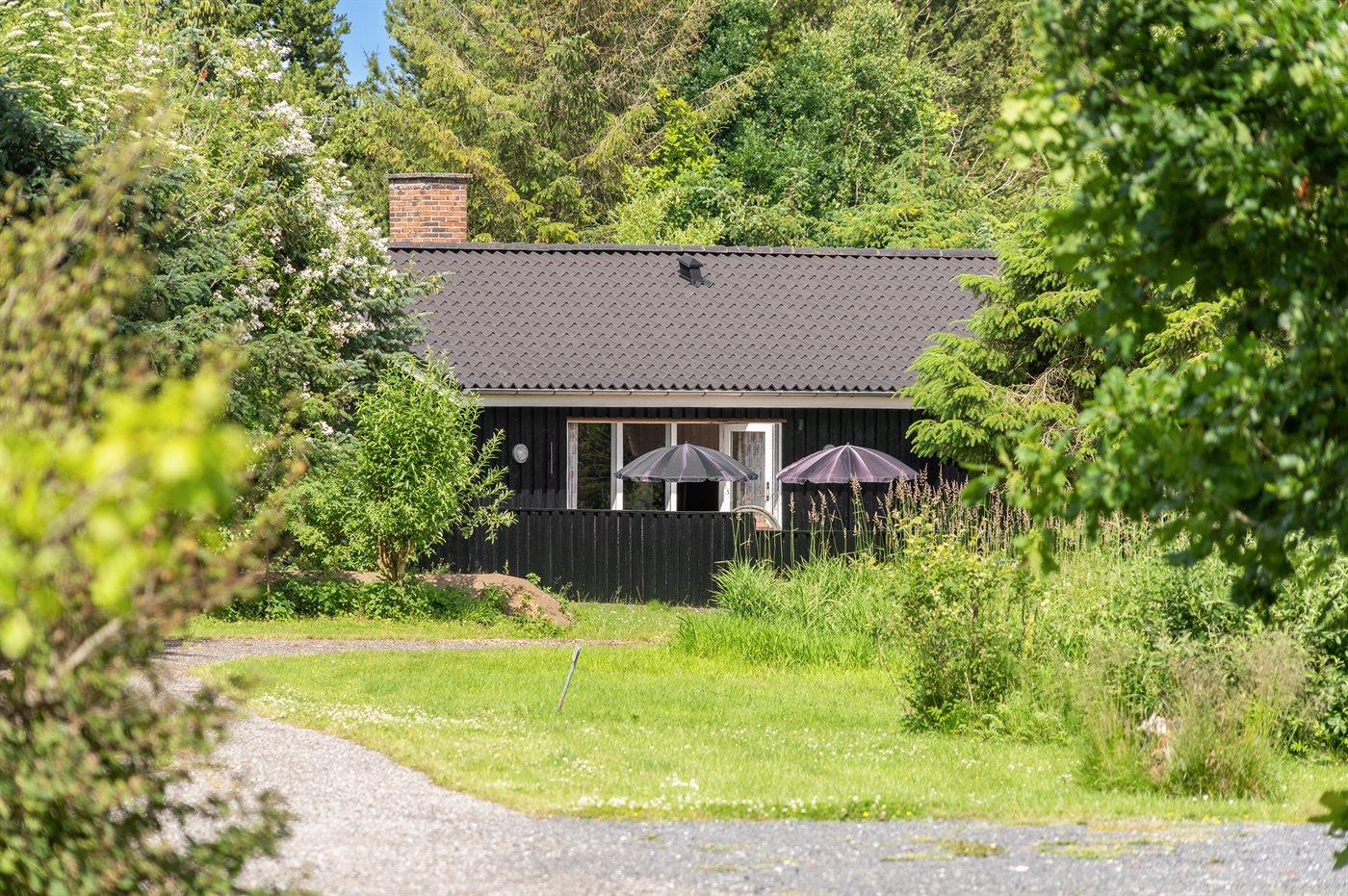 Velbeliggende og dejligt sommerhus beliggende på en helt ugenert grund, omgivet af træer.