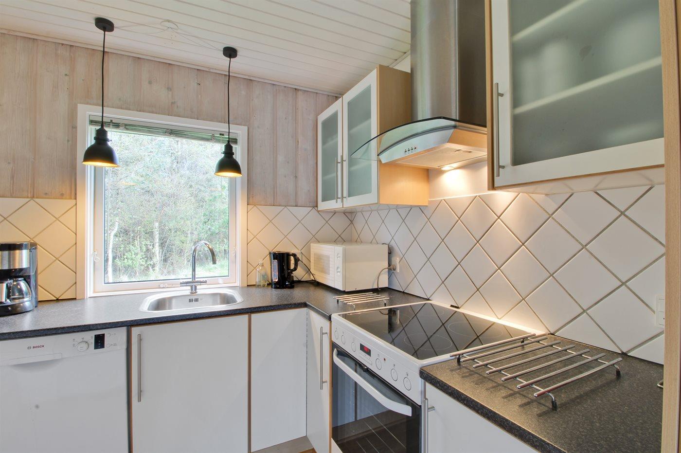 Køkkenet er udstyret med 1 køleskab. Der er 4 keramiske kogeplader, varmluftovn, mikrobølgeovn samt opvaskemaskine.