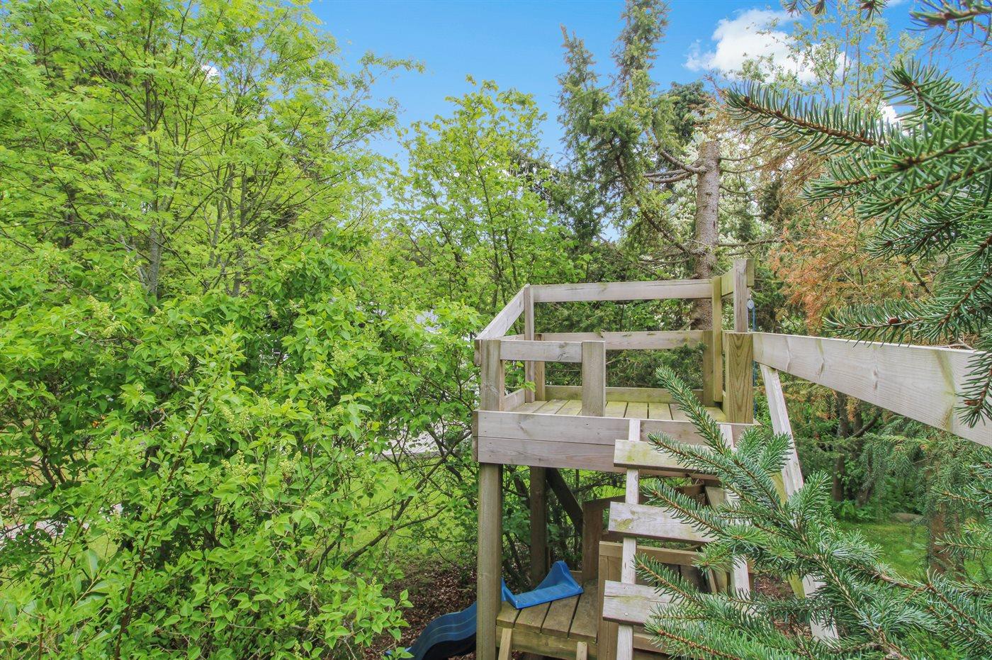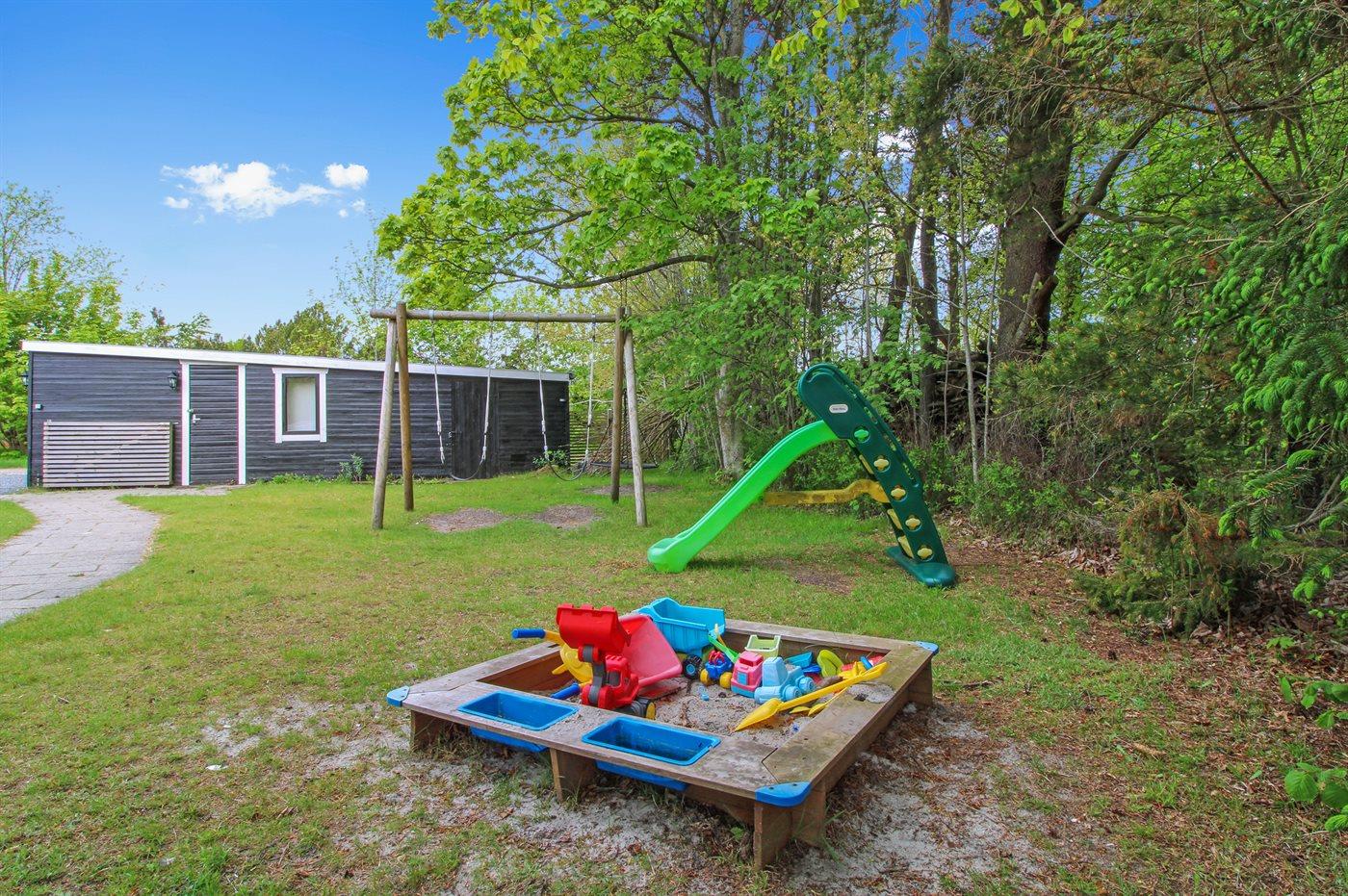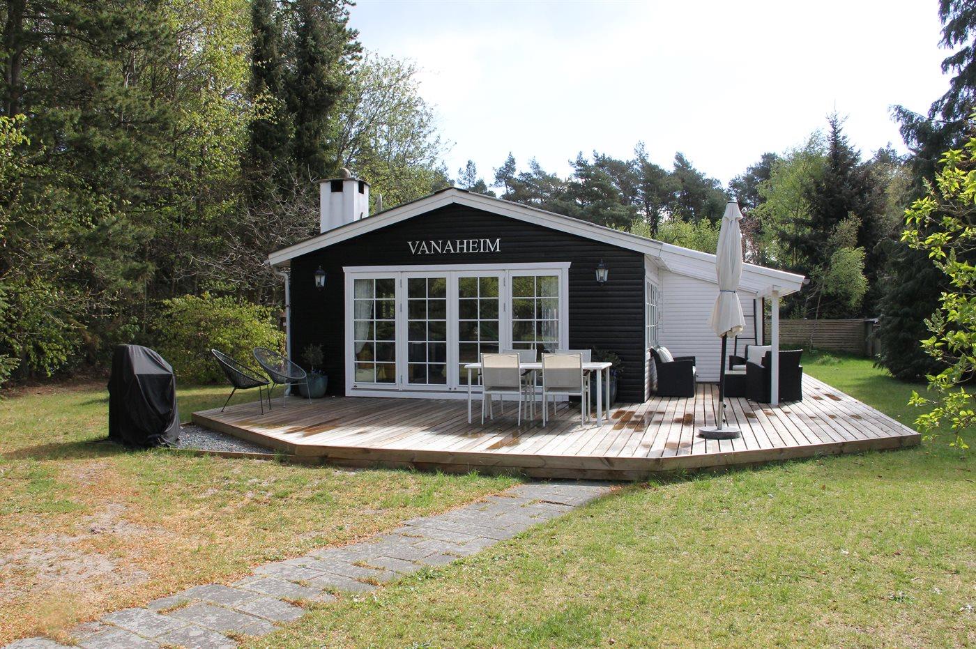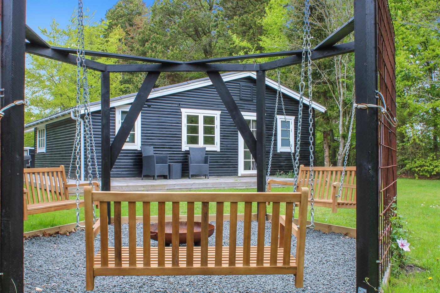 Huset er beliggende på en 1250 m2 stor havegrund, og det er tilladt at medbringe 2 husdyr, som kan lege i den lukkede have. I haven findes der desuden gynge, sandkasse, legetårn og bålsted. Der er en overdækket terrasse på 8 m2 samt 75 m2 åben terrasse. Parkering ved ferieboligen.