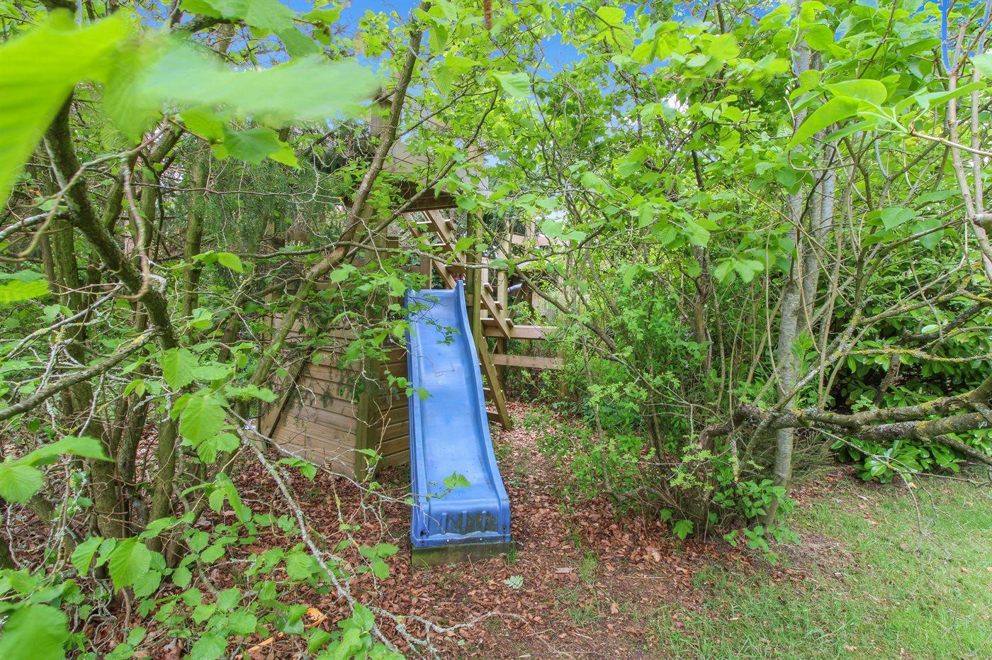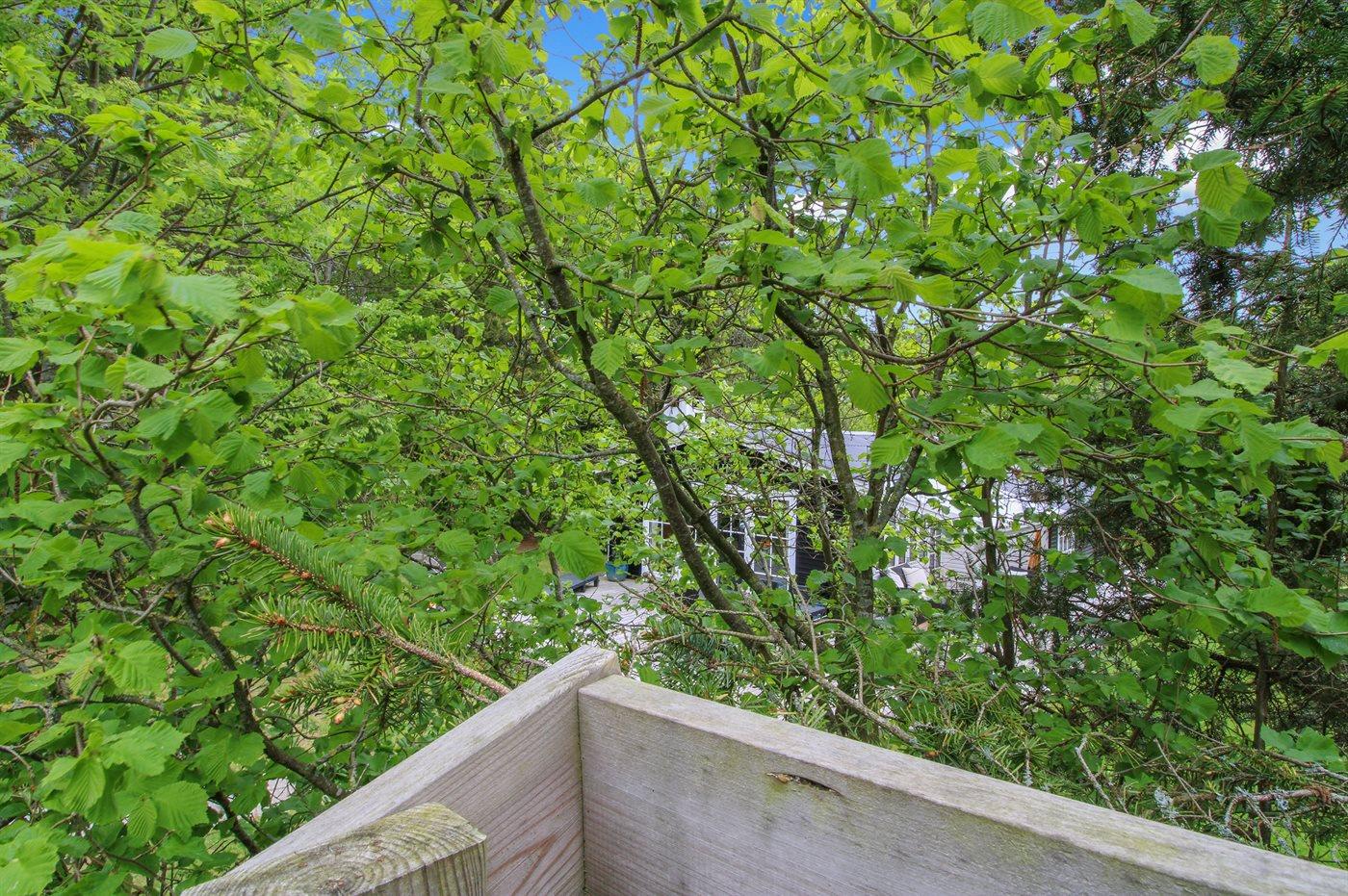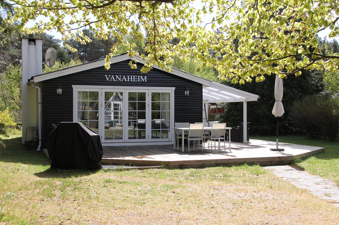 Et hyggeligt sommerhus beliggende på en dejlig grund omkranset af træer og bevoksning i et naturskønt område nær skov og børnevenlig sandstrand.