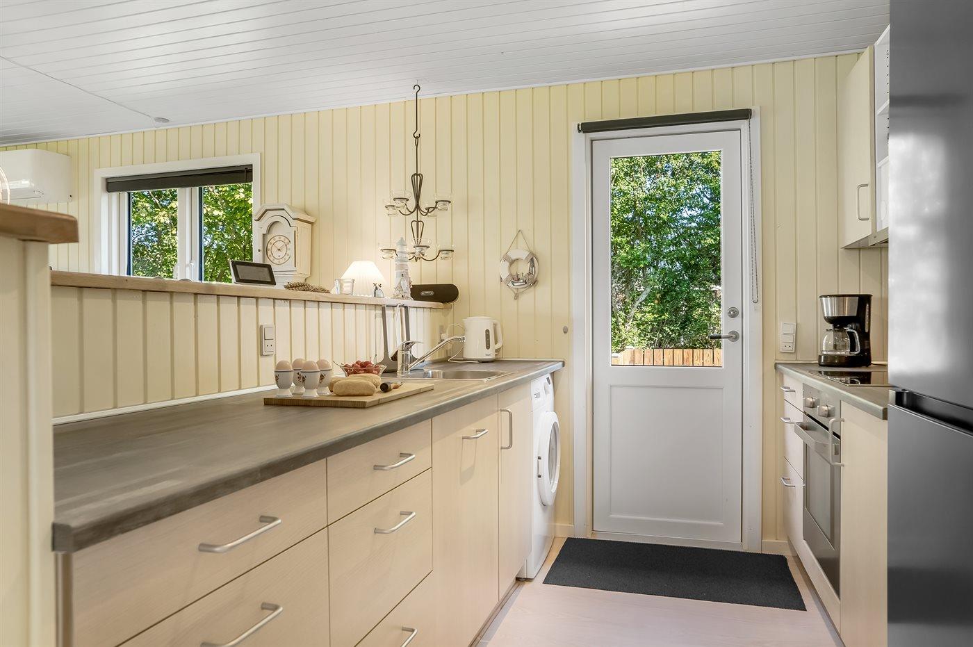 Køkkenet er udstyret med 1 køleskab. Der er 4 keramiske kogeplader, varmluftovn, mikrobølgeovn samt opvaskemaskine.